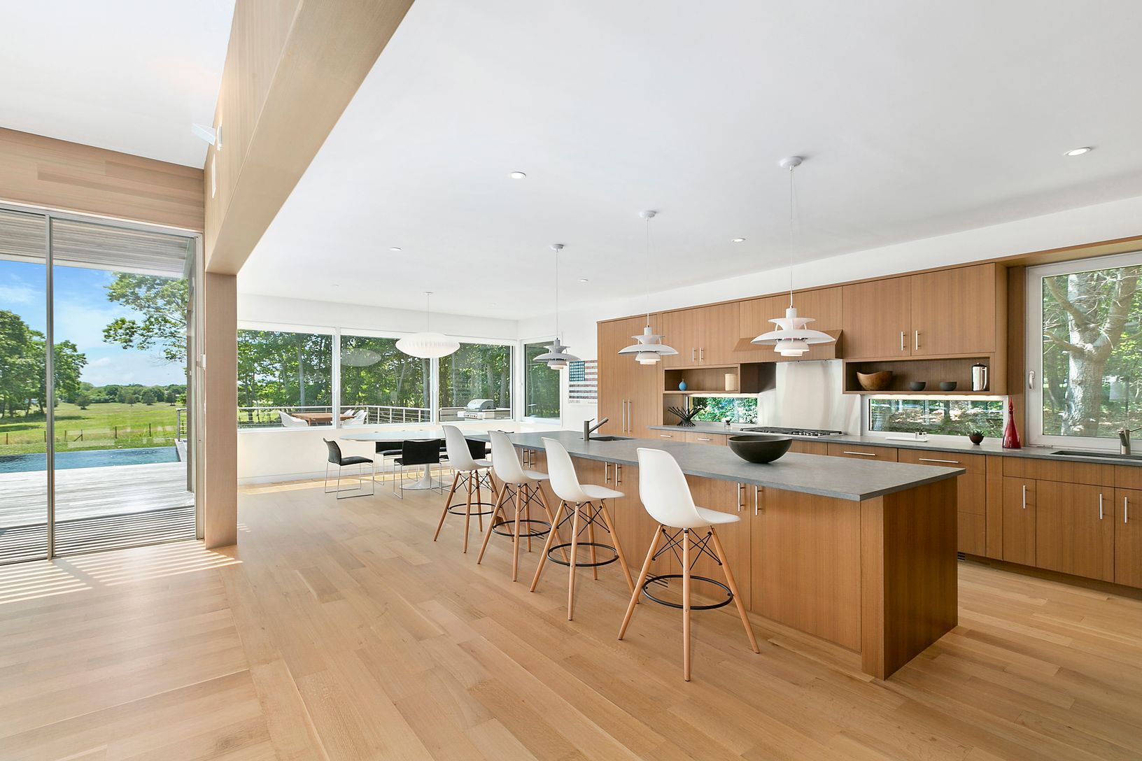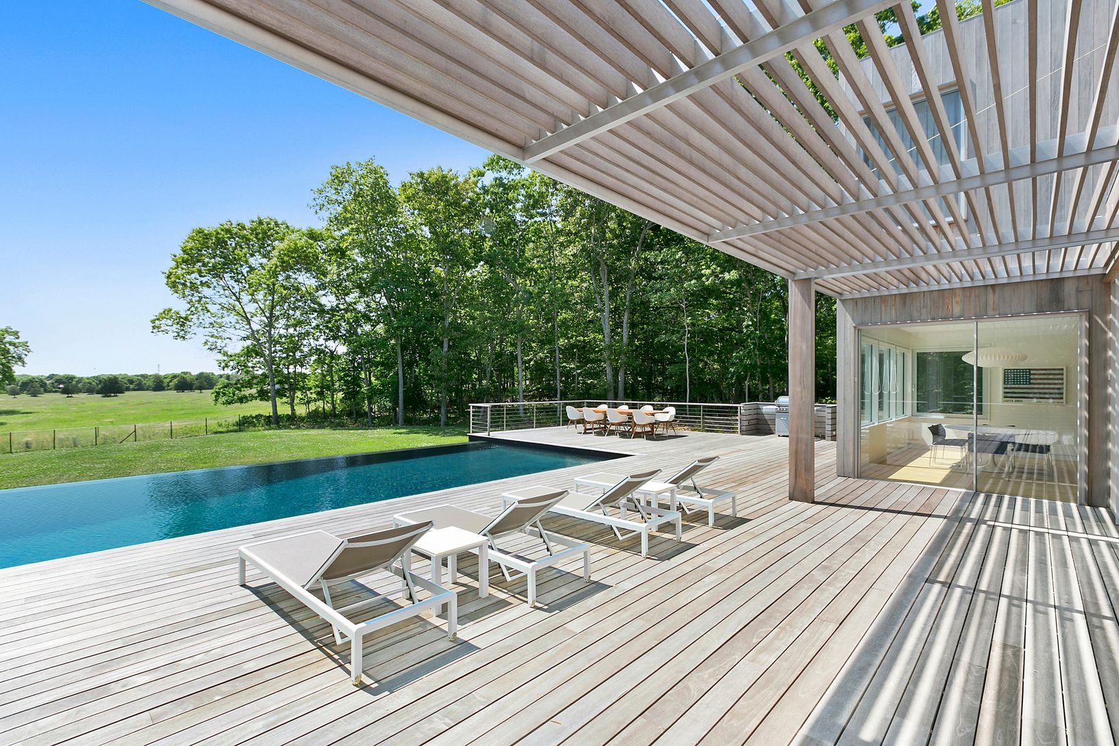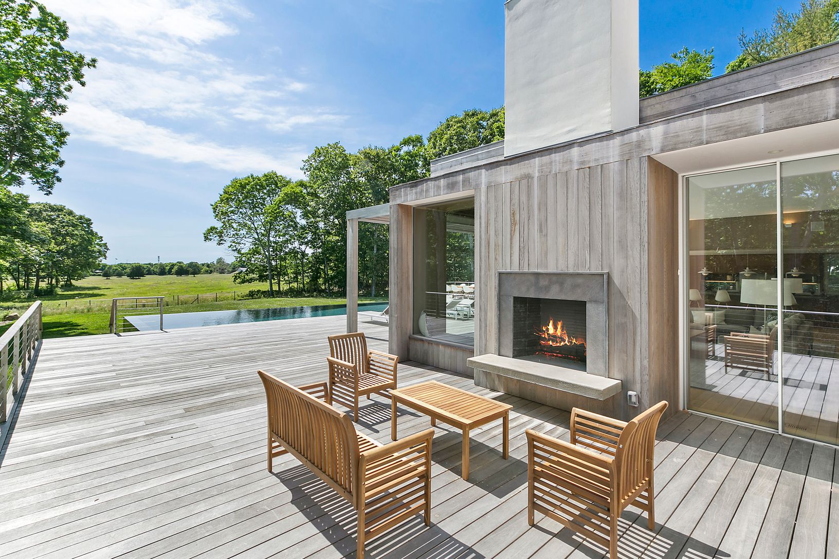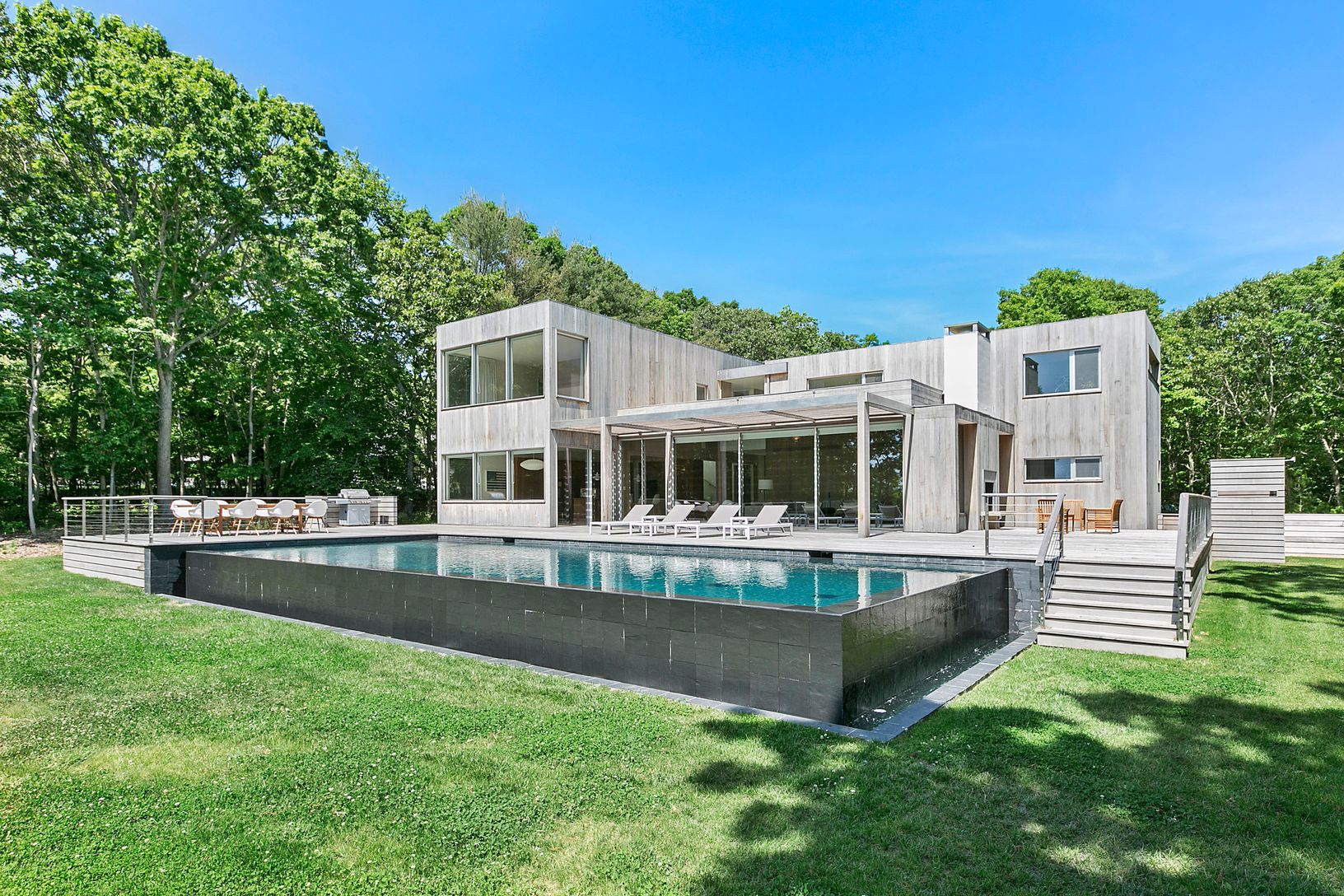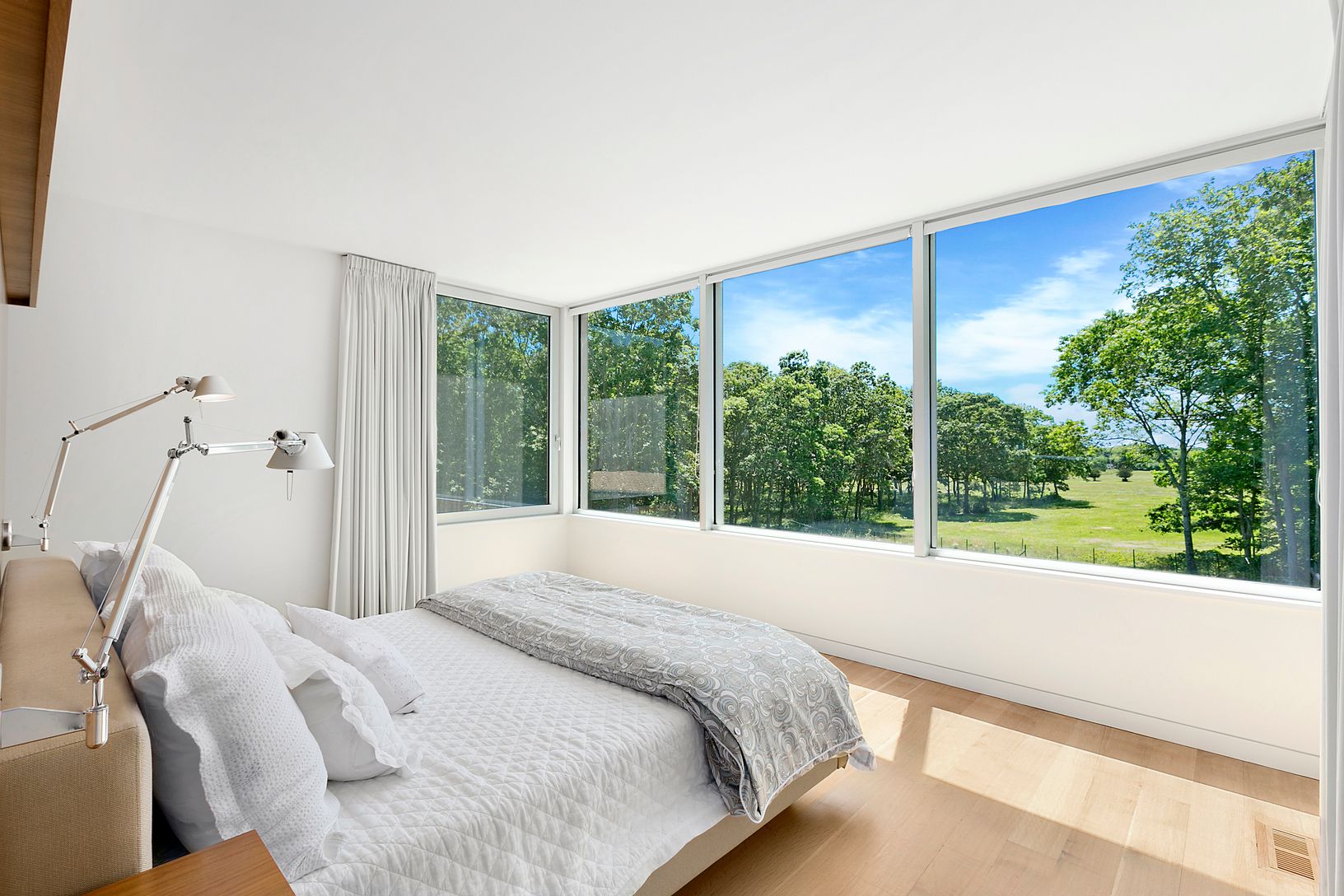 Amagansett Village Fringe. New modern completed in 2017. Designed by noted architect Andrew Pollock, set on 1.4+/- tranquil acres and featuring endless sunset views onto an open field. Extensive use of glass walls and oversized windows allow the Hamptons light to flow throughout. Cedar walls and wide plank quarter sawn white oak floors add warmth to the spacious 6,500+/- sq. ft. interior, offering 7 bedrooms and 6.5 baths. A magnificent living