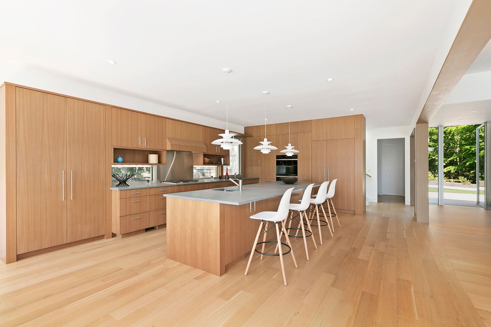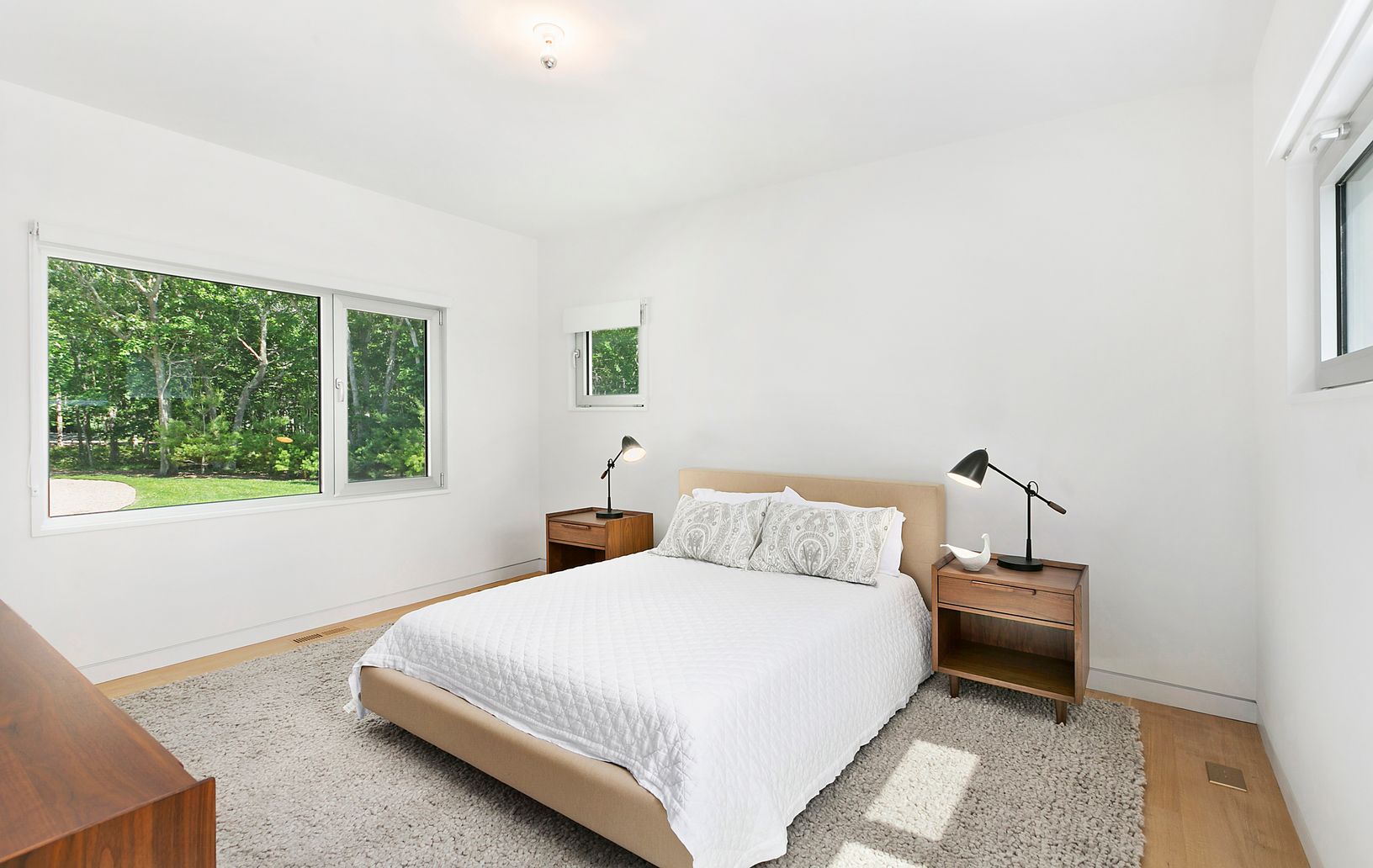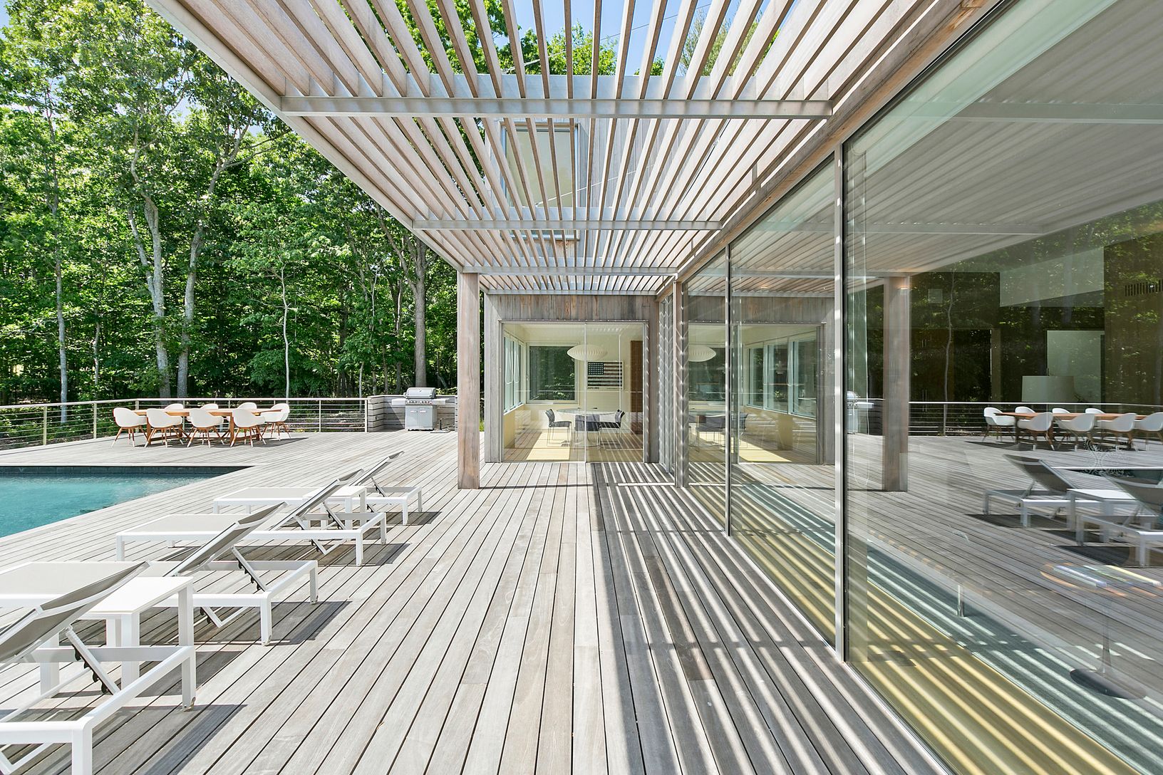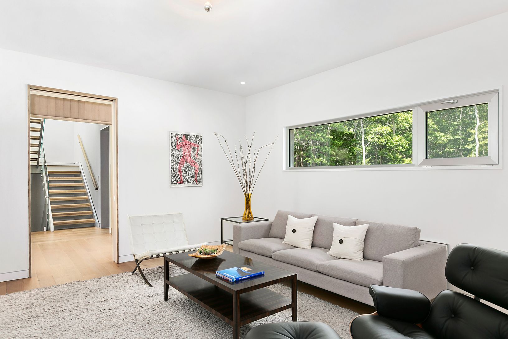 Amagansett Village Fringe. New modern completed in 2017. Designed by noted architect Andrew Pollock, set on 1.4+/- tranquil acres and featuring endless sunset views onto an open field. Extensive use of glass walls and oversized windows allow the Hamptons light to flow throughout. Cedar walls and wide plank quarter sawn white oak floors add warmth to the spacious 6,500+/- sq. ft. interior, offering 7 bedrooms and 6.5 baths. A magnificent living