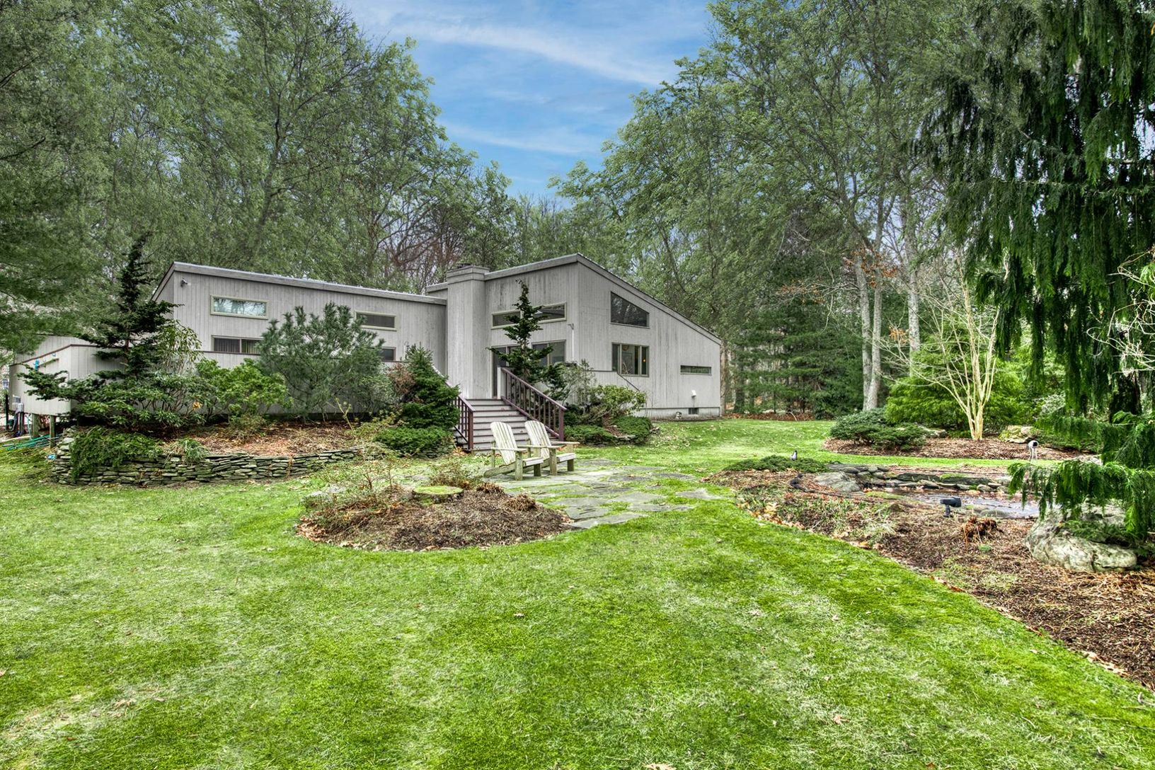 Sleek and spacious, this very private home is located on a quiet and desirable cul-de-sac where one house is more interesting than the next! You will be instantly drawn into the luscious foliage on the .75 acre private lot. Mature and thoughtful landscaping and a beautiful Koi pond add to the serenity of this beautiful property . The heated pool with a private and substantial deck is perfect for fun and entertaining. Walk inside to a wonde