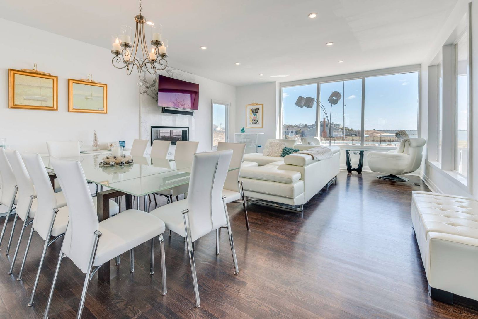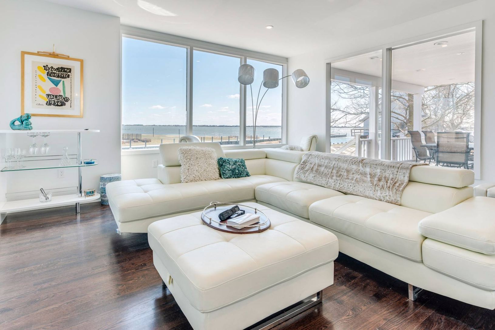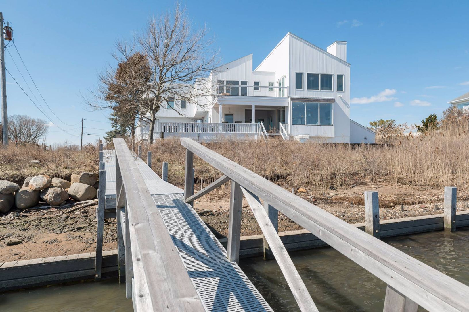 Bright, beautiful, white water front contemporary featuring 5,000+/- square feet of living space and water views from almost every room. Home features include an open floor plan featuring a living room with fireplace, gourmet kitchen, dining room, and a beautiful master suite. this home also has a dock for boating. Great rental!