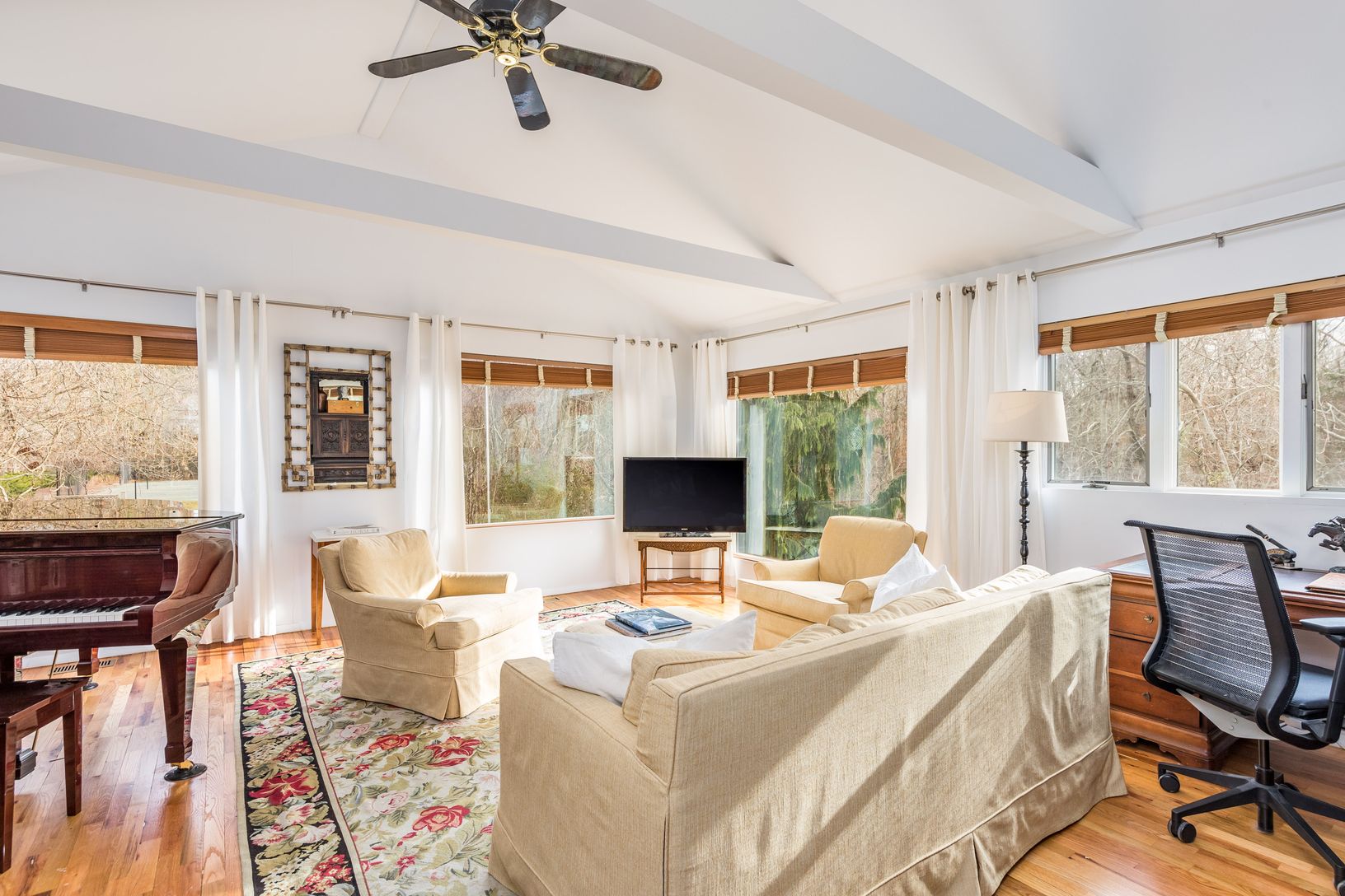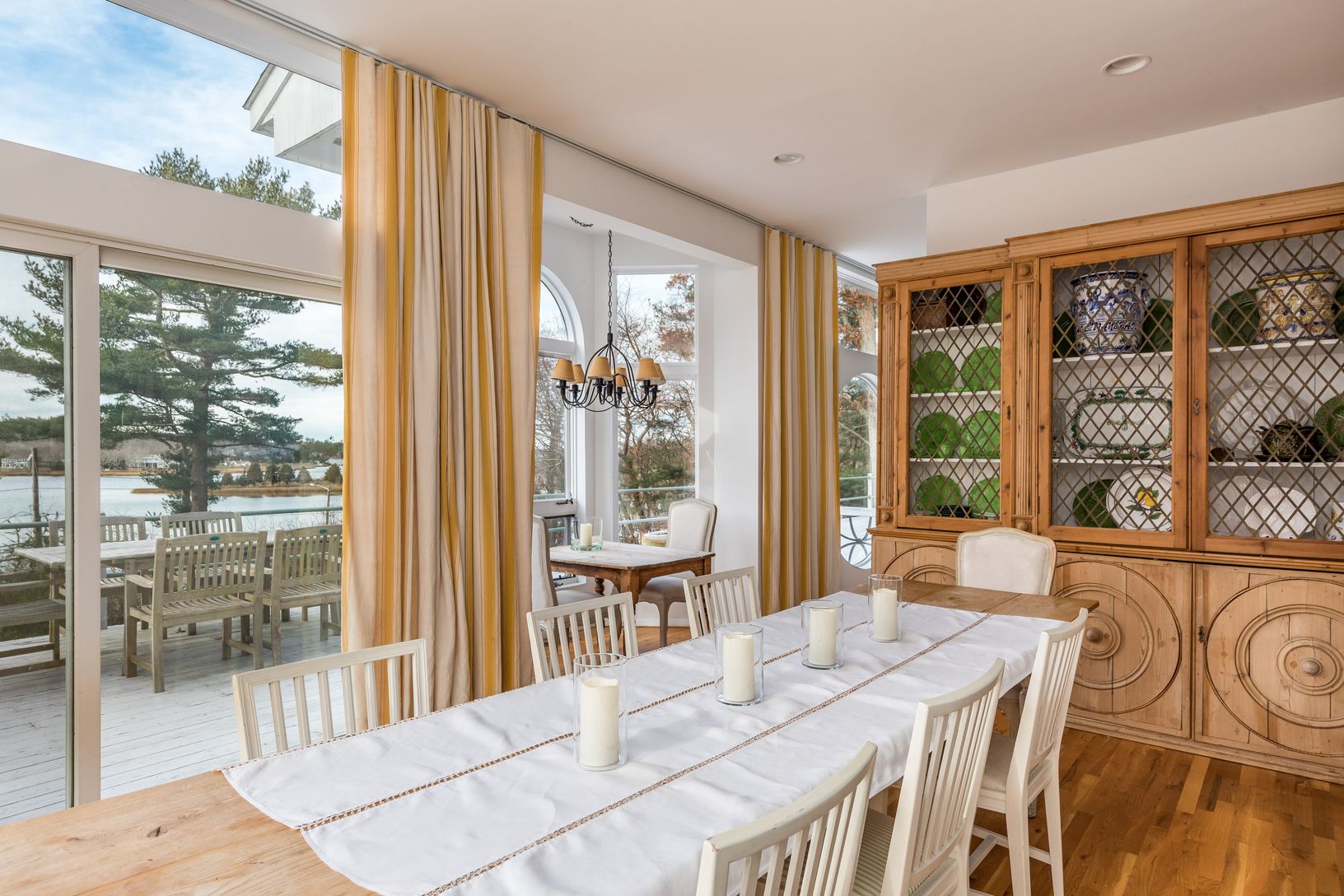 four bathrooms and is set on 1.8 acres. The home is conveniently located minutes to East Hampton Village and Amagansett as well as bay beaches. Relax by the pool or enjoy use of the Tennis court. Amazing views are seen through out the entire home. Beautiful sunset views facing westerly over Three Mile Harbor Marina. Available for July.