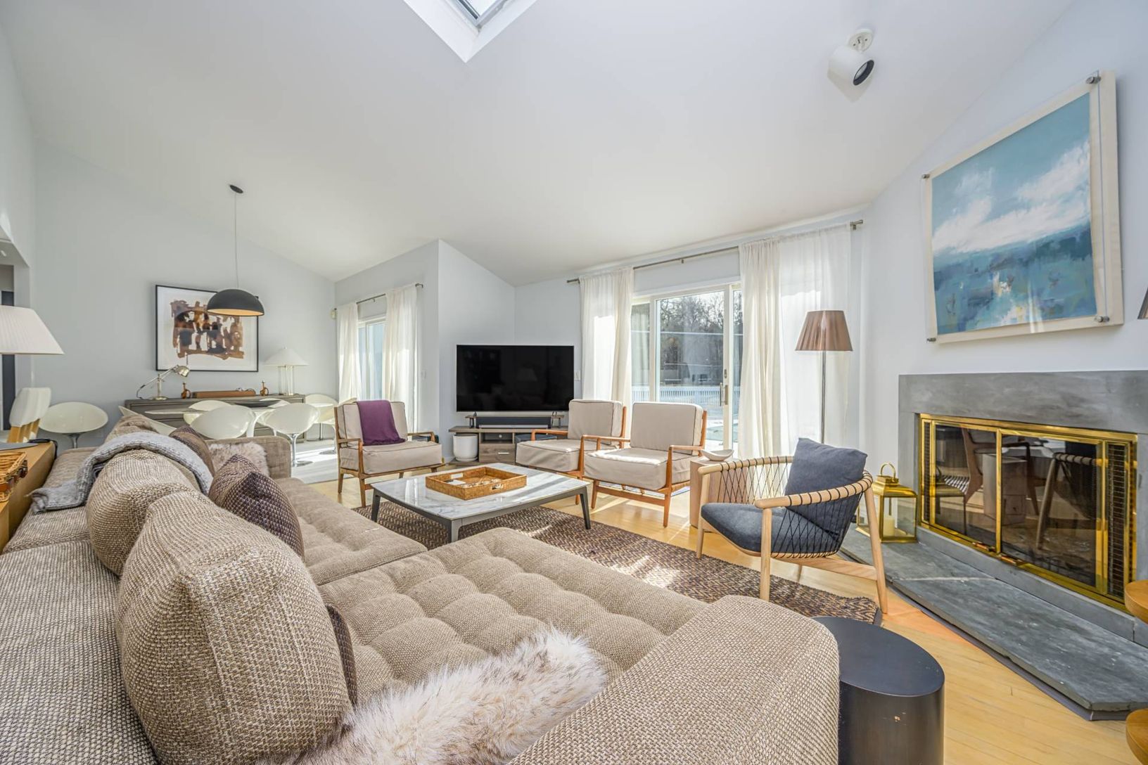 Set on just under an acre of beautifully landscaped grounds, this newly furnished 4-bedroom home is the perfect Hamptons getaway. Designed for comfort and entertaining, it features an open-concept kitchen and dining area, a living room with soaring cathedral ceilings, and a cozy fireplace for summer nights in. The first-floor primary and two additional bedrooms share a full bath, while the upstairs fourth bedroom provides extra space for guest