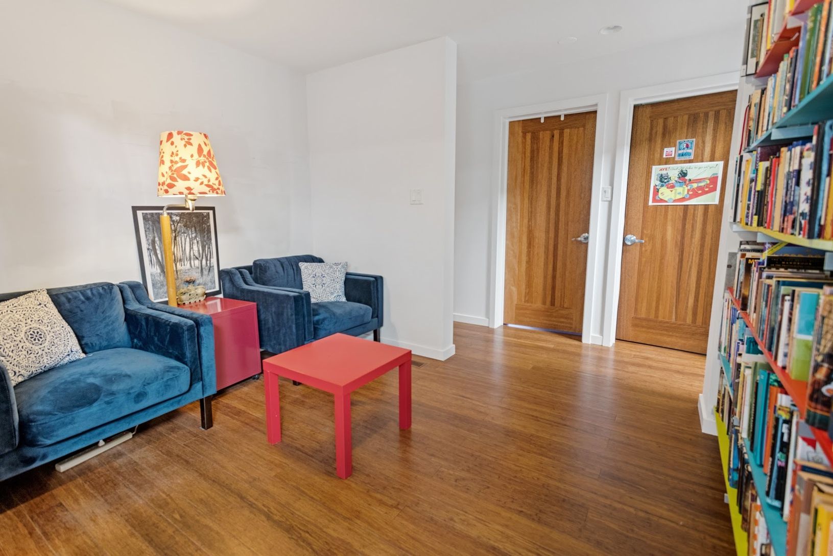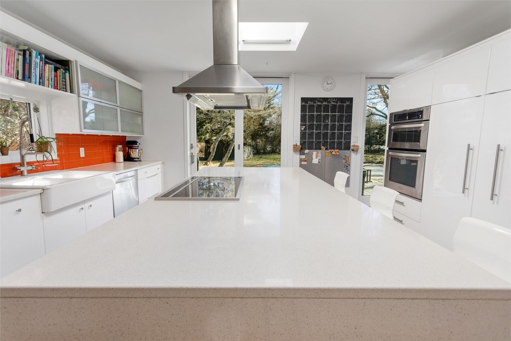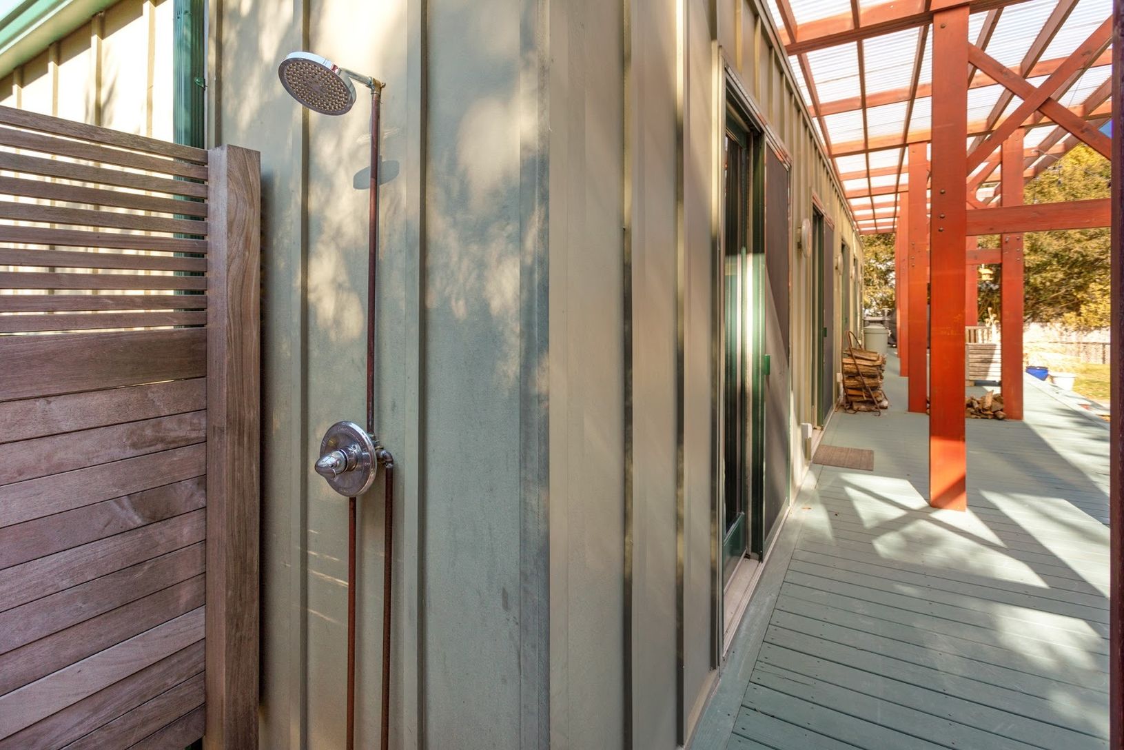 a geothermal system plus solar panels in the pergolas and roof provide heating for the pool. Inside is open and clean with enclosed sliding door cabinetry for closets to maximize open space. Partiti