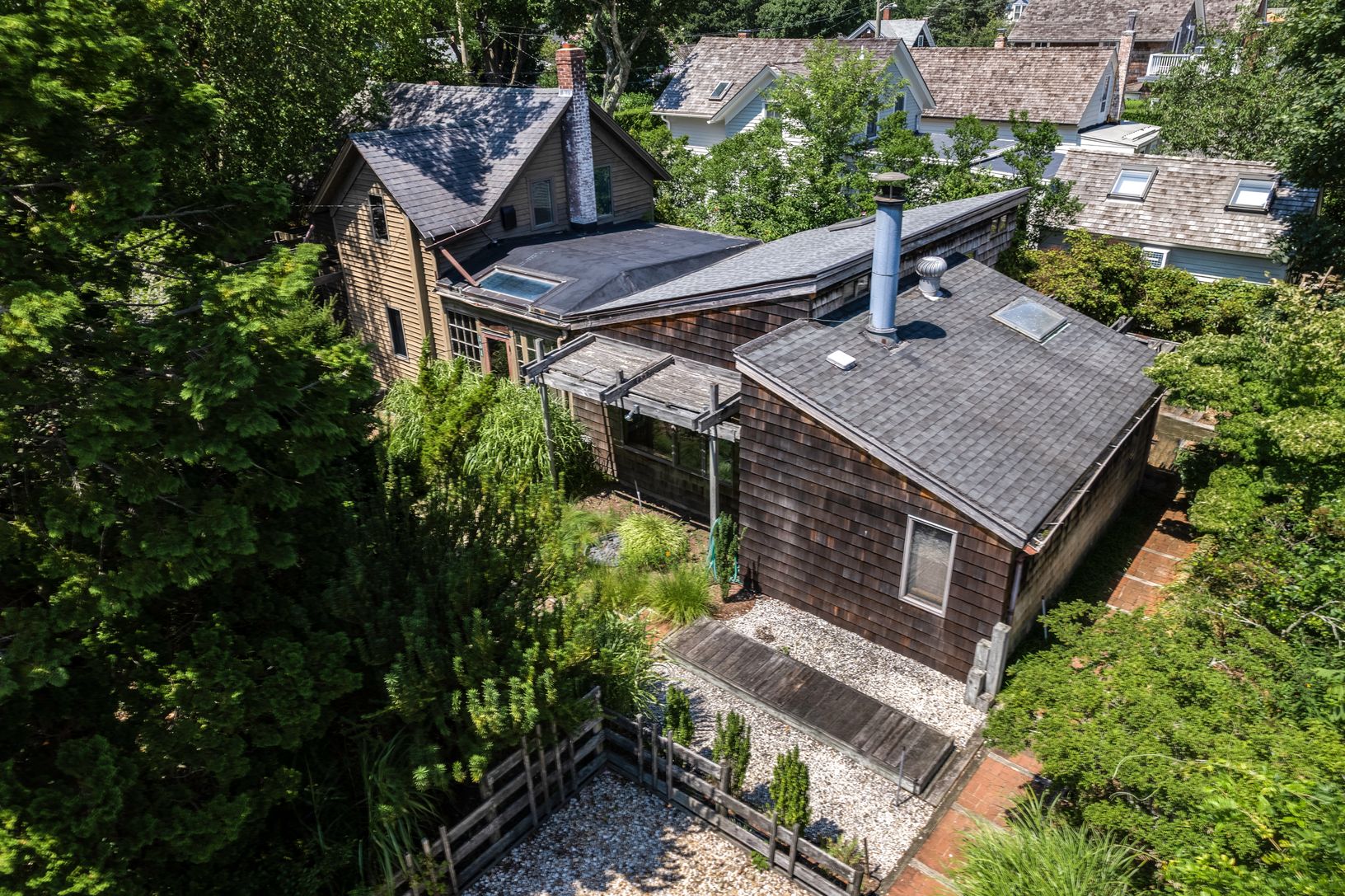 Sited in the historic district of Sag Harbor Village, this century-old factory workers' house was transformed years ago. Most recently it was stewarded by a creative and passionate gardener and the property was transformed into an oasis that beautifully complemented the architectural spin that is what one sees today. Fondly referred to by many as the \"Berkeley House,\" it calls into focus the wonderful, casual architectural styles evident in