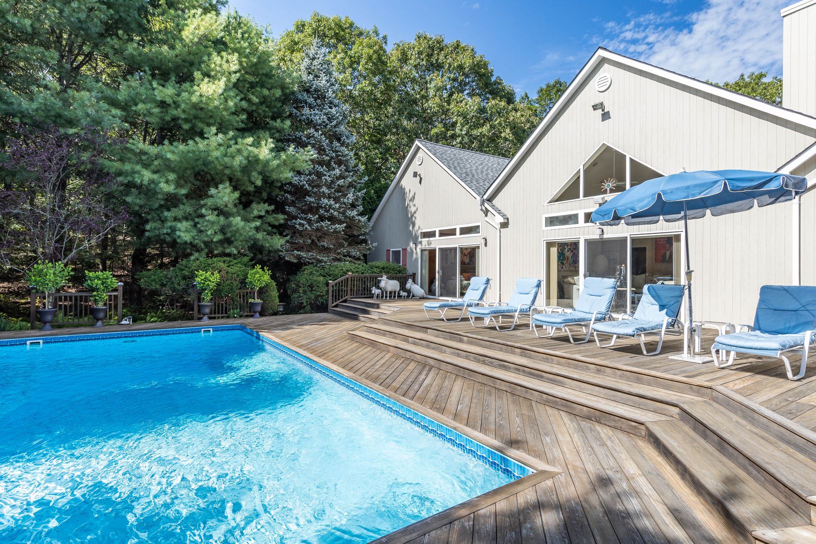 Set amongst the towering pines down a beautifully landscaped private drive, and just a few minutes' drive from both Sag Harbor and East Hampton Villages is this contemporary haven. With over 6500 square feet of living area spread over 3 levels featuring bright and airy open-concept spaces complemented by oversized outdoor entertaining spaces, this fashionably designed and impeccably well maintained home was built with an eye towards modern liv