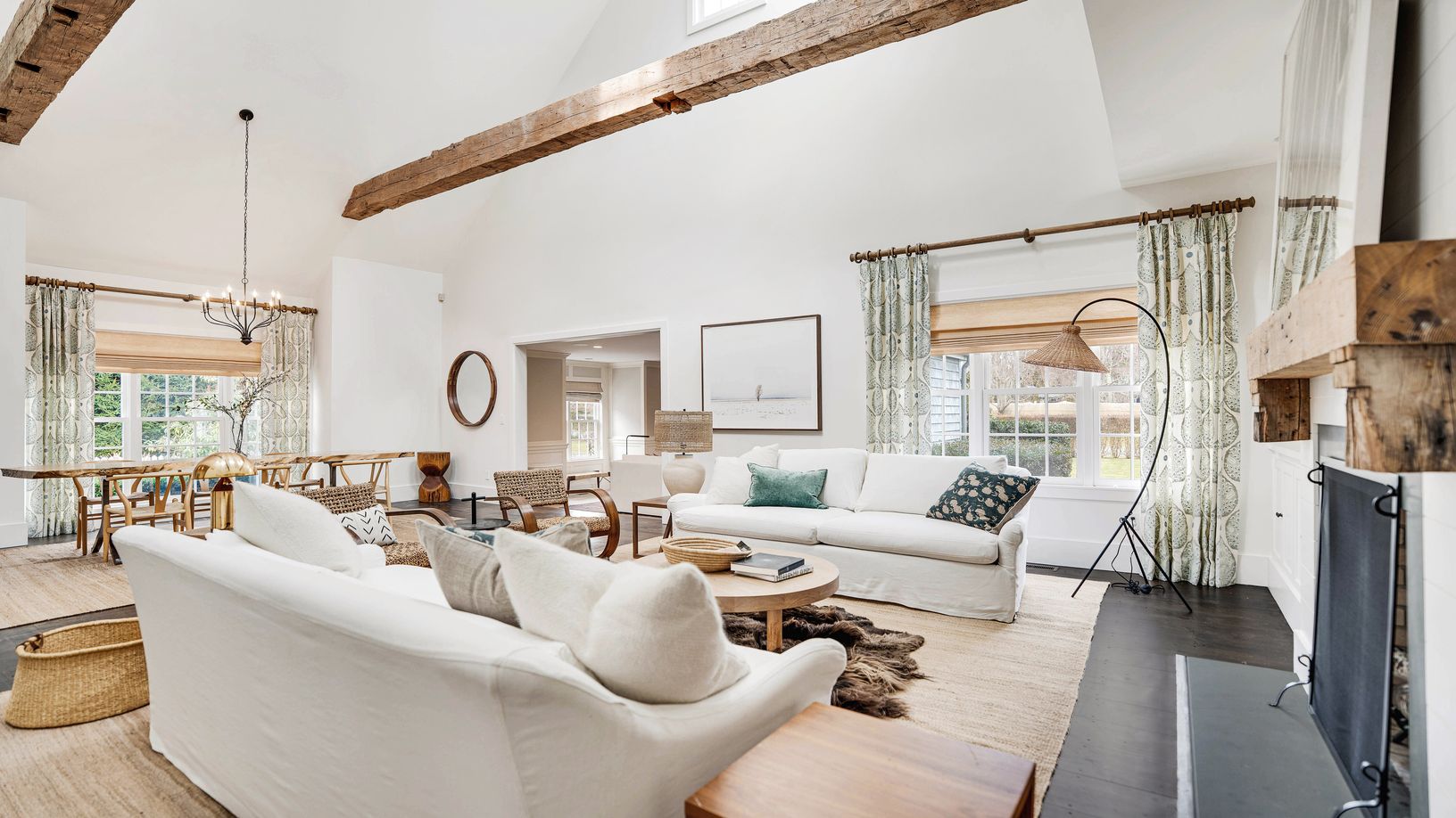 This timeless traditional residence, located south of the highway in Bridgehampton, is set on 1.2 private manicured acres including large outdoor patio with built-in grill, heated Gunite swimming pool, pool house, bocce court and detached two-car garage. The interiors blend spacious and elegant living spaces centered around a dramatic cathedral ceiling family room, which connects to a media room, professional kitchen, large sunroom and first