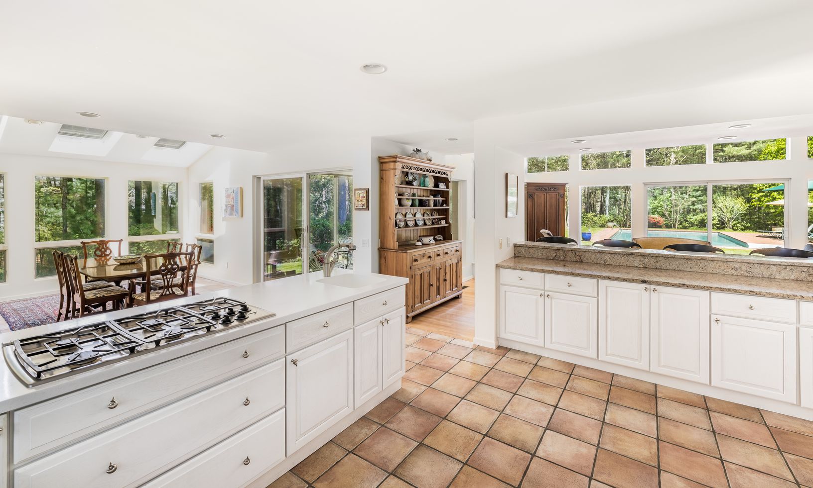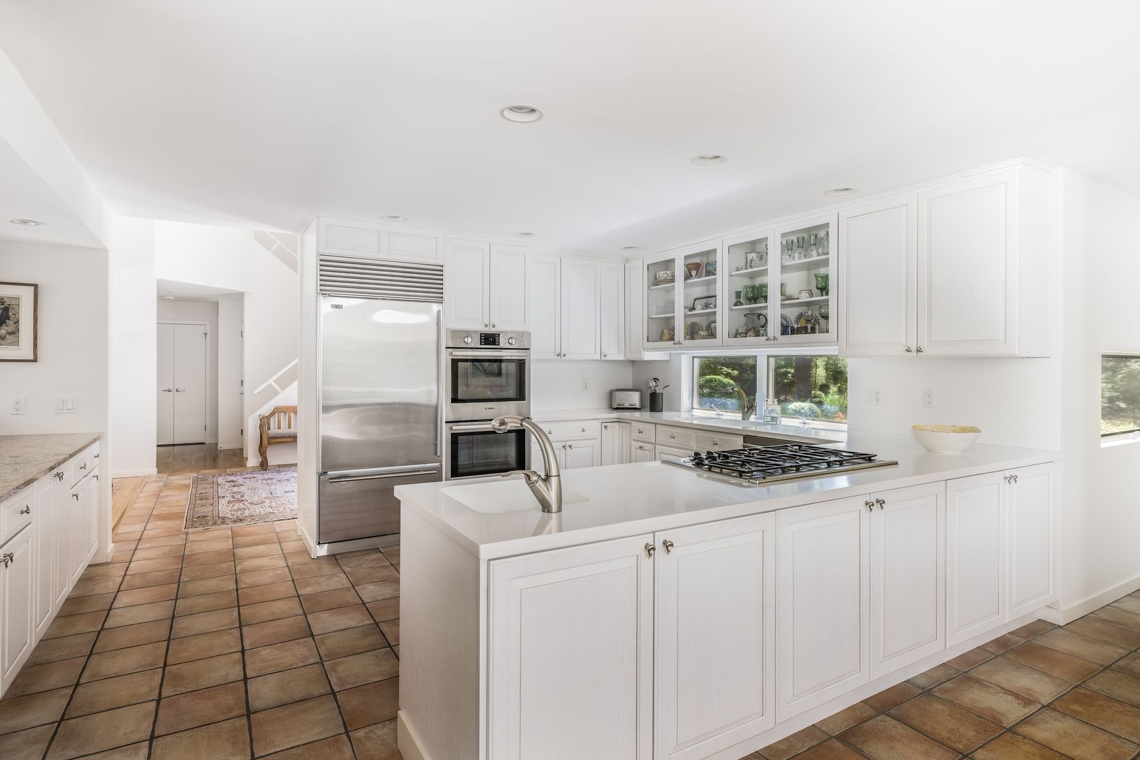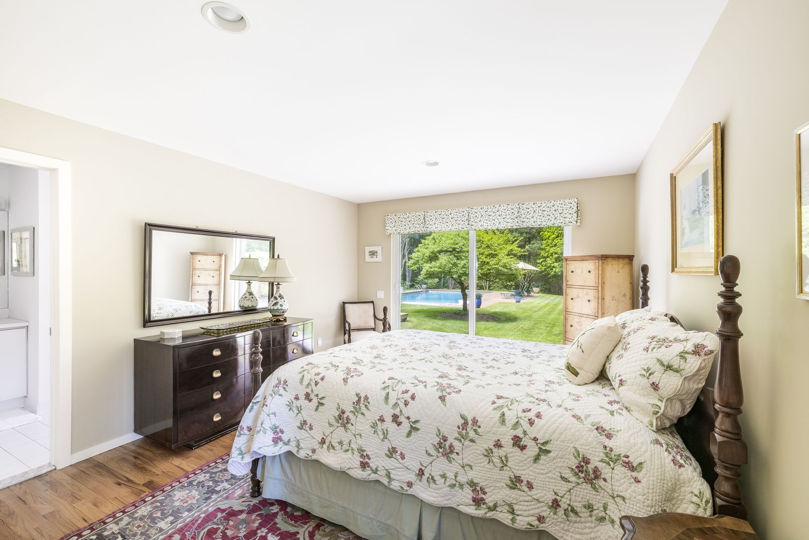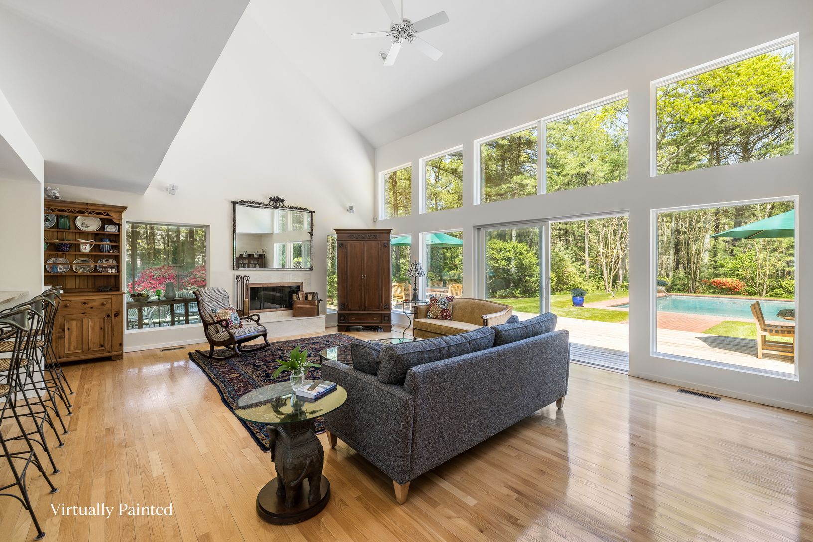 Down a long winding driveway and sited on nearly two meticulously landscaped acres lies this pristine contemporary home. Offering 4 bedrooms and 3.5 bathrooms, the home is flooded with natural light and showcases soaring ceilings and an open concept living space. The spacious kitchen showcases Sub-Zero, Thermador, and Bosch appliances, and opens to the sun lit dining space with glass sliders to the screened in porch. The ensuite junior primary