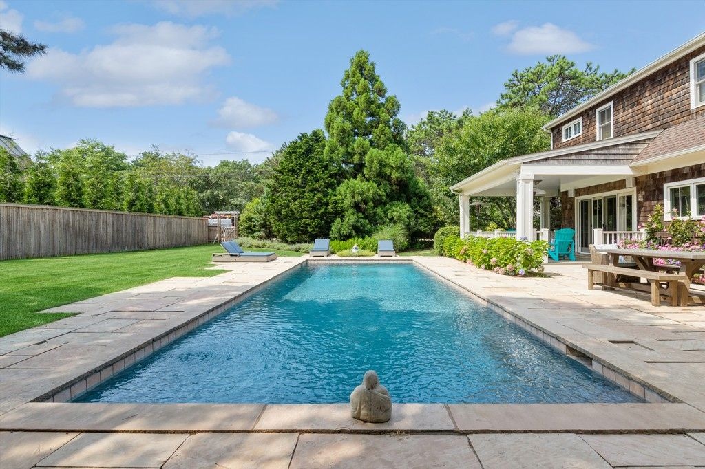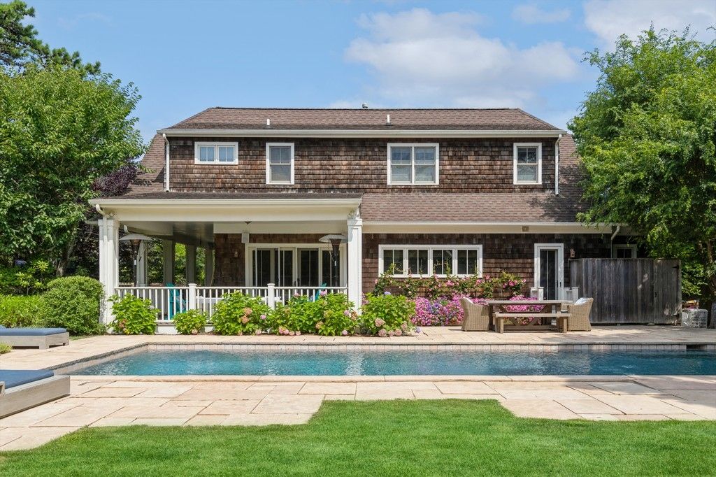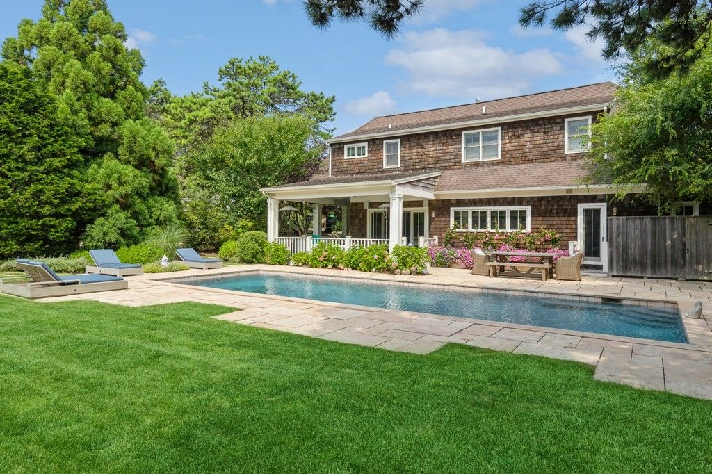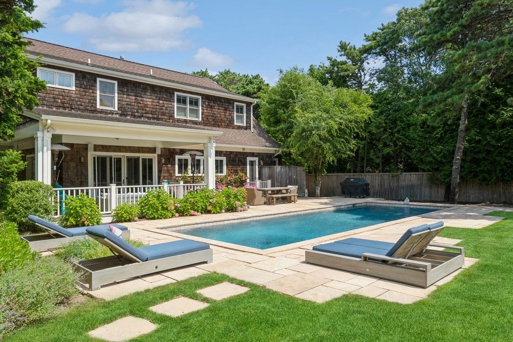 You can enjoy any season in this tastefully furnished house located in the desirable Amagansett Dunes. The house is light and airy, a living room with fireplace; a gourmet kitchen that flows into the dining area overlooks the gardens and pool. There are four bedrooms, (two en-suite), three and a half baths, master with fireplace. The house features private covered porches overlooking lush landscaping surrounding the pool, wine cooler and an o
