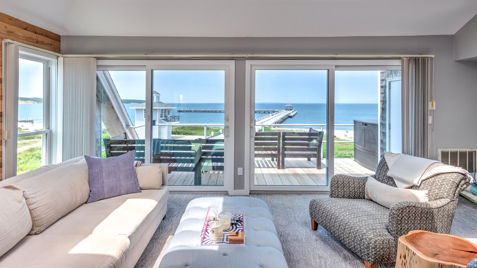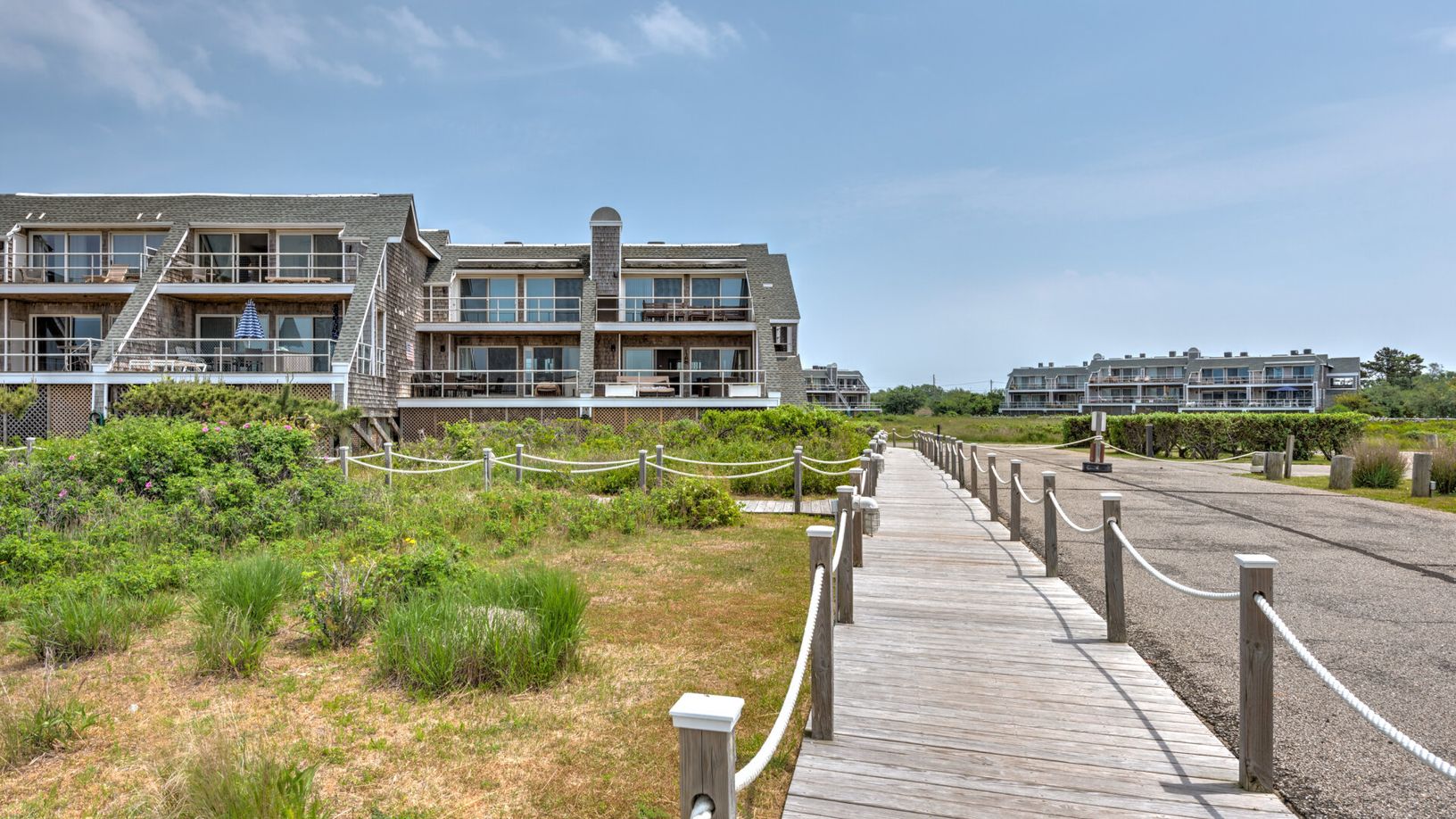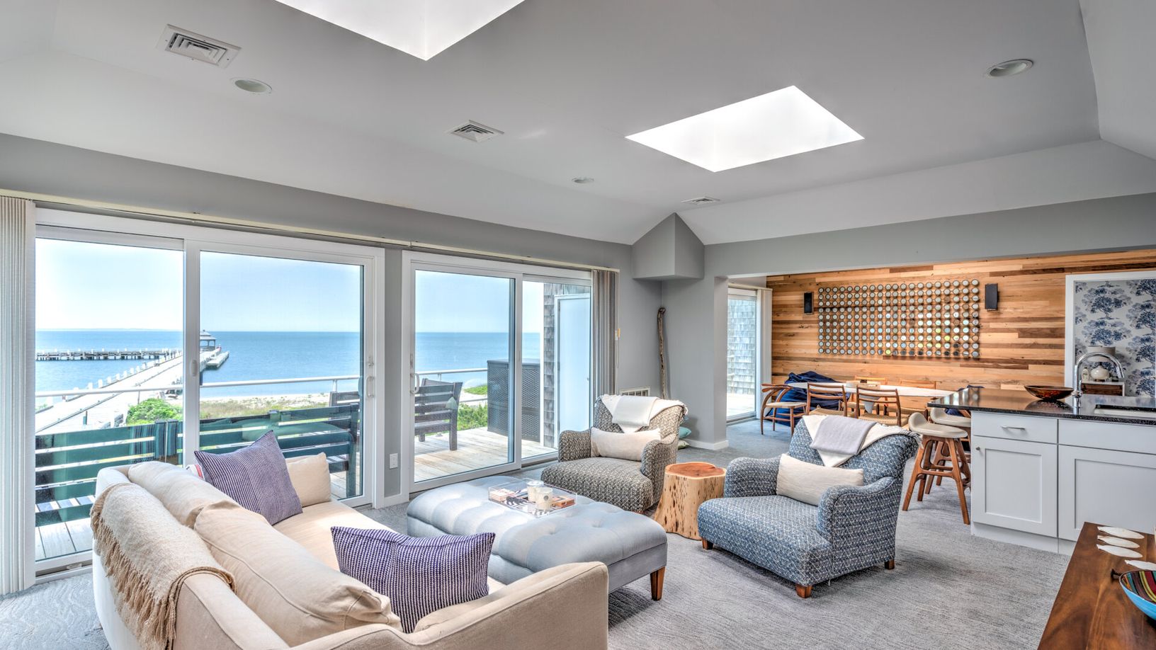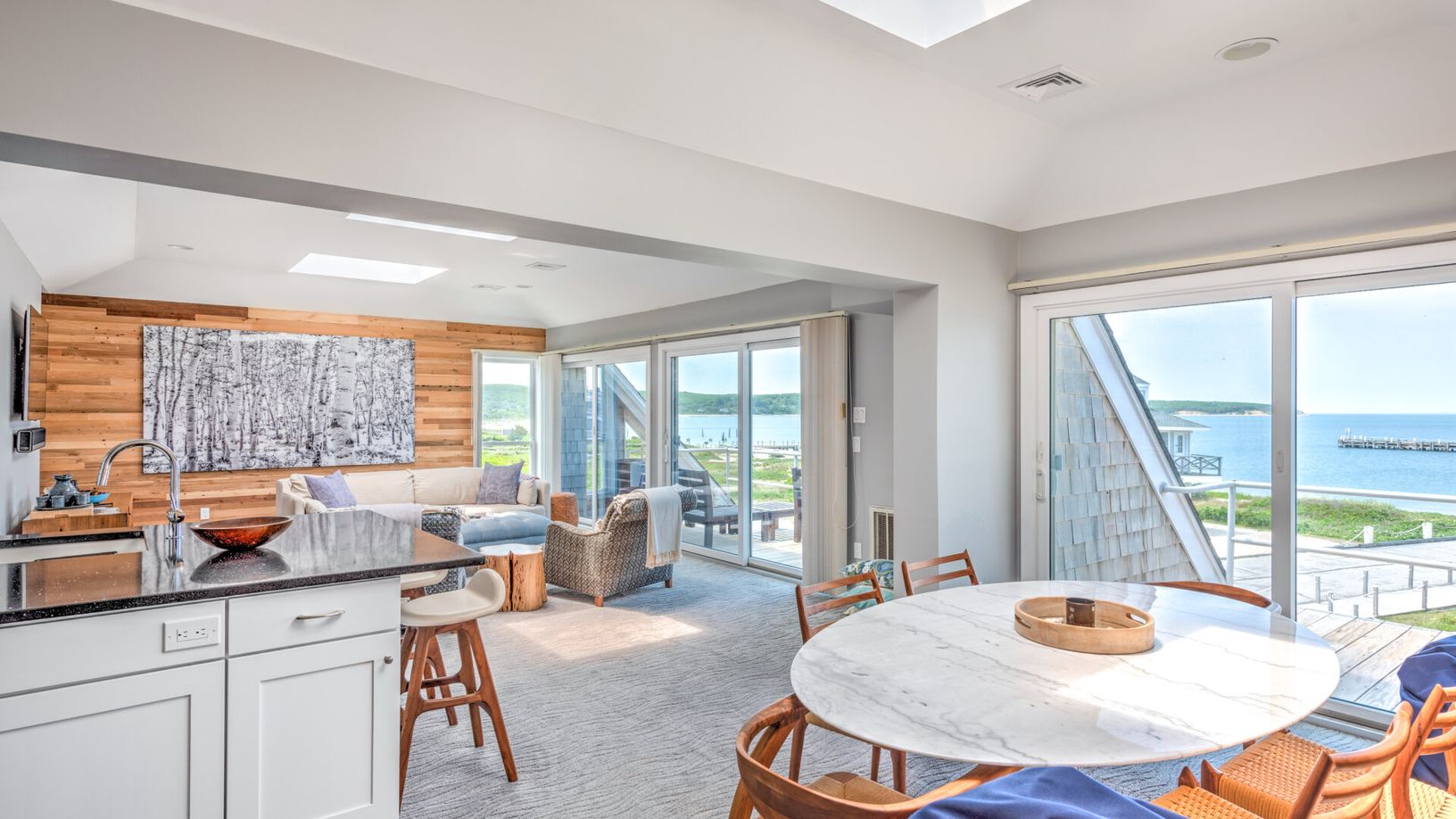 Escape to this spacious Montauk condo, ideally situated with private beach access to Fort Pond Bay and just minutes from the vibrant Ditch Plains Beach and the town center. This stunning property boasts an open floor plan that showcases breathtaking water views. Designed for a maximum occupancy of six, this three-bedroom, two-bathroom haven features expansive and brightly lit living spaces with multiple sitting and dining areas, creating the p