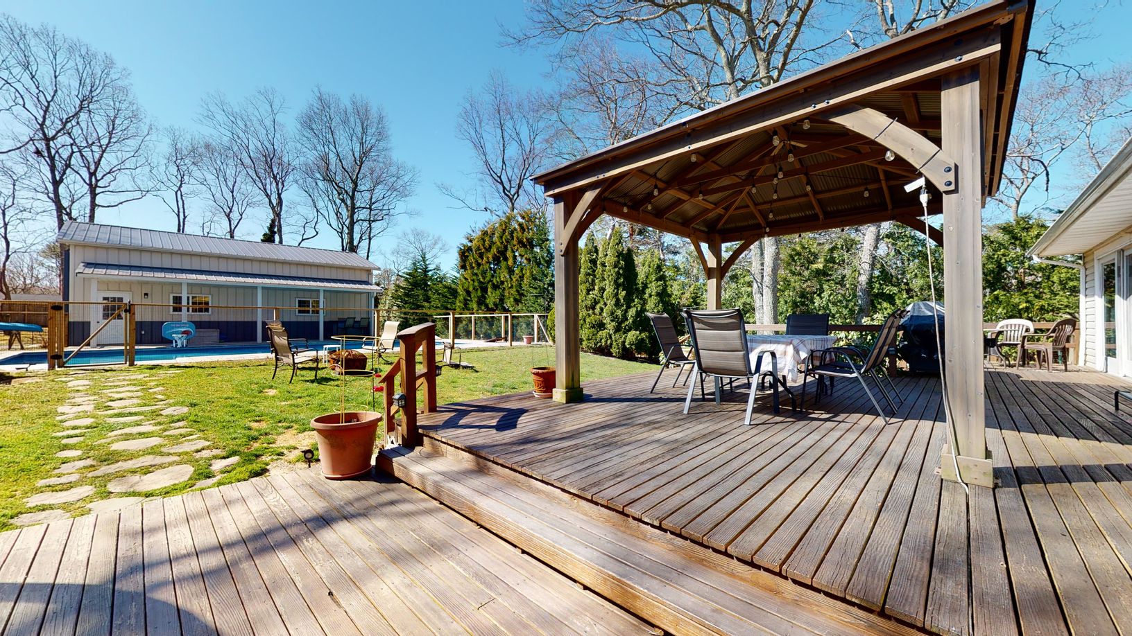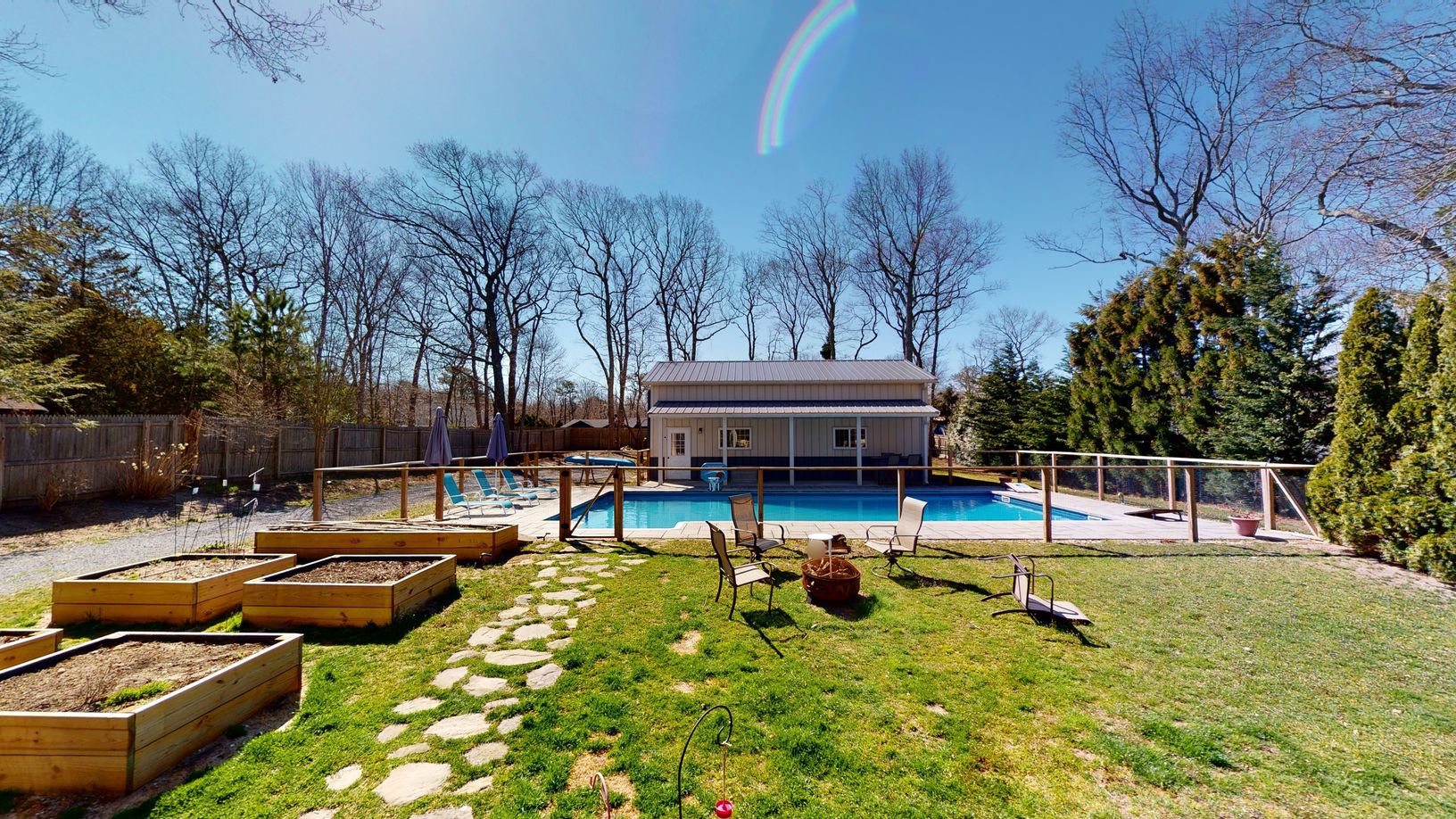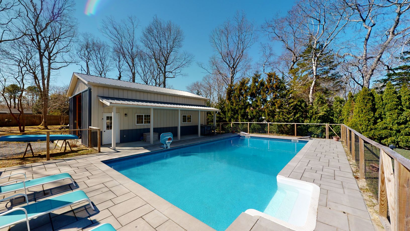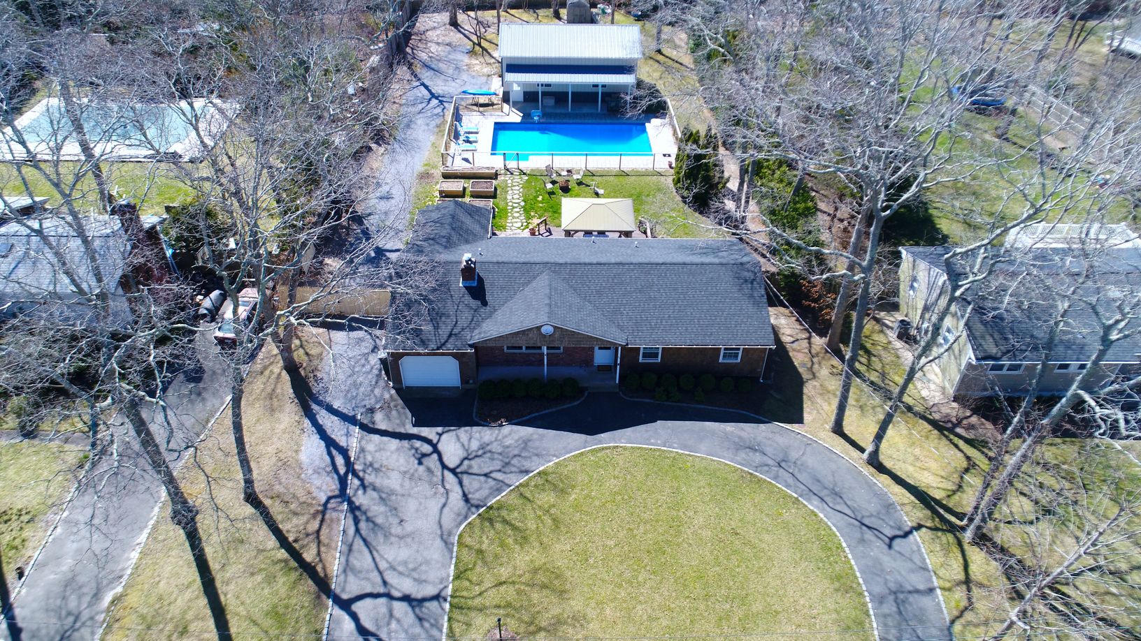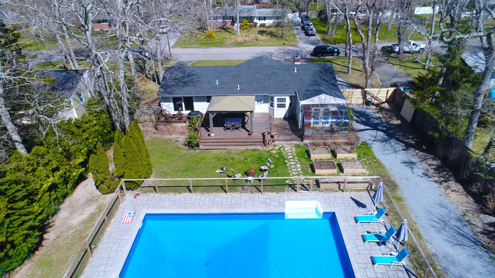 Gorgeous Ranch in East Quogue's Bay Estates sitting on over half an acre offers 3 Beds 3 Full Baths with an open Kitchen, Living Room and Dining Room. Full Finished Basement with a Bathroom. Sun room attached to the Media Room leading to a large back deck spanning the length of the house. A beautiful 20x40 swimming pool sits in front of a large 24x36 Detached garage with a porch over the side of the pool.