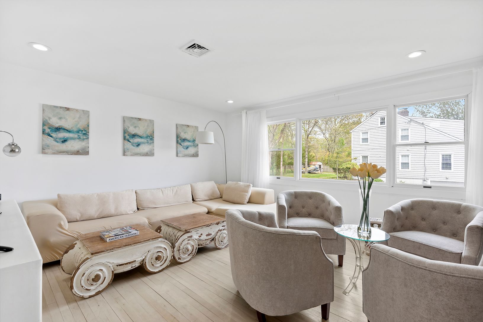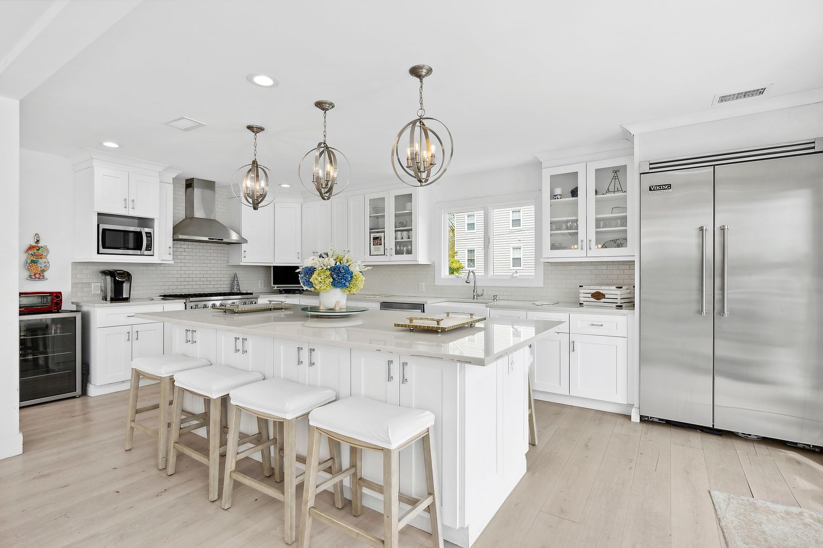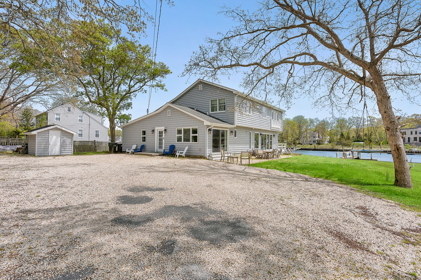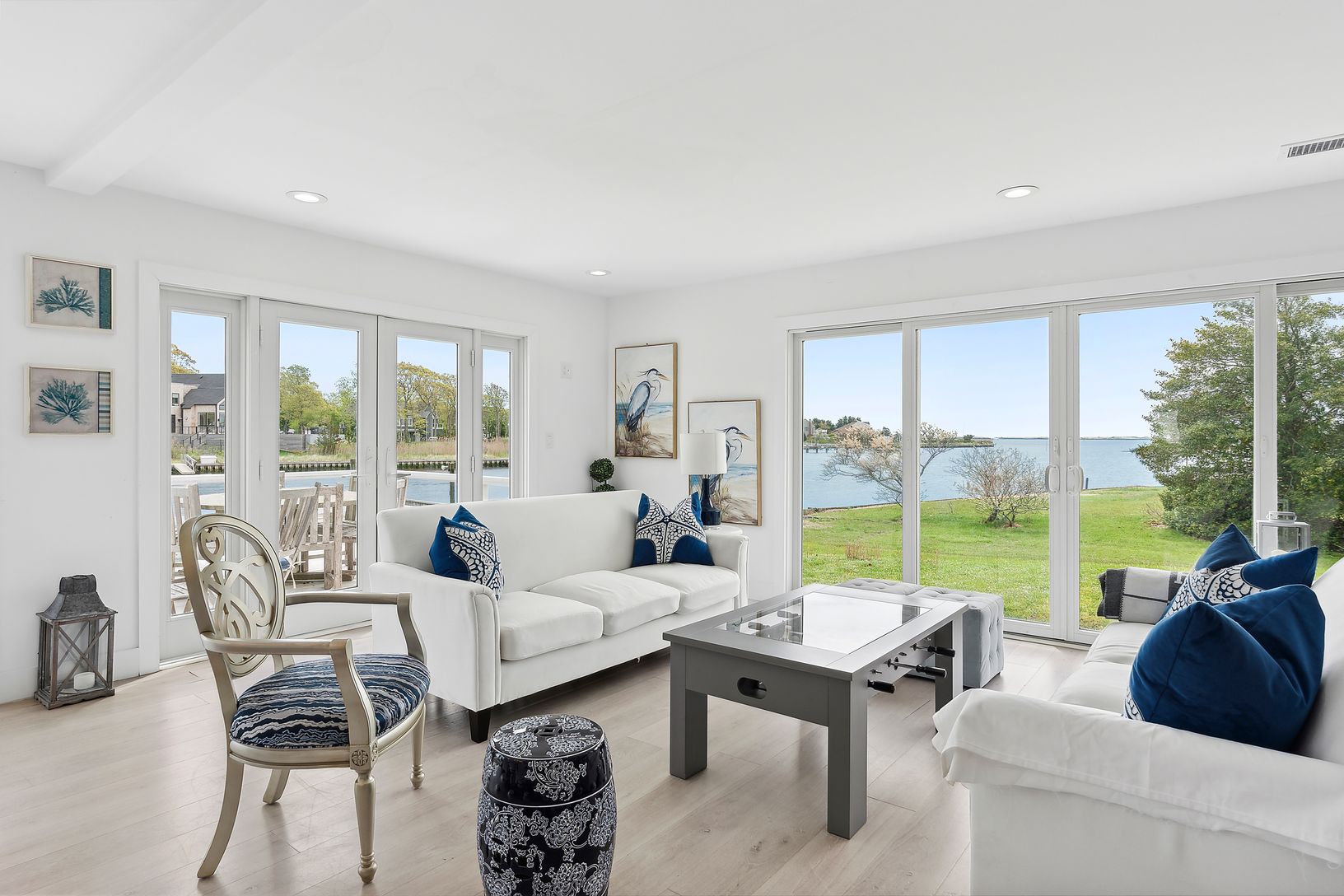 Discover waterfront living in this newly renovated 3200+/- square feet home. This six bedroom, three and a half bath oasis is located in the Neptune Cove Estates section of Hampton Bays, boasting 102 feet of waterfront and a bulkheaded deepwater dock on just shy of half an acre. The open floor plan on the first floor includes a living area, dining space, and kitchen with Viking appliances, large center island, and quartz countertops. Walls of