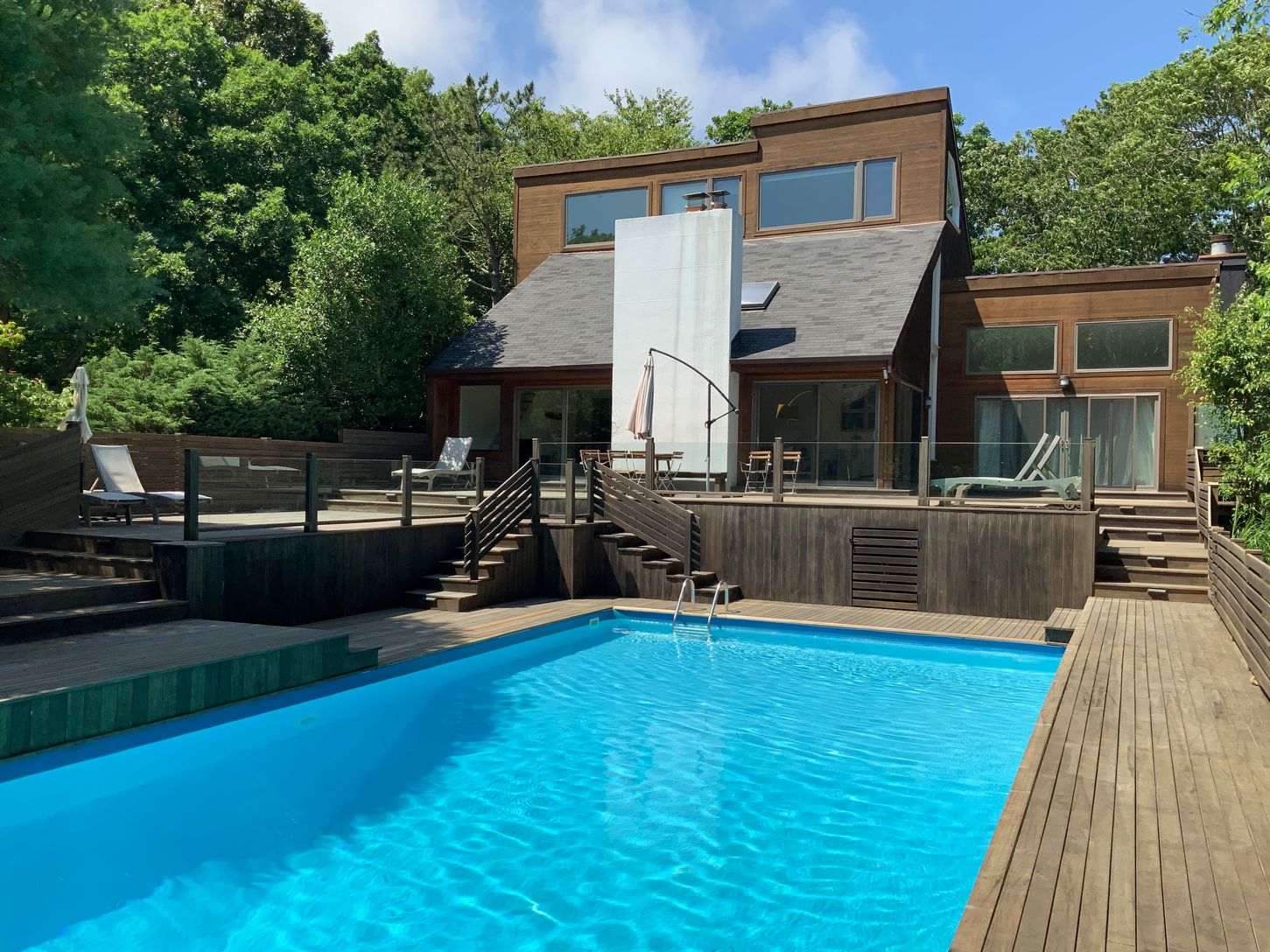 Sophisticated home spanning multiple levels located close to to Amagansett ocean beaches and town on over an acre of mature landscaping, With lots of windows and sliders the home is flooded with natural light. Master suite on the first floor has fireplace and sliders opening to mahogany deck leading to saltwater pool and outdoor shower. Another bedroom offers additional sleeping space with newly built loft. A third bedroom provides a separat