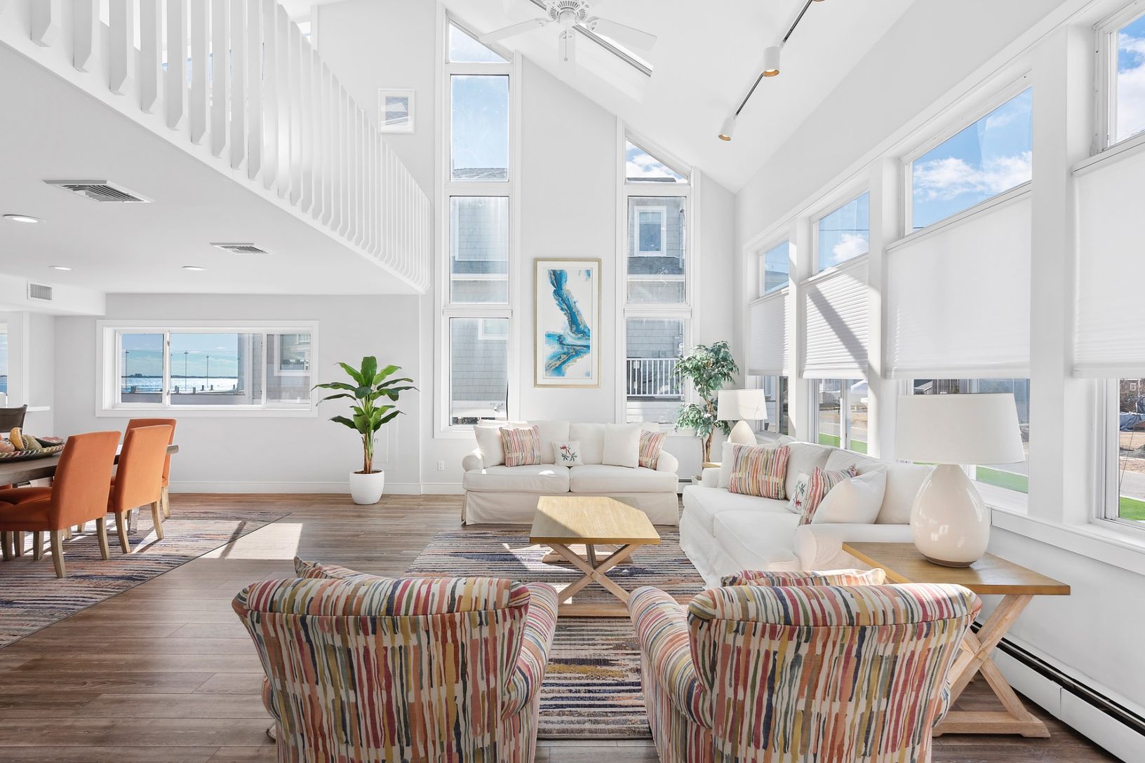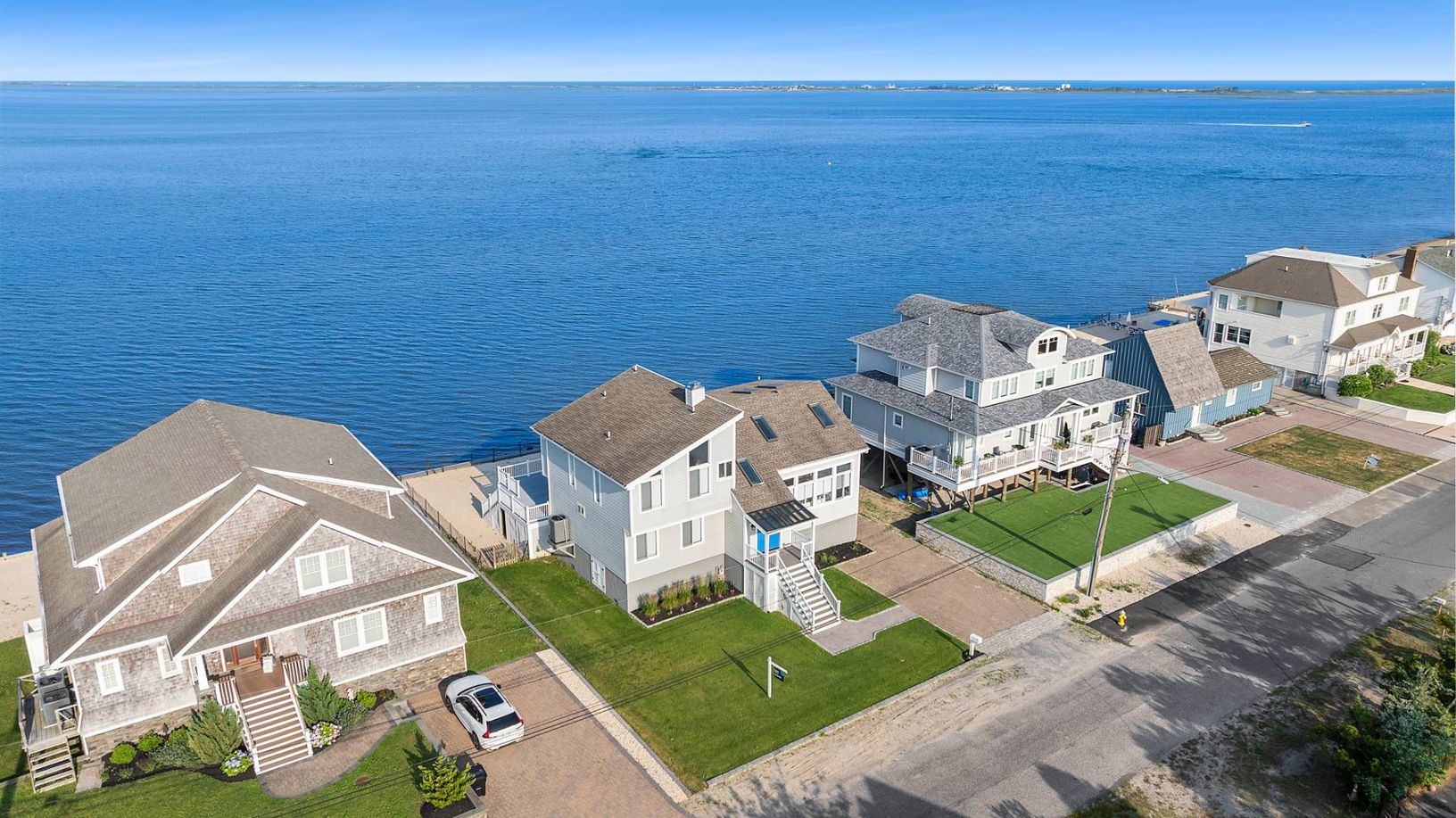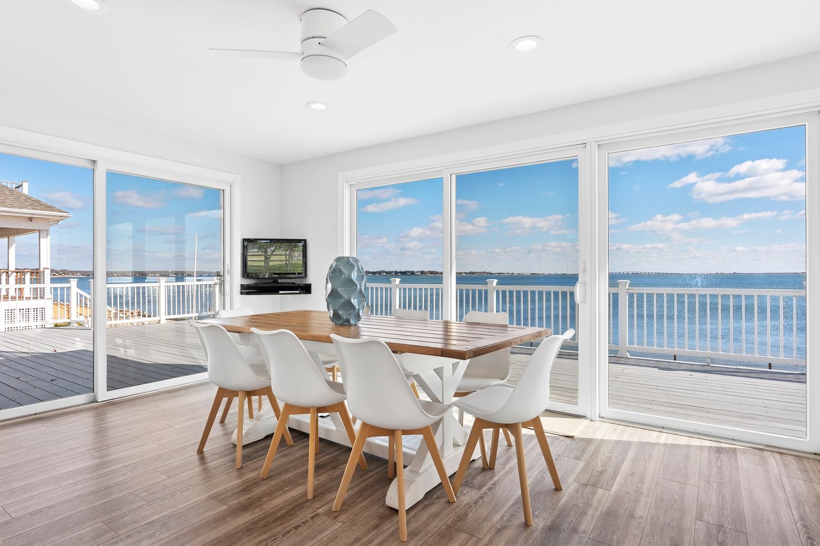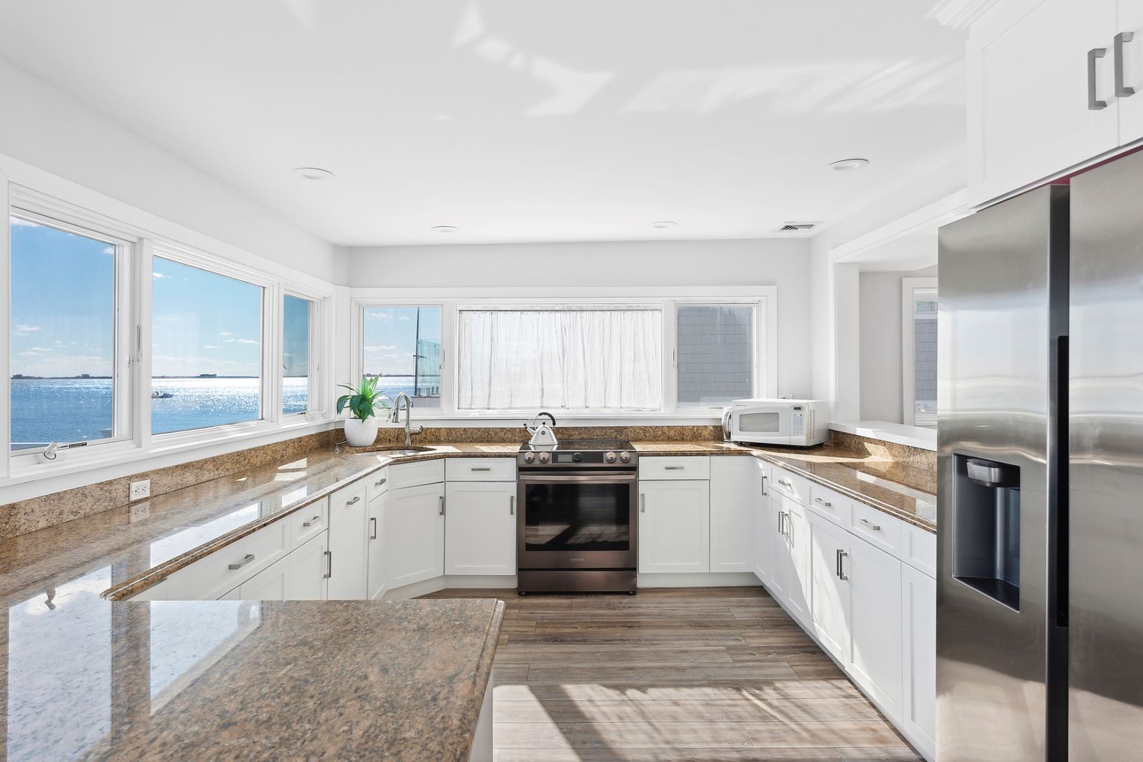 Enjoy unparalleled panoramic views of Shinnecock Bay in this meticulously kept waterfront home. Inside, the 5-bed 3.5-bath updated home has a vaulted-ceiling great room, a separate breakfast area overlooking the bay, and an open-style chef's kitchen with a breakfast bar. Two bedrooms are located on the first floor; three bedrooms and a separate den are located upstairs. Large windows and glass doors flood the home with natural light in all dir