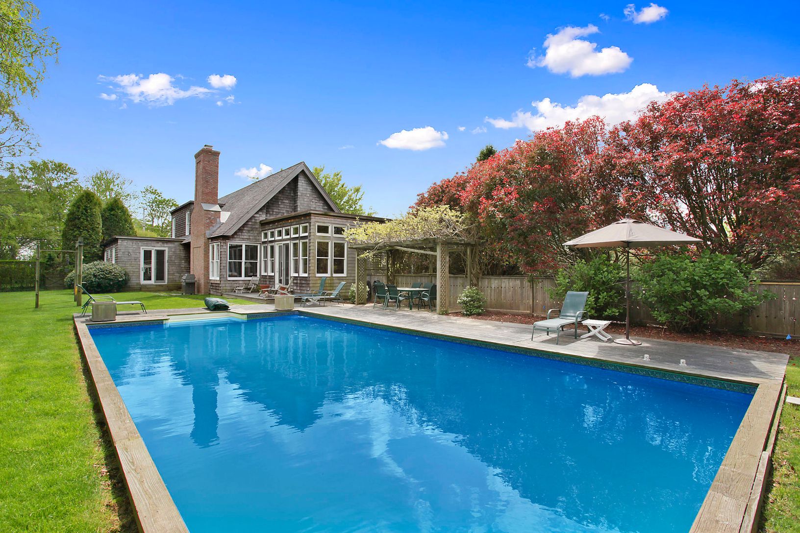 Minutes to the ocean from this handsomely decorated and appointed home featuring four bedrooms including a master with study and balcony with pond views. Large cathedral ceiling living room with fireplace, formal dining room and country kitchen. Lovely lawn and grounds surround the pool and poolhouse.