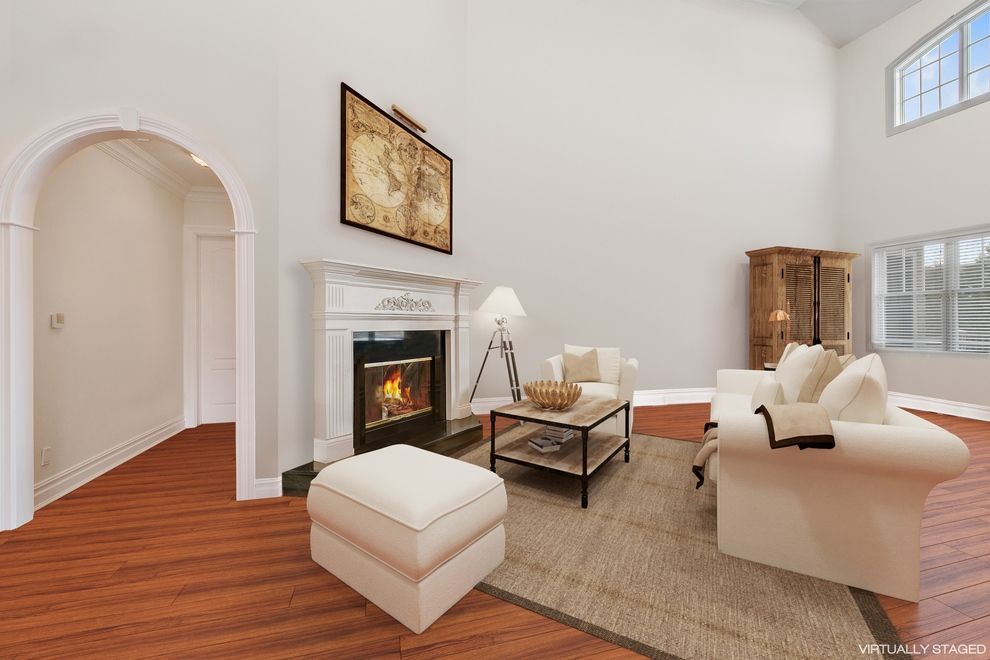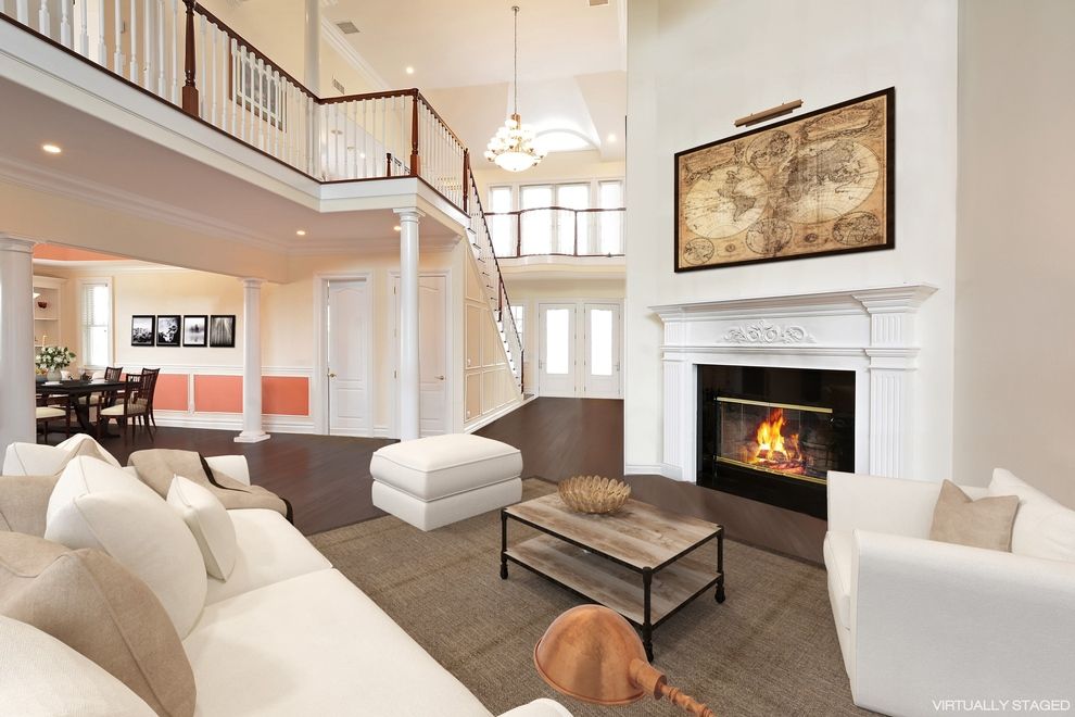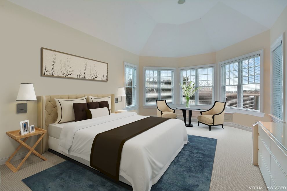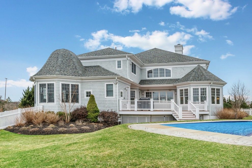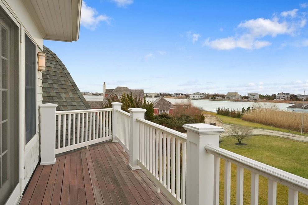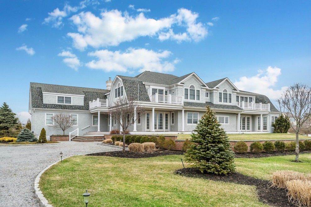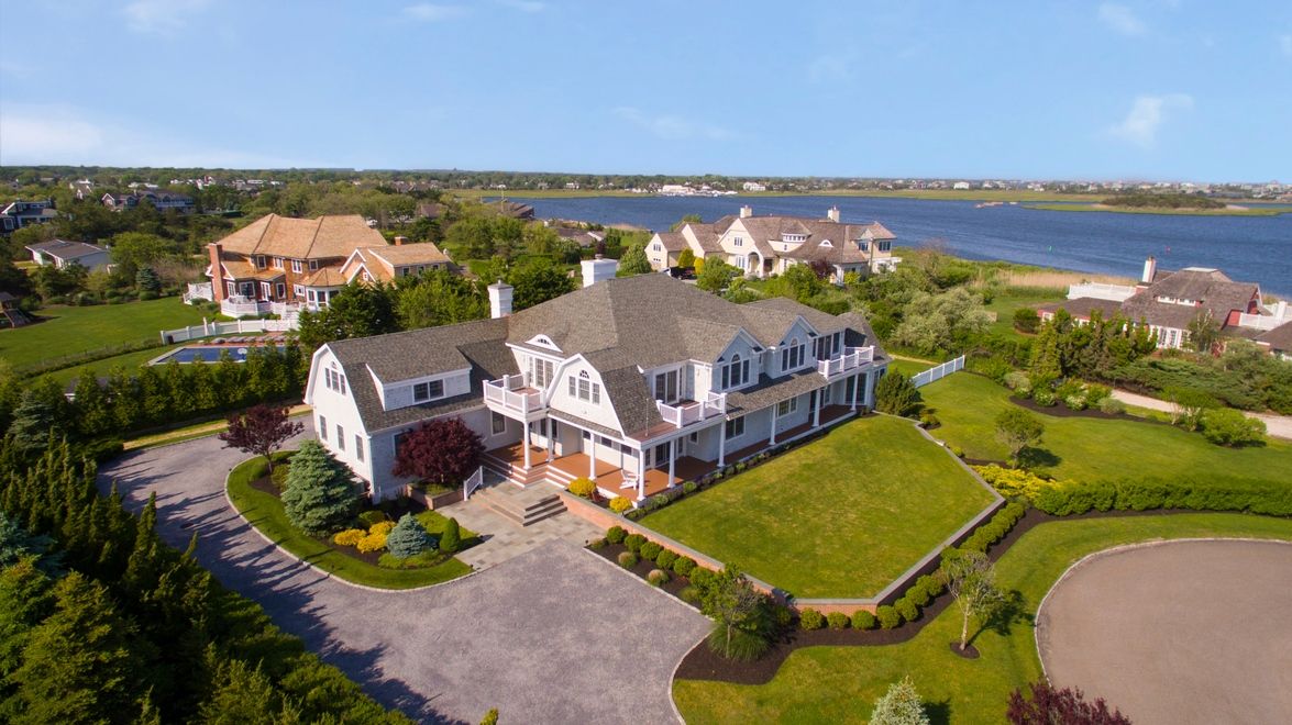 This sun-filled post modern with bay views sits high and dry above sea level on a quiet road just a short walk from the famous pristine beaches of Dune Road. Built in 2007, with floors of Brazilian cherry, designer chandeliers, double moldings and exquisite tile work, this 6700 square foot home is both elegant and warm. The cathedral-ceiling living room features multiple windows, a cozy gathering of comfortable seating around the stone-faced f