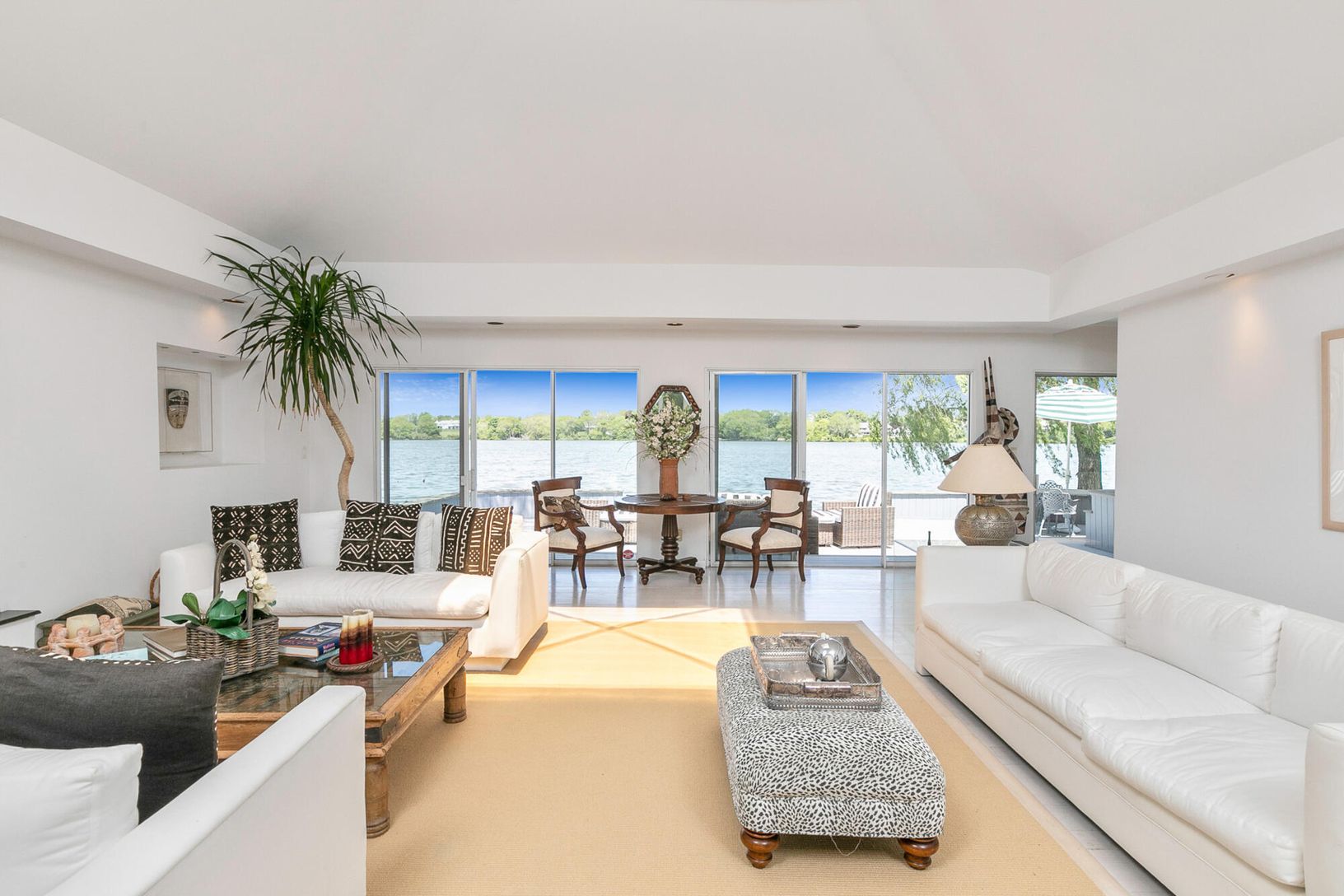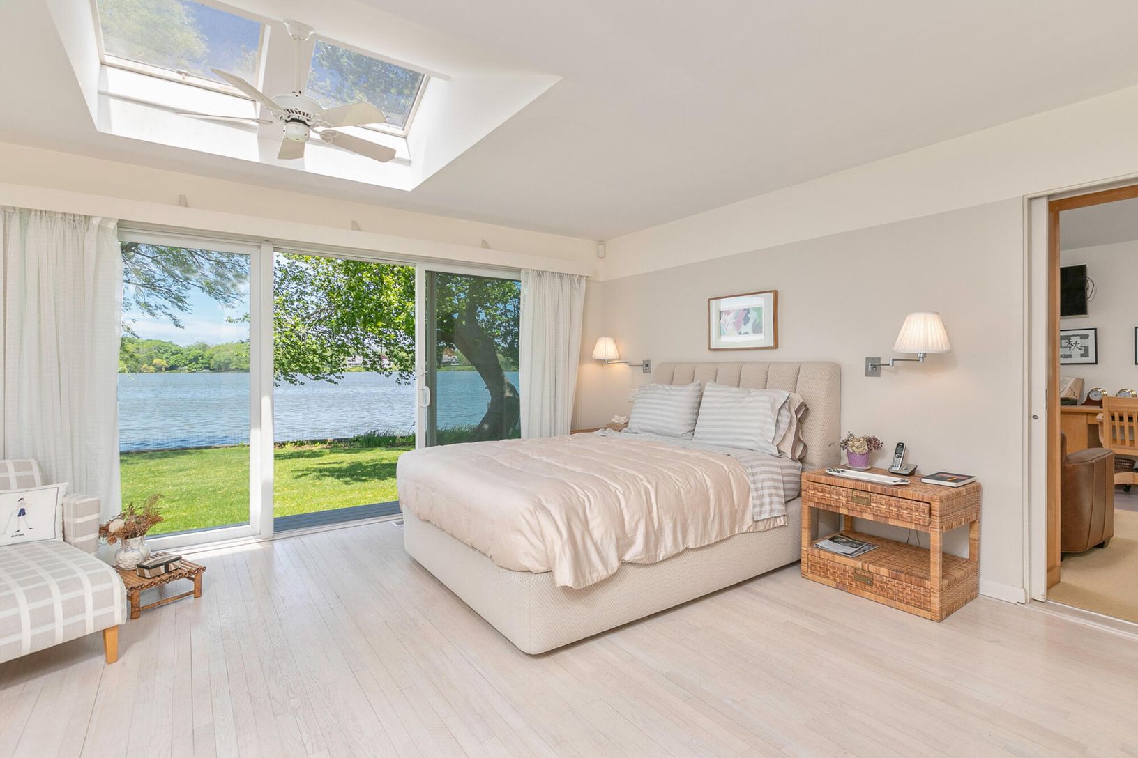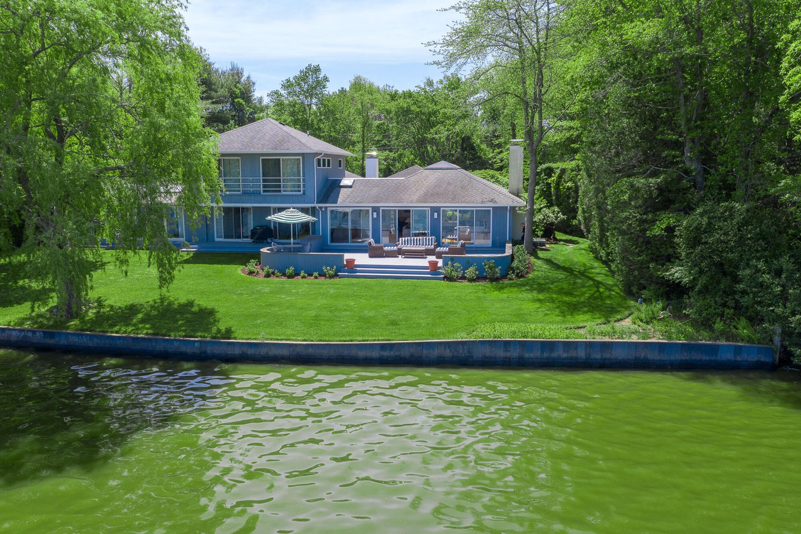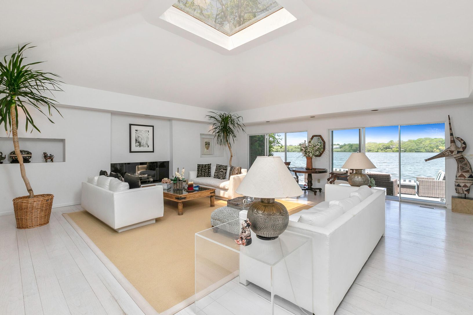 Arriving at the cobblestone driveway, is an enchanted waterfront Water Mill home situated on almost one acre of waterfront. Inside this modern contemporary home you will find The large living room with fireplace and vaulted ceilings, a light filled sunroom with slate floors, custom built ins and fireplace, over look the grounds and pool. and ample room for entertaining. Adjacent to the living room is the large updated kitchen with a dining a