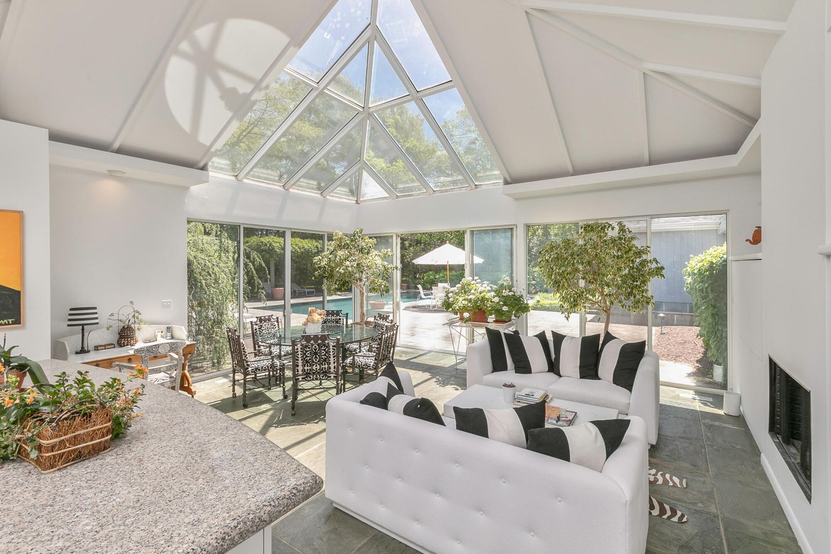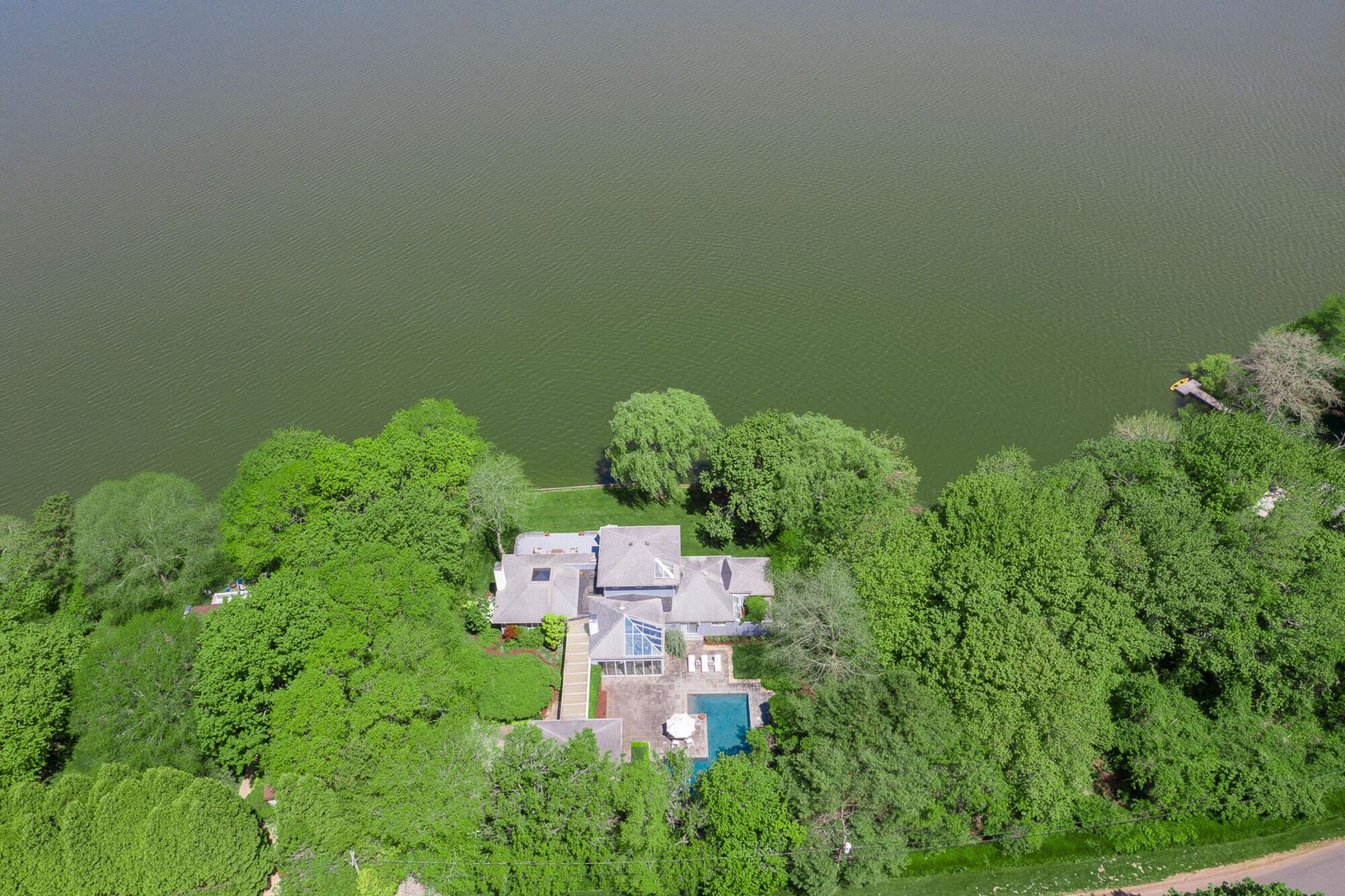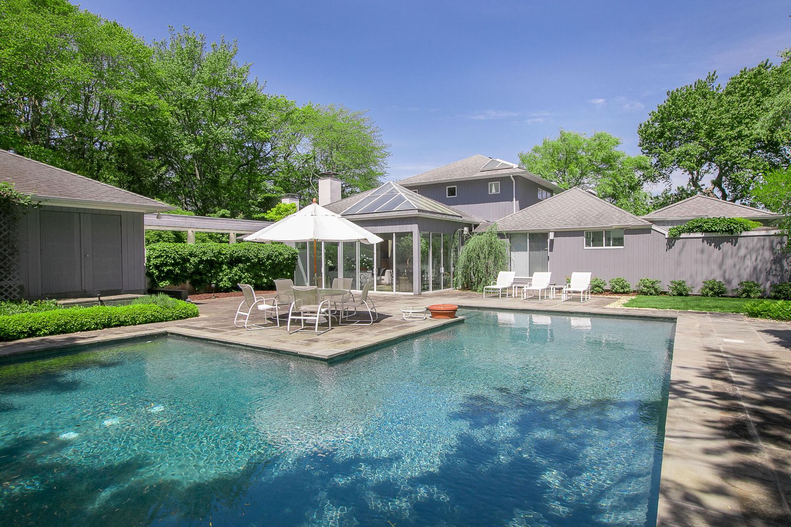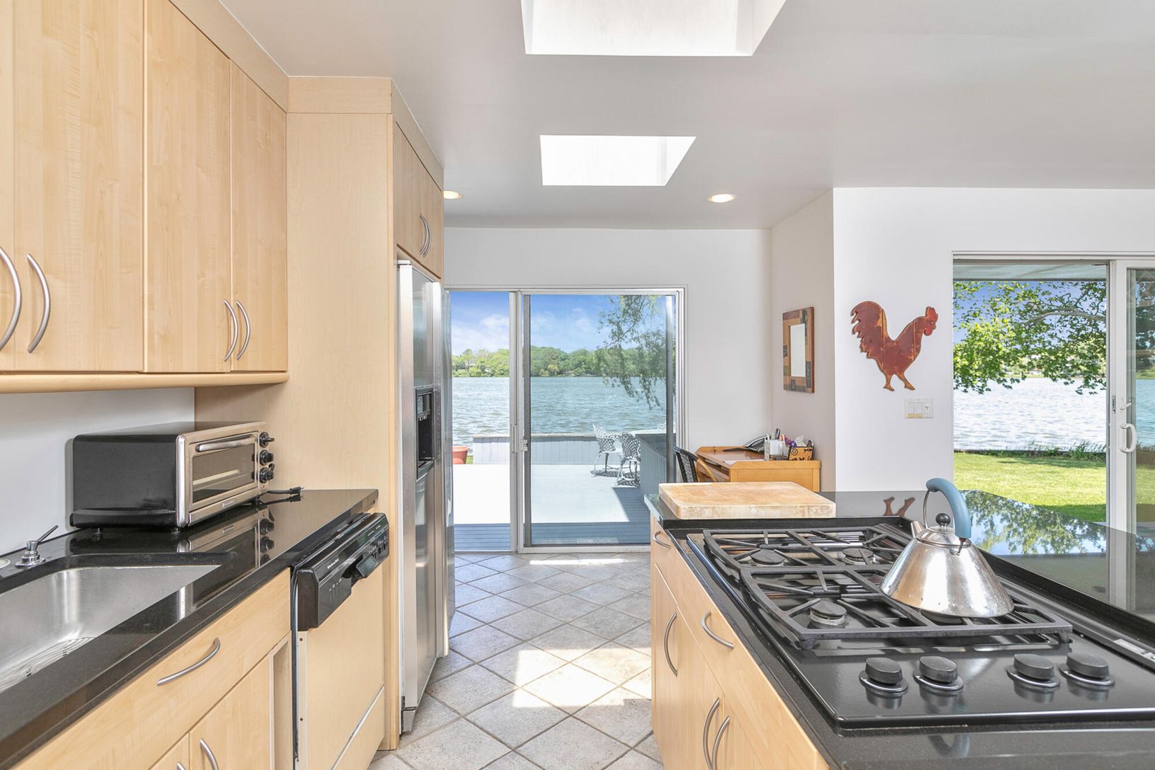 Arriving at the cobblestone driveway, is an enchanted waterfront Water Mill home situated on almost one acre of waterfront. Inside this modern contemporary home you will find The large living room with fireplace and vaulted ceilings, a light filled sunroom with slate floors, custom built ins and fireplace, over look the grounds and pool. and ample room for entertaining. Adjacent to the living room is the large updated kitchen with a dining a