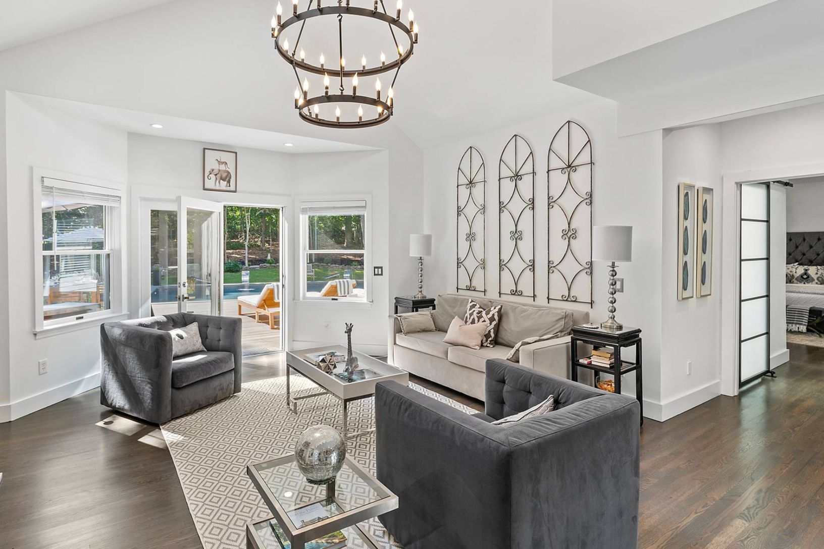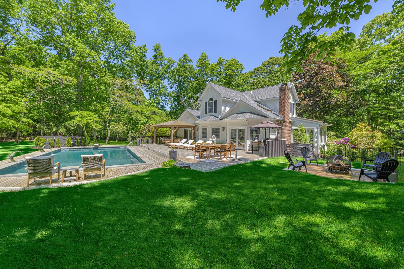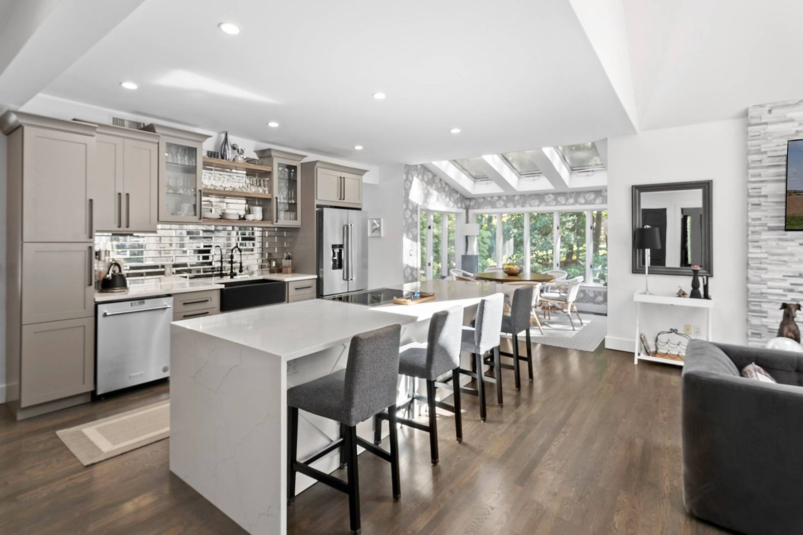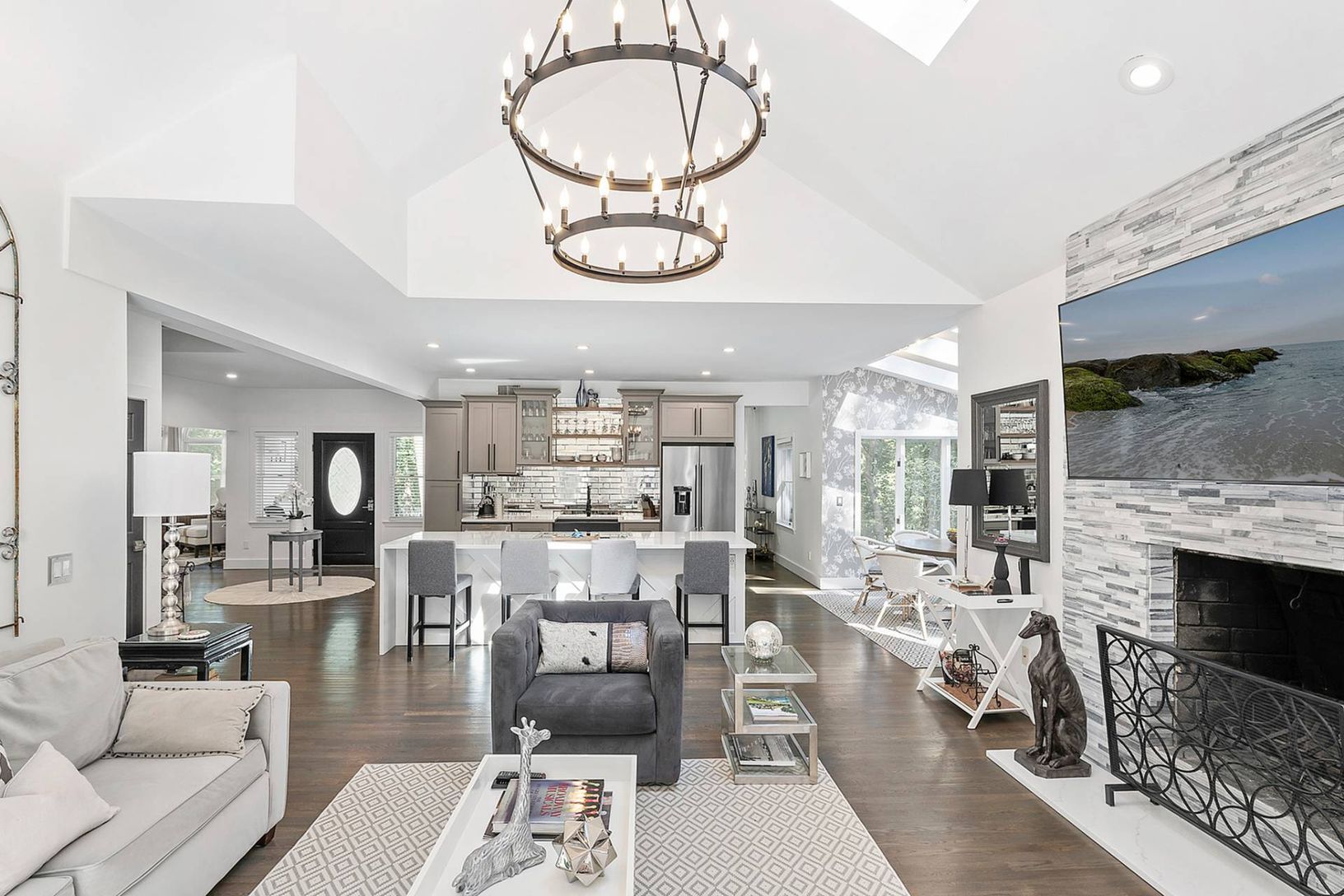Welcome to 230 Northside Drive, a completely redesigned and reimagined home set on a beautifully manicured .99+/- acre in the Hamlet of Sag Harbor. Upon entering this light and bright 4 bedroom, 4 bathroom home, you are immediately drawn into the new open-concept custom kitchen with a large waterfall stone center island with seating, all new stainless steel appliances, and a farm-style sink. Adjoining the fabulous kitchen is a generously sized