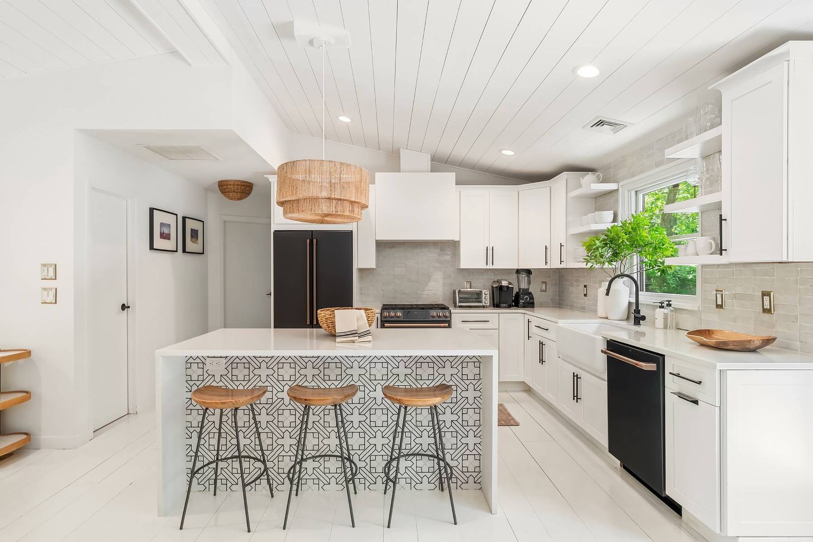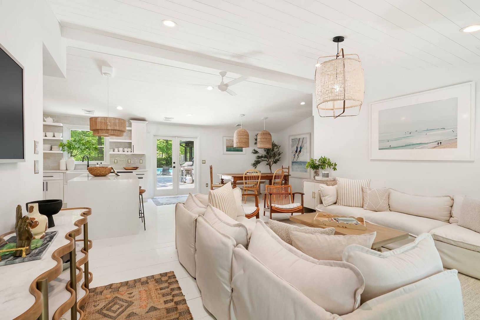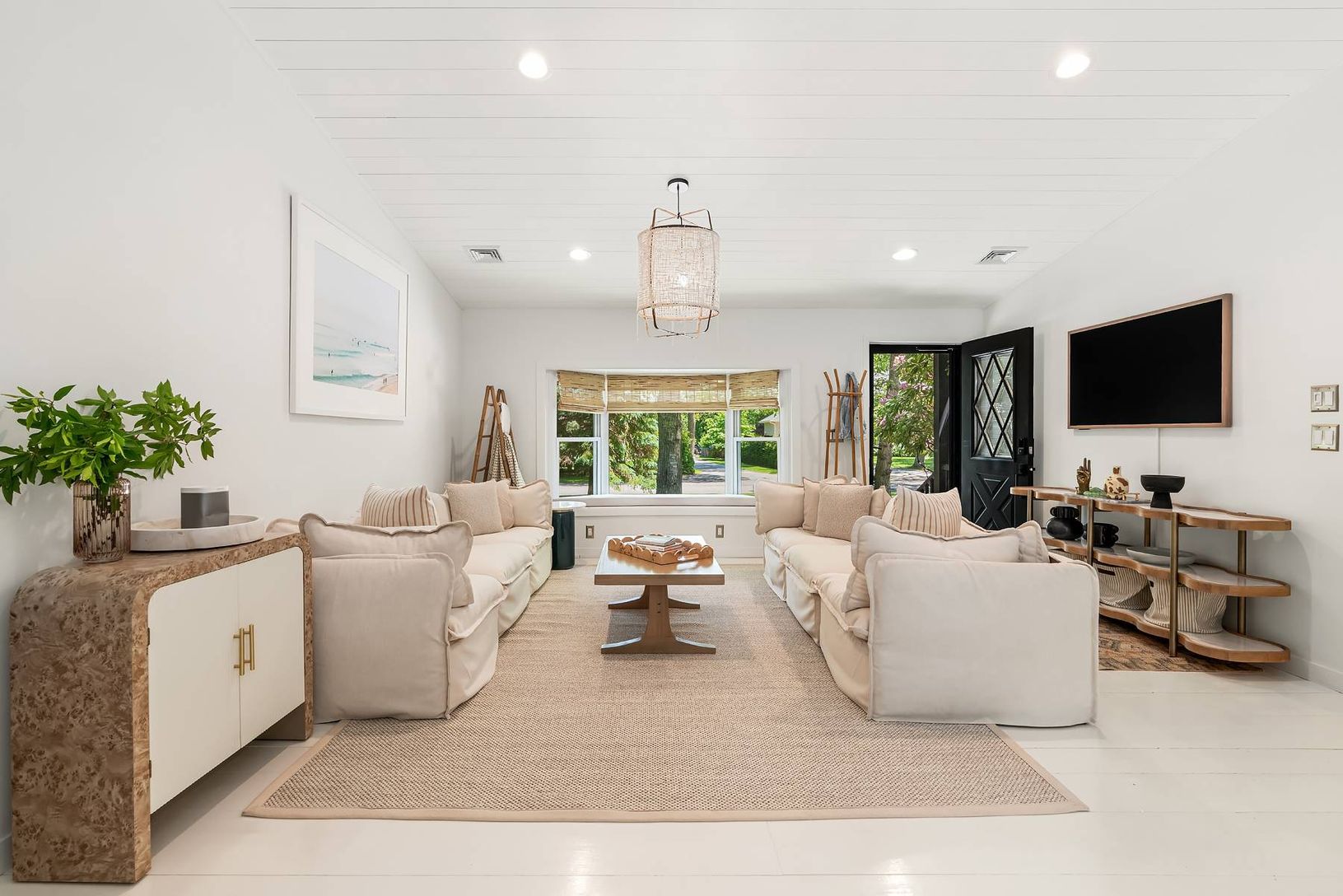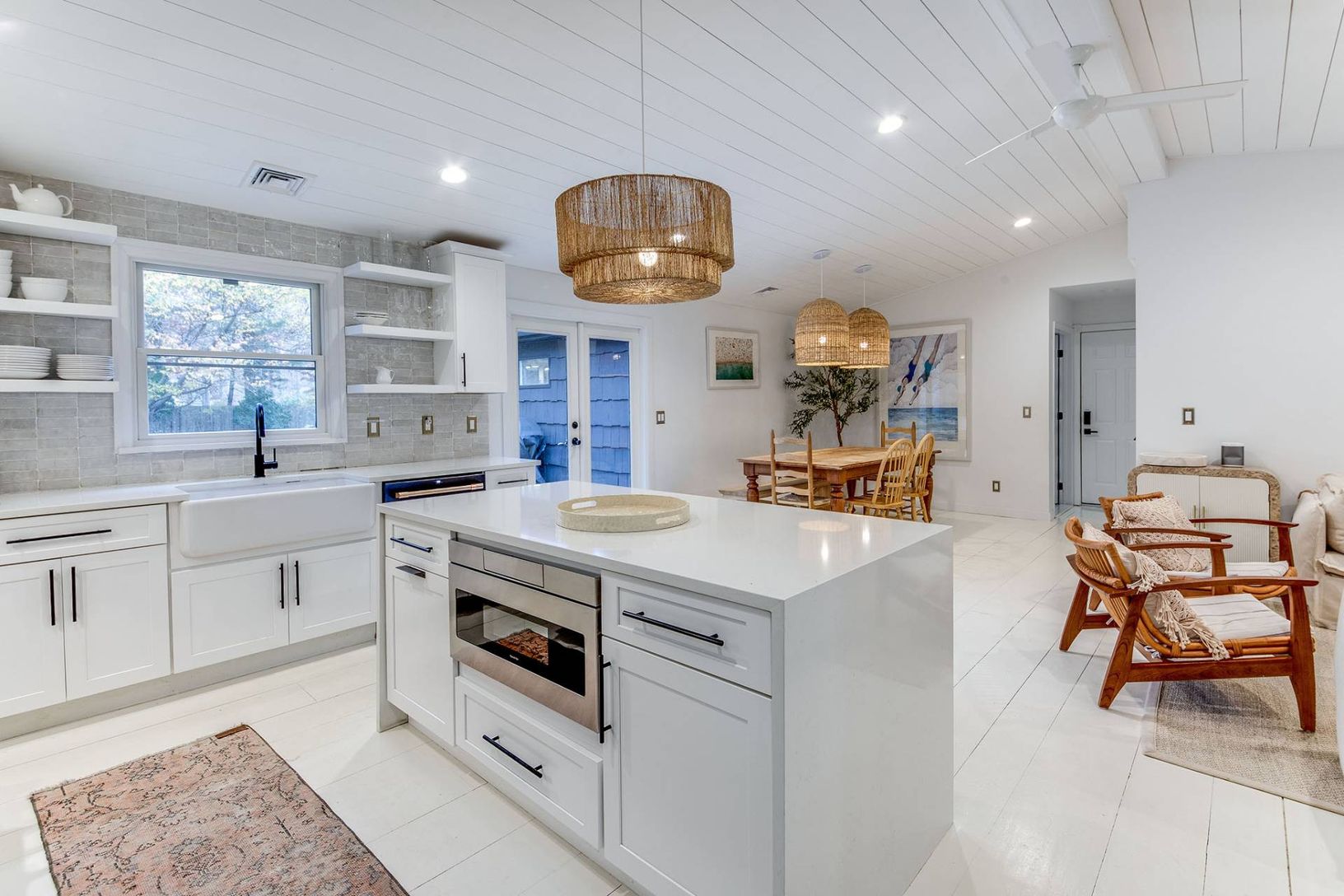 Expertly renovated and well appointed, this stunning one-level modern home in East Hampton's Clearwater Beach Association presents a full package with ample amenities and bespoke touches at every turn. Larger than its initial impression from the outside suggests, the residence offers four bedrooms (two ensuite), four full bathrooms, a separate office/den, and a great room with vaulted ceilings over the living, dining, and custom-tiled kitchen