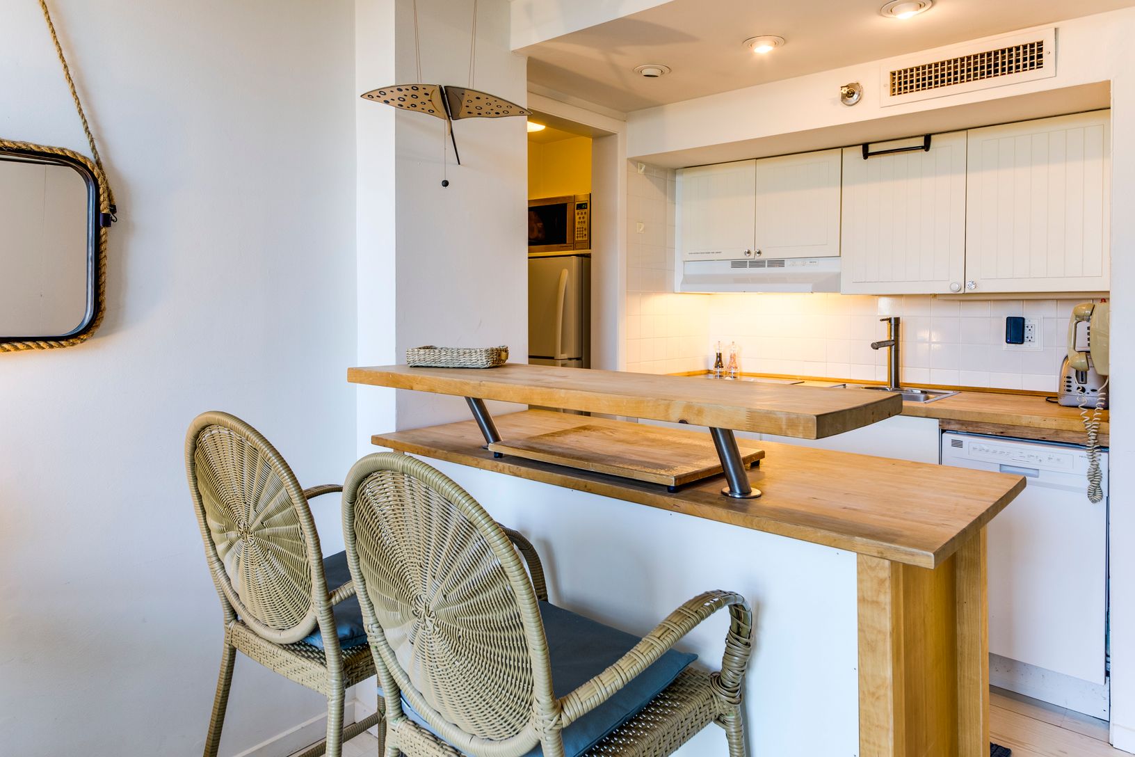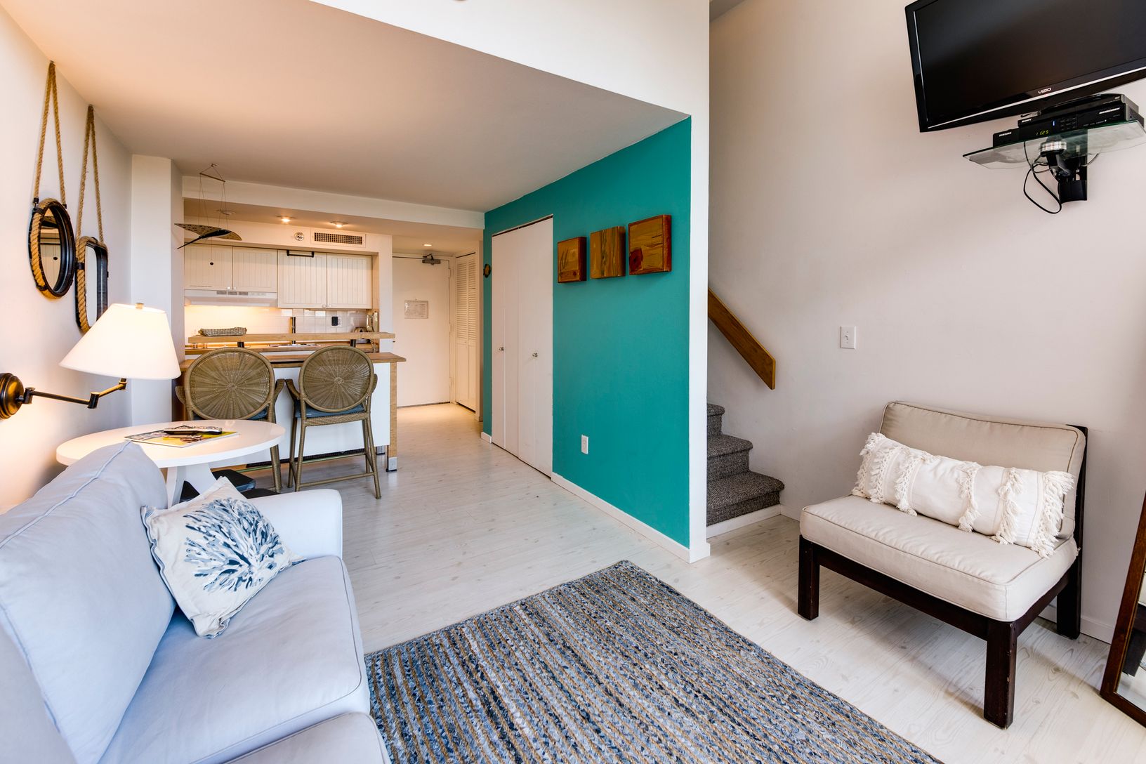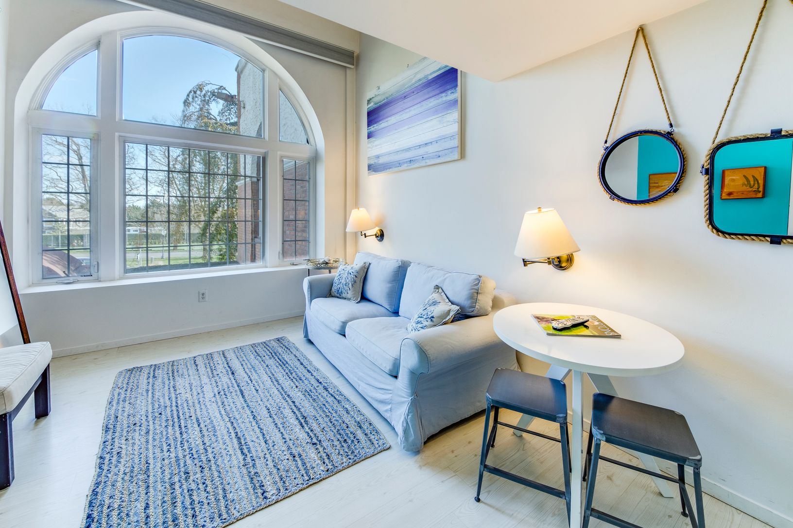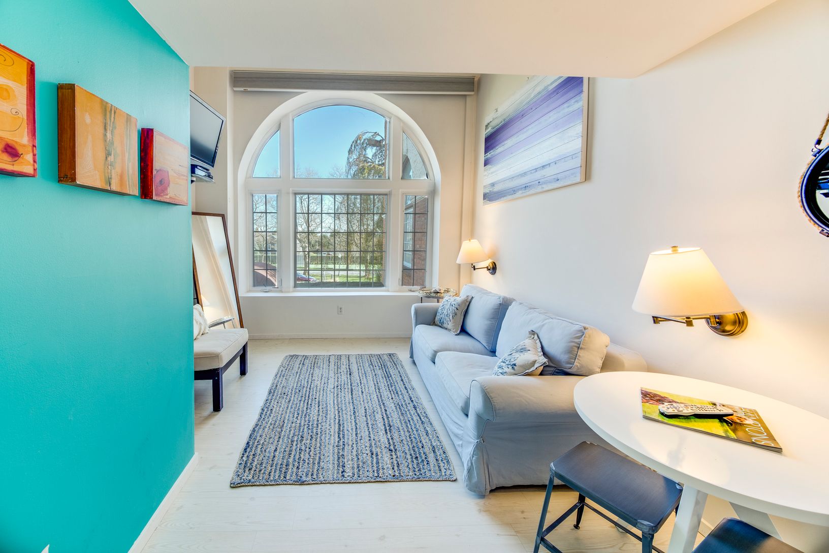 This fabulous sunny condop has a double height ceiling in the living room with an oversized bay window. Enter your sunlit unit to brand new hardwood floors and renovated kitchen with an island for counter seating and additional work space. An oversized pantry area provides additional space. Upstairs is an en-suite bedroom with a fabulous large walk-in closet. If you are looking for an affordable Pied -A-Terre in the Hamptons with seamless an