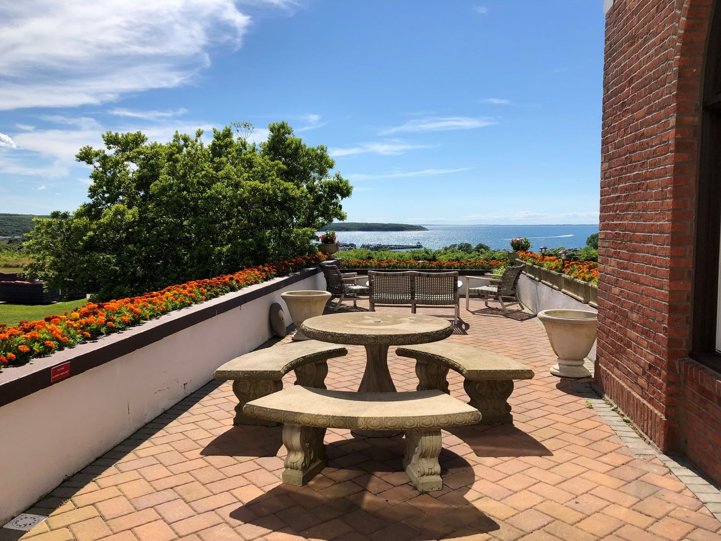 Truly a wonderful getaway with spectacular water views from your own private 580 SF brick and stone terrace... Enjoy the serenity this one bedroom one bath duplex has to offer at the Montauk Manor. The interior space-785 square feet- is light and bright with vaulted ceiling and palladium windows. Interiors photos to follow-The 580 square foot exterior brick patio faces west for the best sunsets. Furnished with a modern flair and once here you