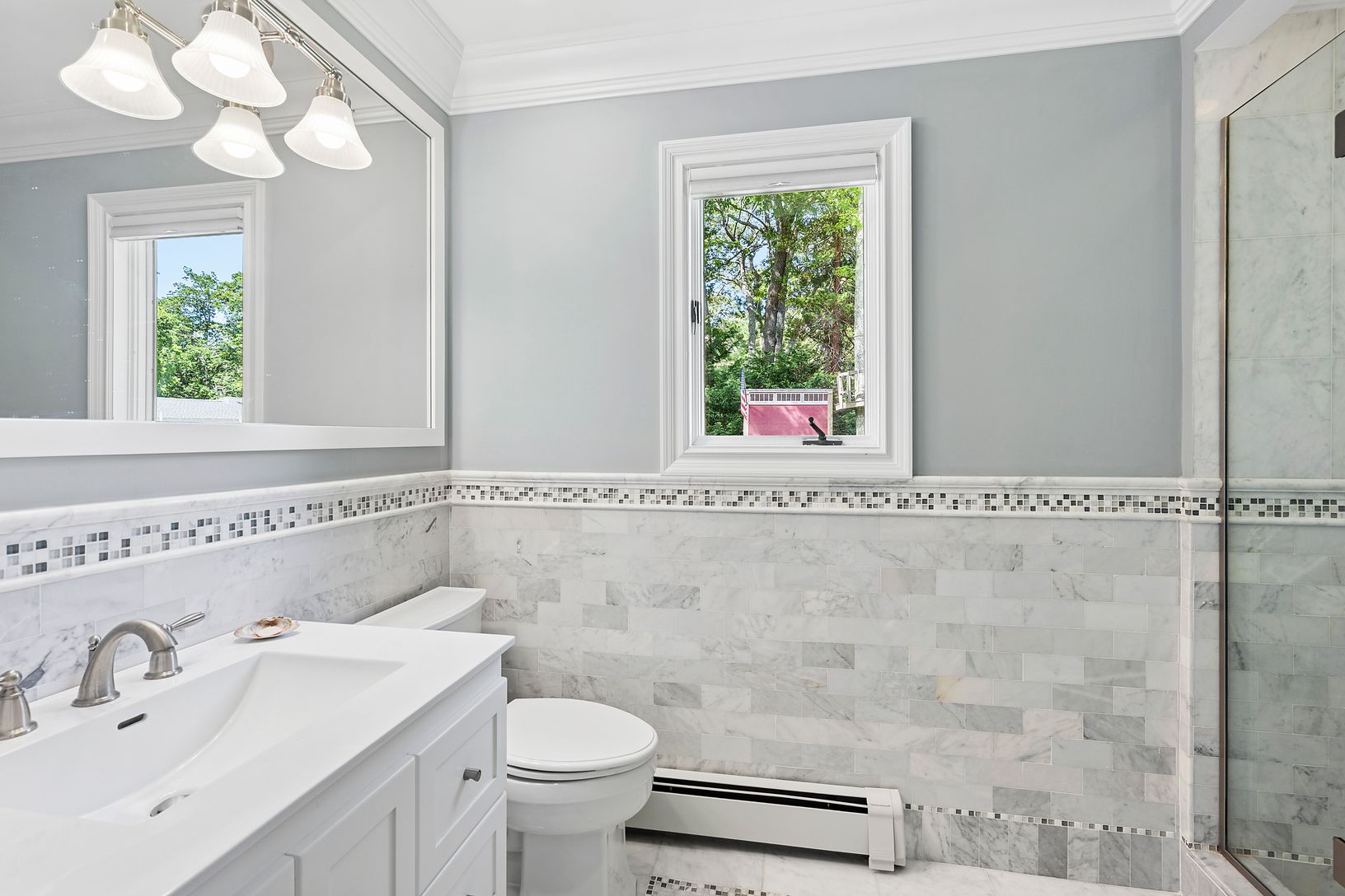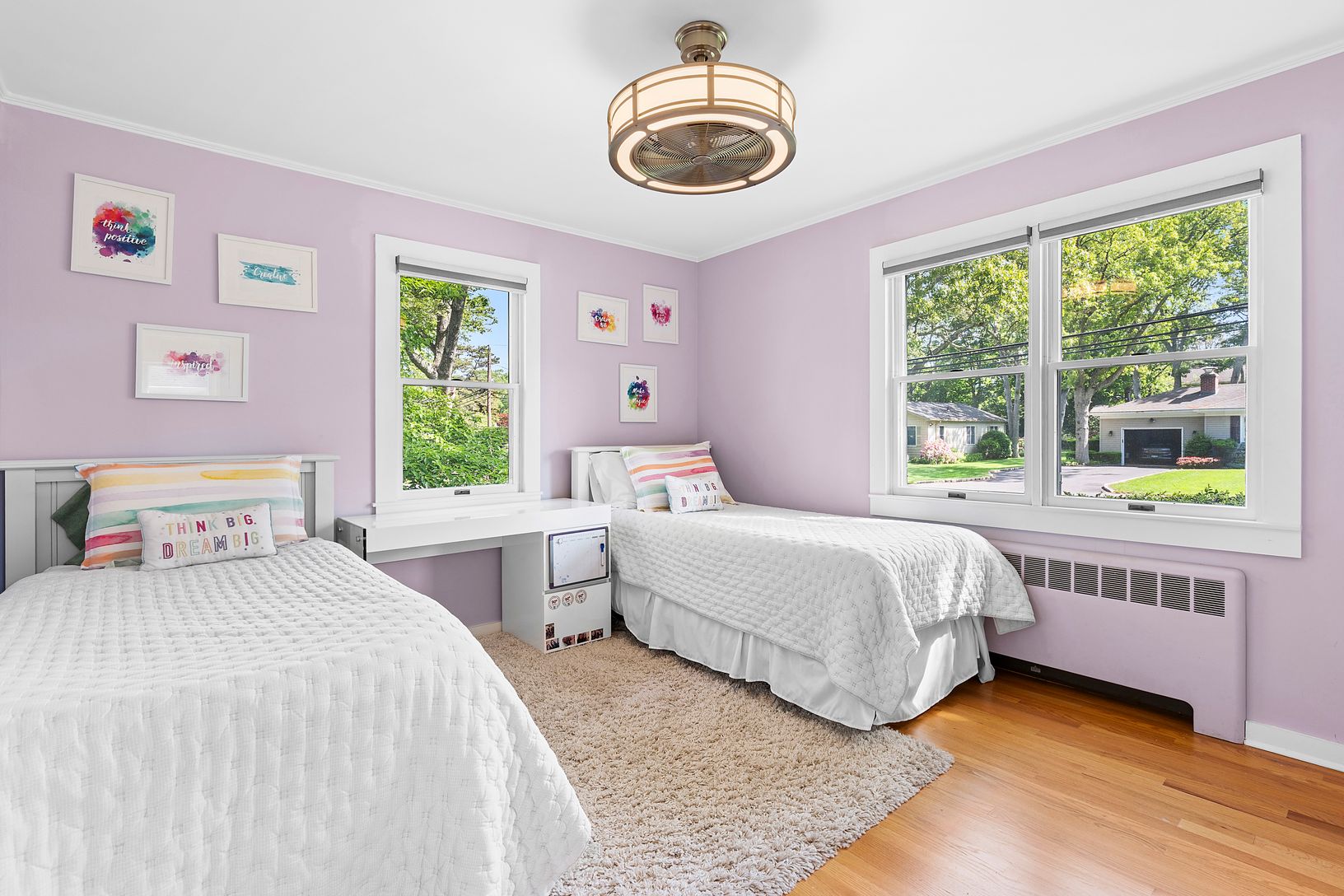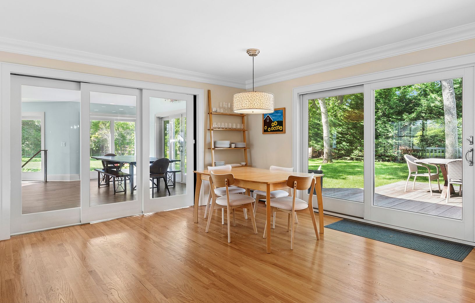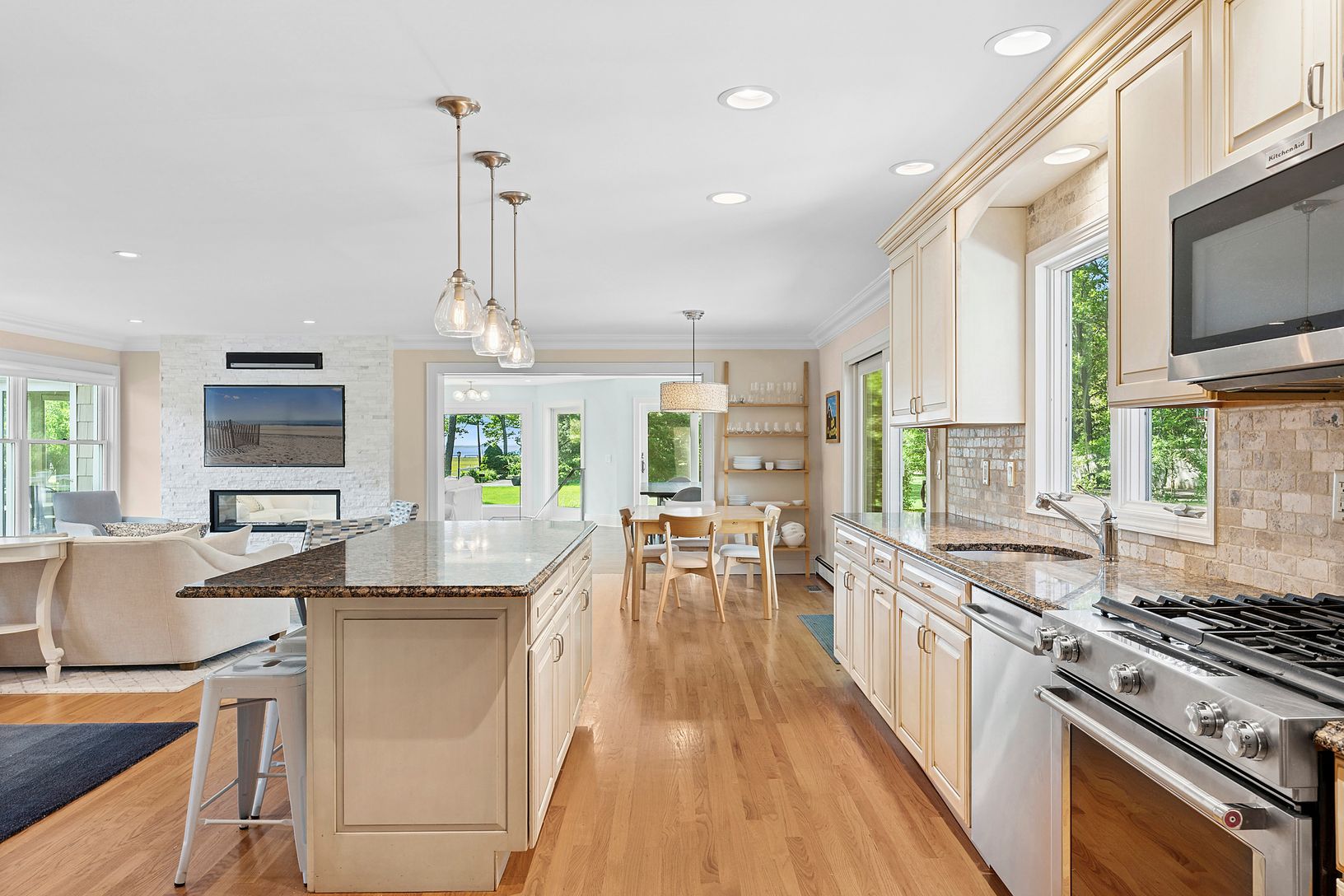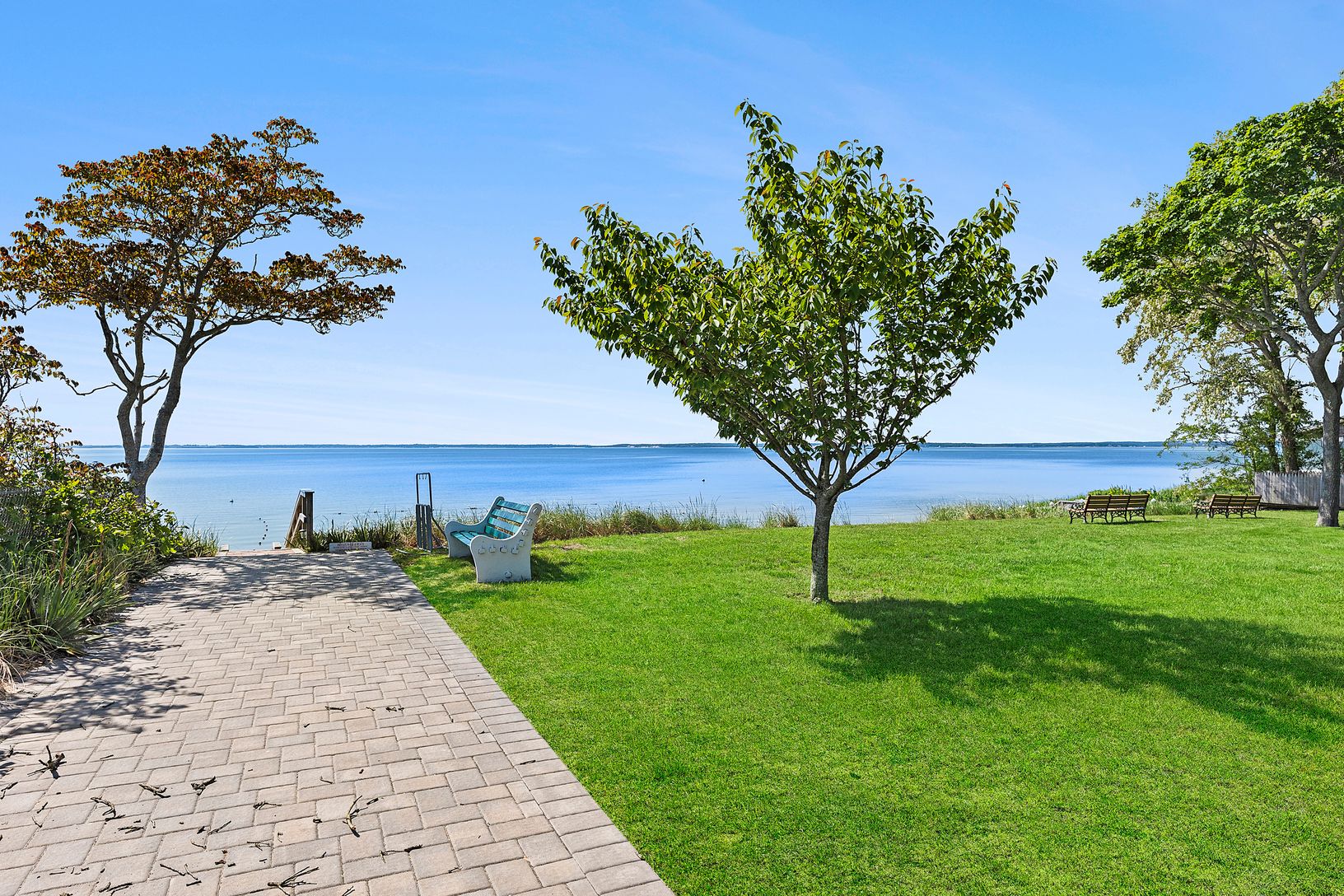 This stunning expanded ranch in the heart of Mattituck offers breathtaking views of Peconic Bay and is just a short distance from its gorgeous private deeded beach. Boasting over 2,600 square feet of living space, the home is perfectly situated on two-thirds of an acre. Upon entering, you'll find a welcoming front deck that leads into a bright foyer showcasing an open floor plan. This area is anchored by a double-sided, stacked white stone ga