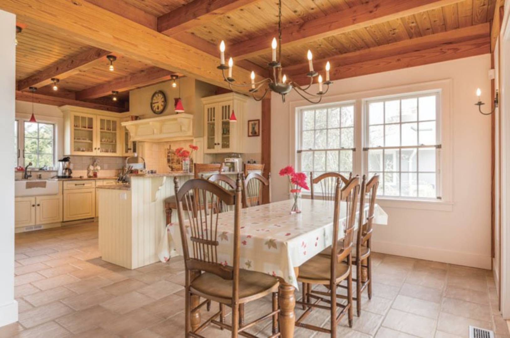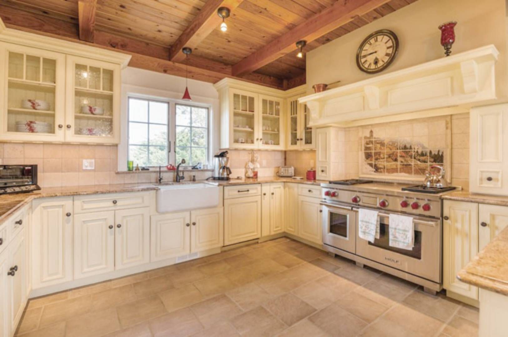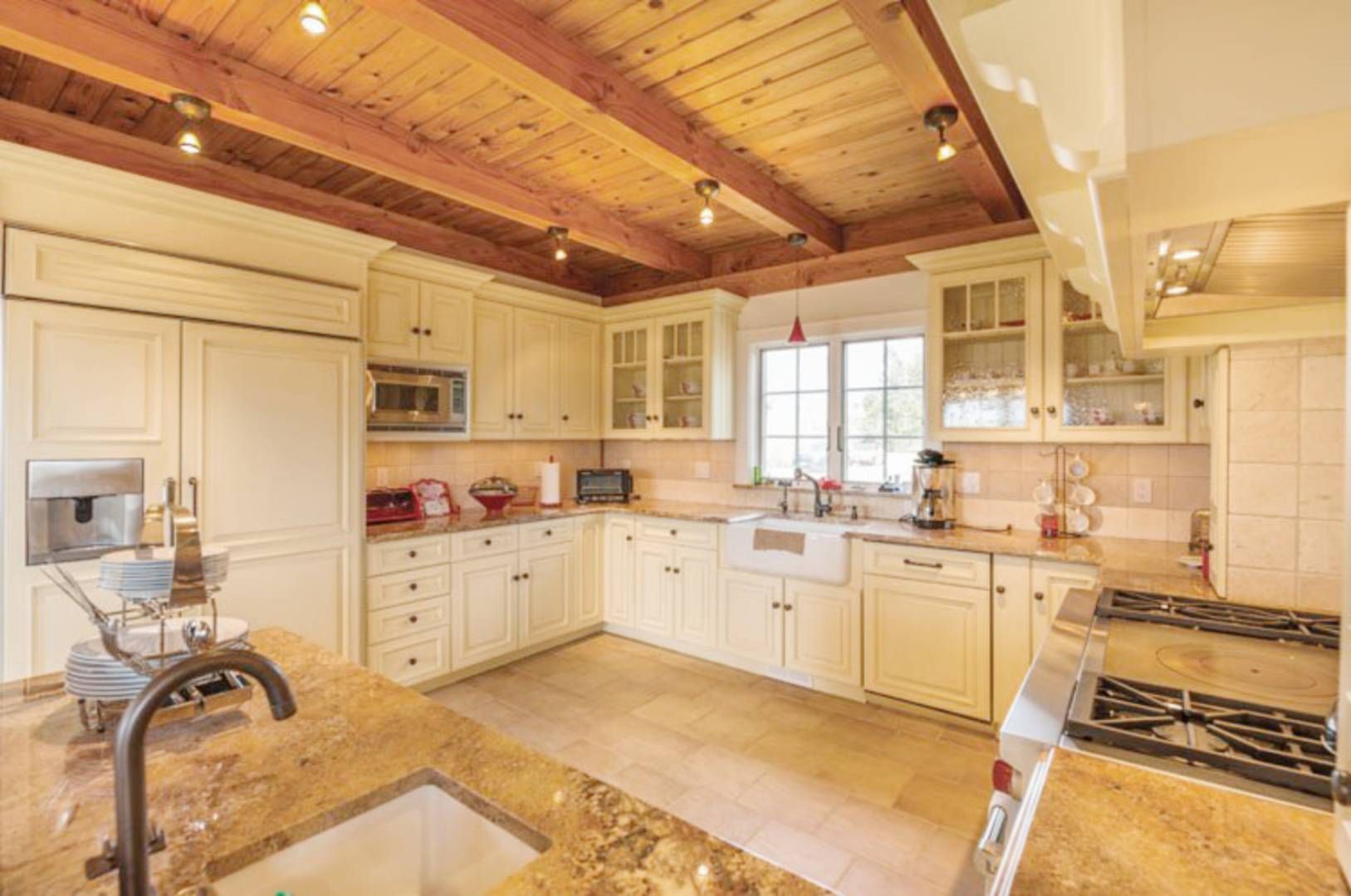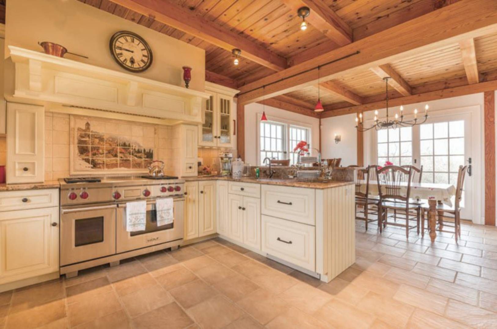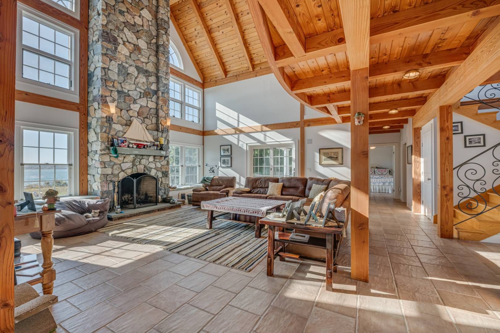 Enjoy gorgeous sunsets over the lake in this turnkey waterfront traditional situated on Lake Montauk. Tucked back from the road on a private driveway, this 3,000+/- sq. ft. residence offers open living areas including a spacious living room with floor to ceiling stone fireplace and double-height ceilings. The eat-in kitchen has a farm sink, Wolf range, granite counters and dining area. There is also a large pantry perfect for extra storage. Do