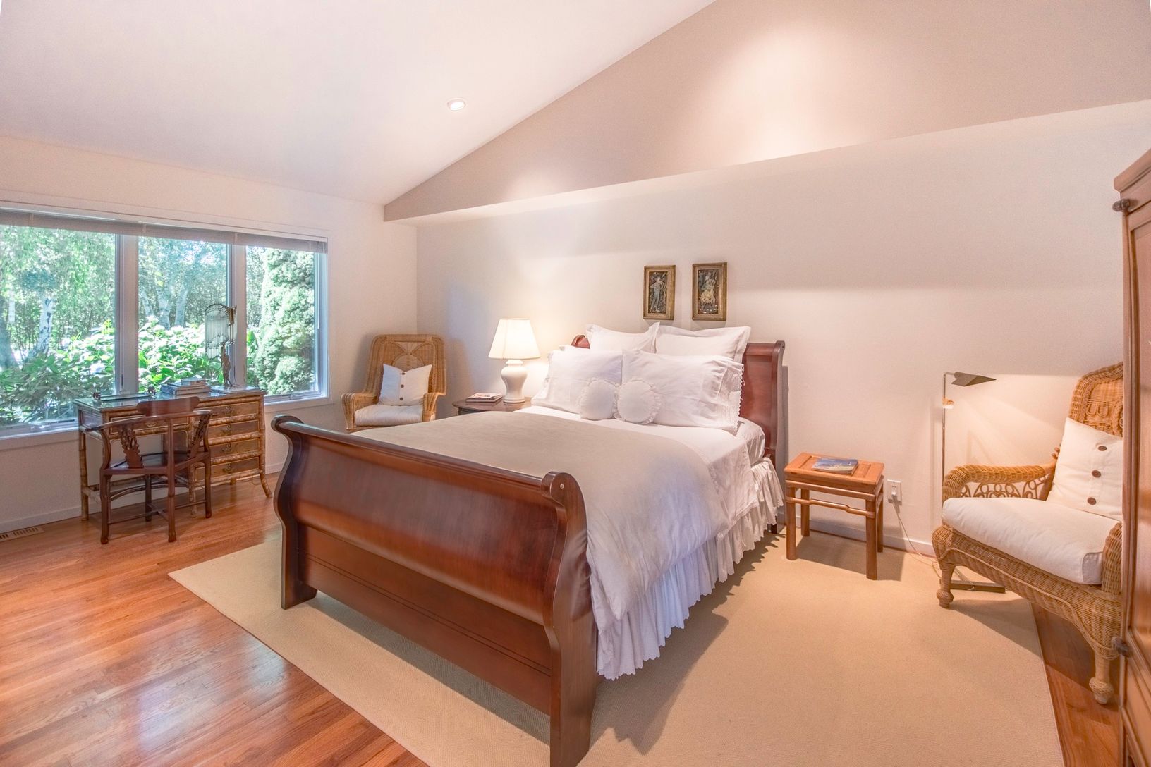 Meticulously landscaped 2 contiguous 1+/- acre lots, south of the highway, provides the perfect setting for a compound with 2 residences, or 1 large estate containing 2+/- acres on beautifully landscaped private grounds. The existing 4500+/- sf six- bedroom contemporary residence includes a sun-filled living room, master suite, 2 additional guest suites, powder room, eat-in kitchen, enclosed sunroom, formal dining room, and media area with we