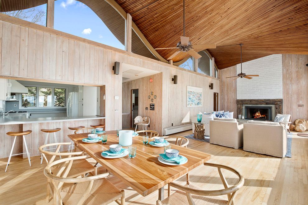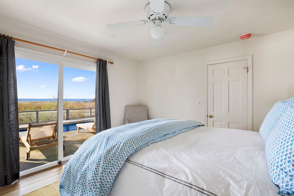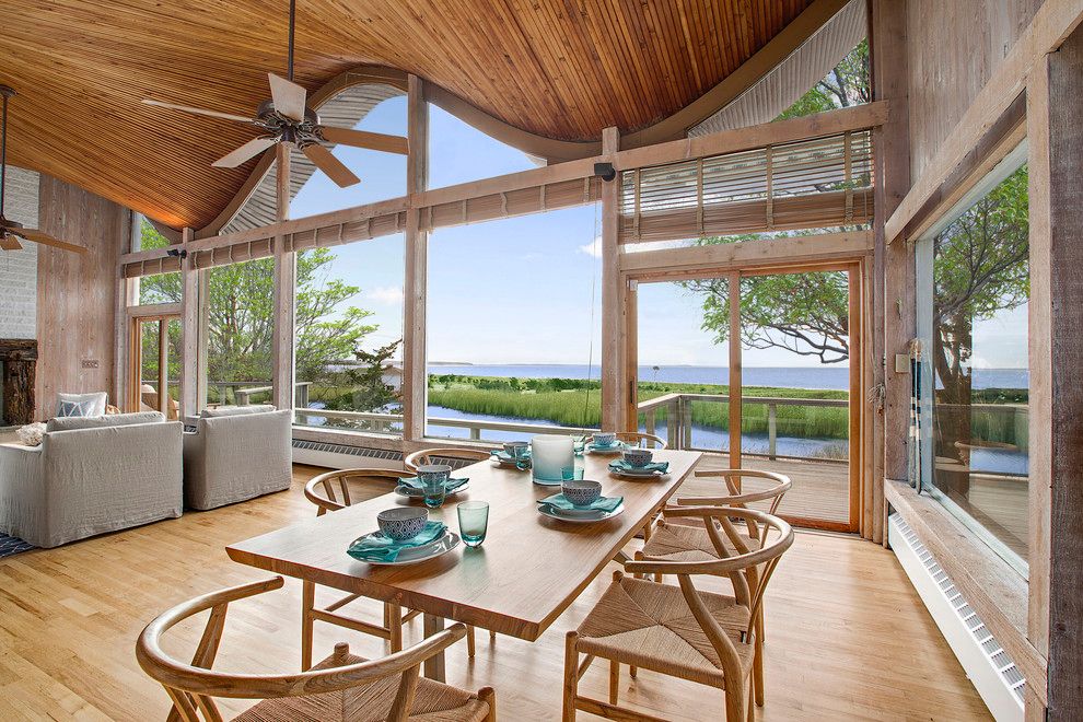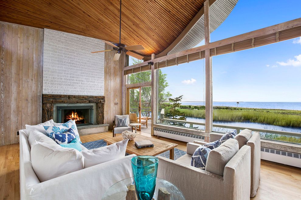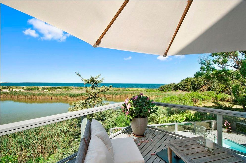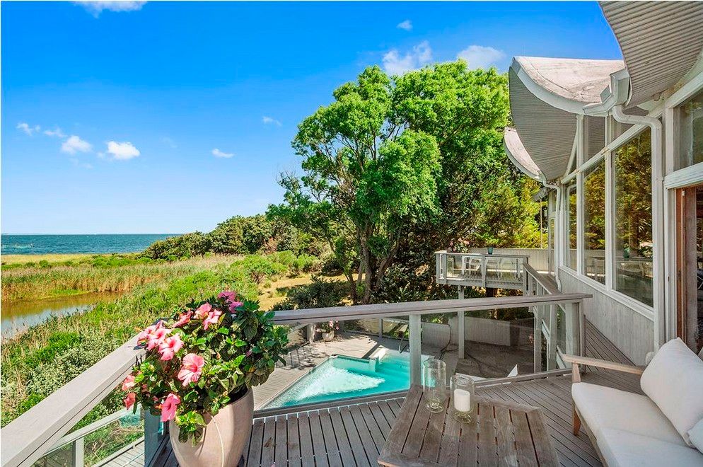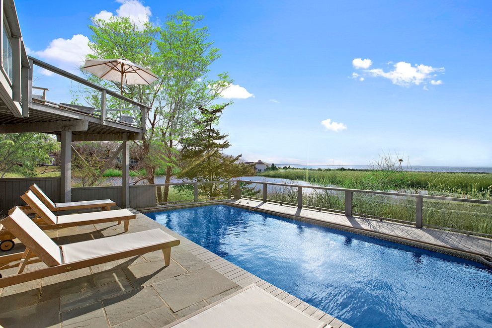 Enjoy endless views and spectacular sunsets from this 4 bedroom 3 bath home located on pond overlooking Gardiner's Bay in the coveted Lions Head Private Beach Association. Main floor offers all glass living room with big views and open layout kitchen with dining area leading out to two second story lounge areas plus a bedroom and bath ~ downstairs den overlooking rare waterside heated pool with three additional bedrooms(two leading out to pool