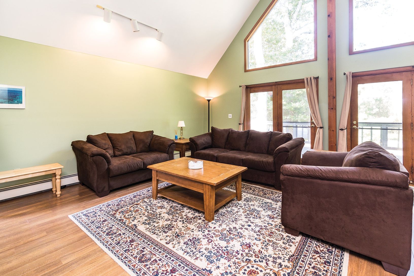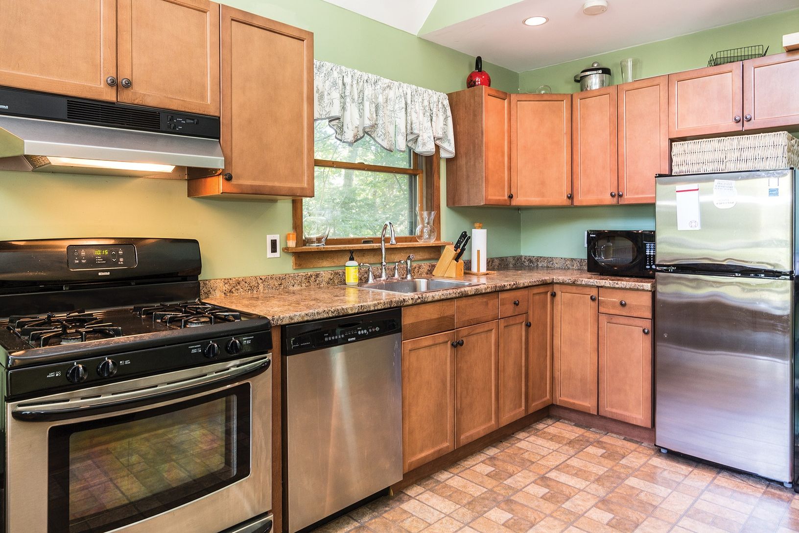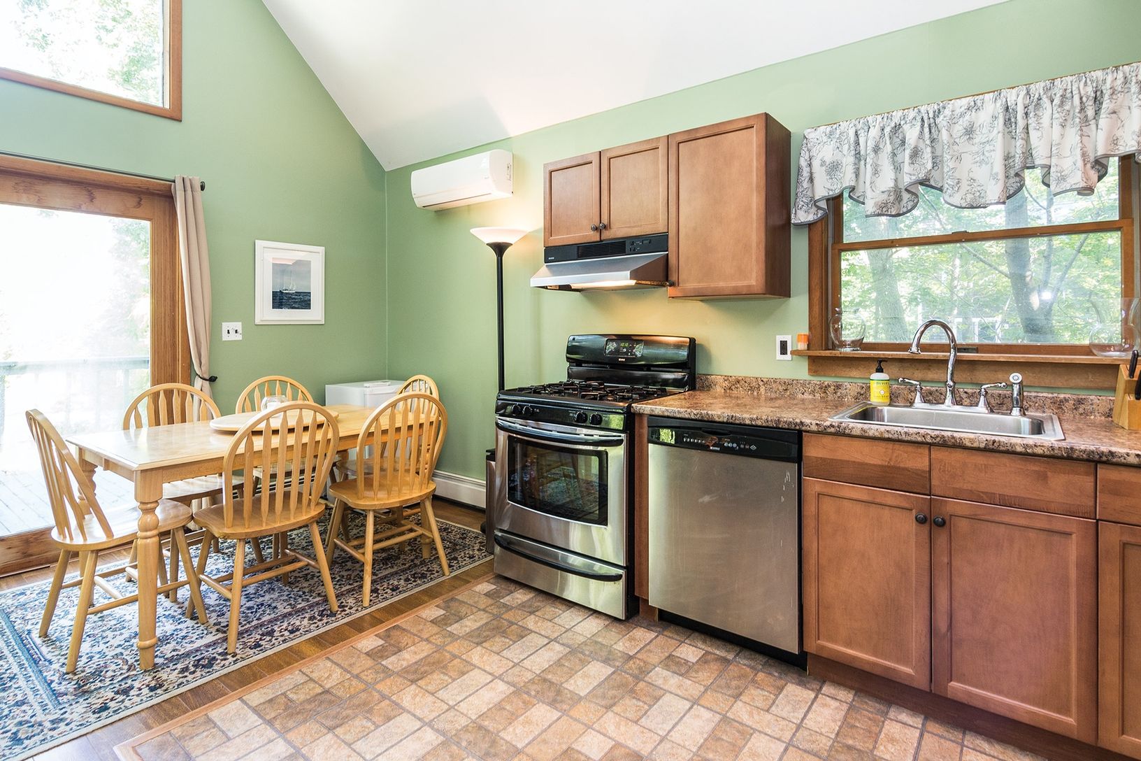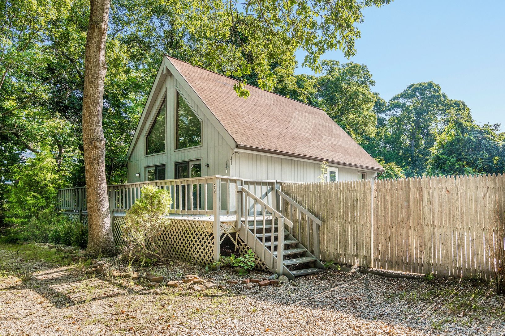 Charming Adirondack-style home on a third of an acre newly available for sale for an amazing price. Located on a quiet street in bucolic Springs, near bay beaches and Three Mile Harbor, the home provides 1,400+/- sq. ft. of living space, with three bedrooms and two baths. Open first floor living areas flow from the light-filled living room with cathedral ceiling and glass doors to a wraparound deck, a dining area and kitchen with stainless ste