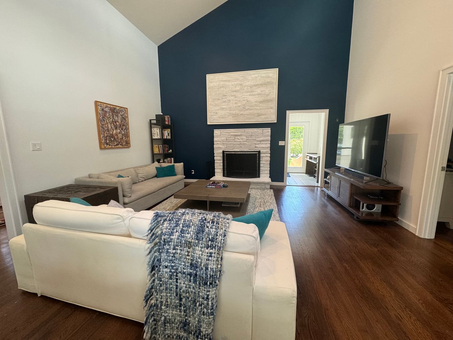This stunning 4BR/3BA contemporary is bright and airy with dramatic 25-ft cathedral ceilings, skylights, gorgeous natural light, stone fireplace, and huge loft-like great room leading out to spacious deck and yard beyond, with heated pool and large bluestone patio among mature trees. Large kitchen with center island/breakfast bar and sliders to deck for seamless indoor/outdoor living/entertaining! Nestled on a wooded half-acre, south of the hi