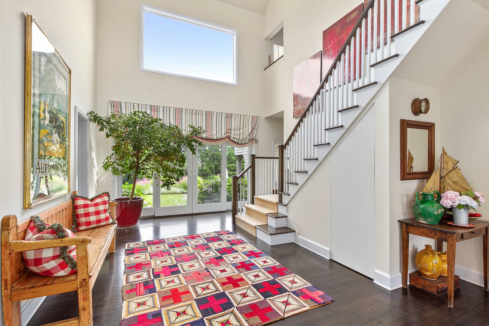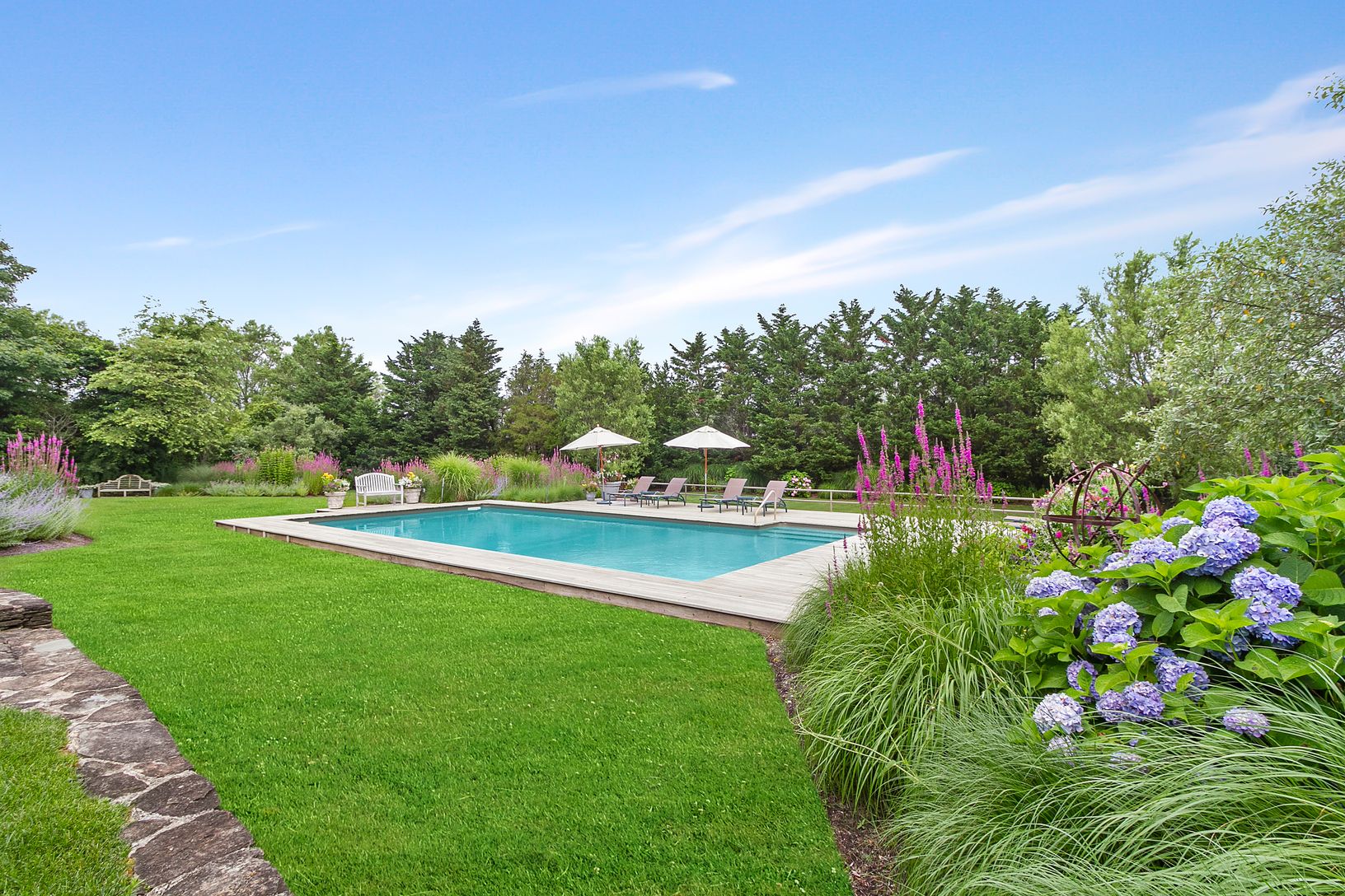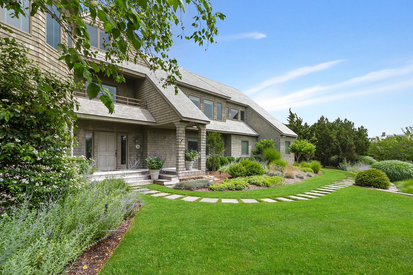 Quogue estate section. This turn-key cedar shake custom-built home is set on 1.1 secluded and magnificently landscaped acres. It’s location at the end of a cul-de-sac, south of Quaquanantuck Lane provides the utmost privacy at one of Quogue’s most sought after locations. The light filled open floor plan includes a spacious great room with vaulted ceilings, wood burning fireplace, sitting area, dining room, and kitchen. A staircase leads up t