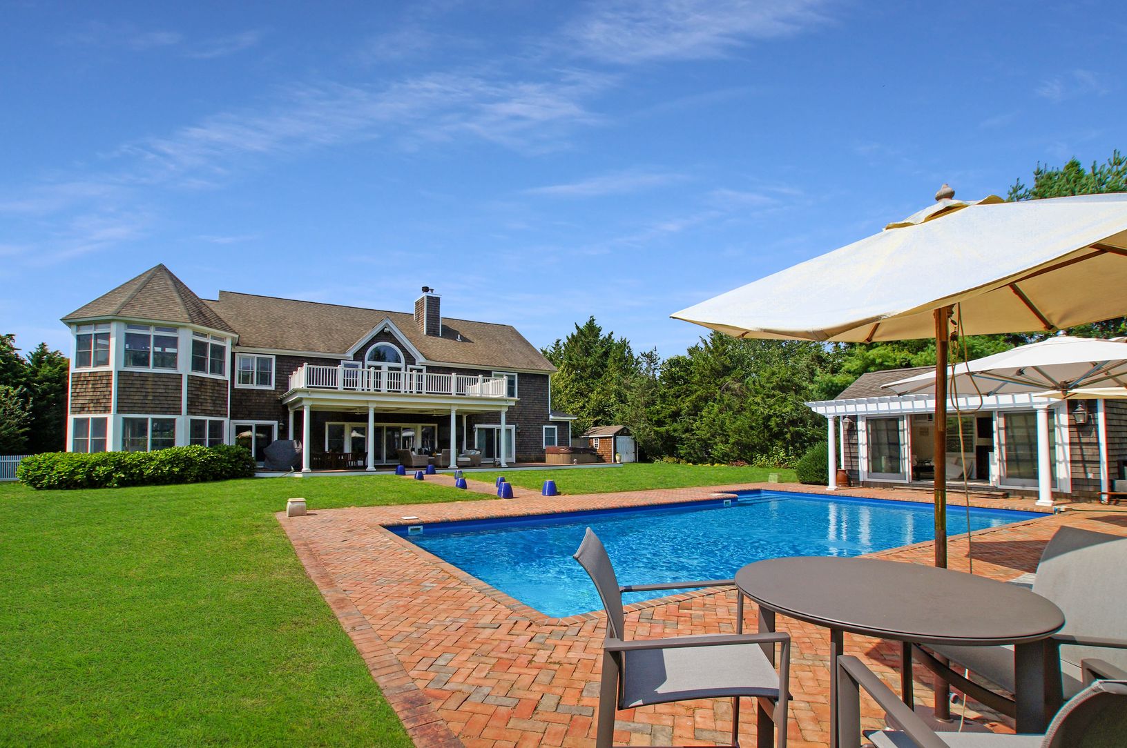 Summer living is a dream in this perfect Quogue Traditional. With 5 bedroom suites, including an extraordinary master with additional sitting room and oversized bath, there is room for everyone. High ceilings in the living room give a bright and airy feel, while the fireplace keeps it cozy. The oversized kitchen and separate formal dining room, along with the den for additional living space, make entertaining a breeze. Outside enjoy the covere