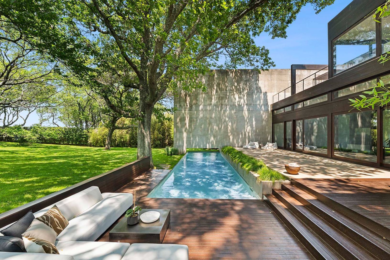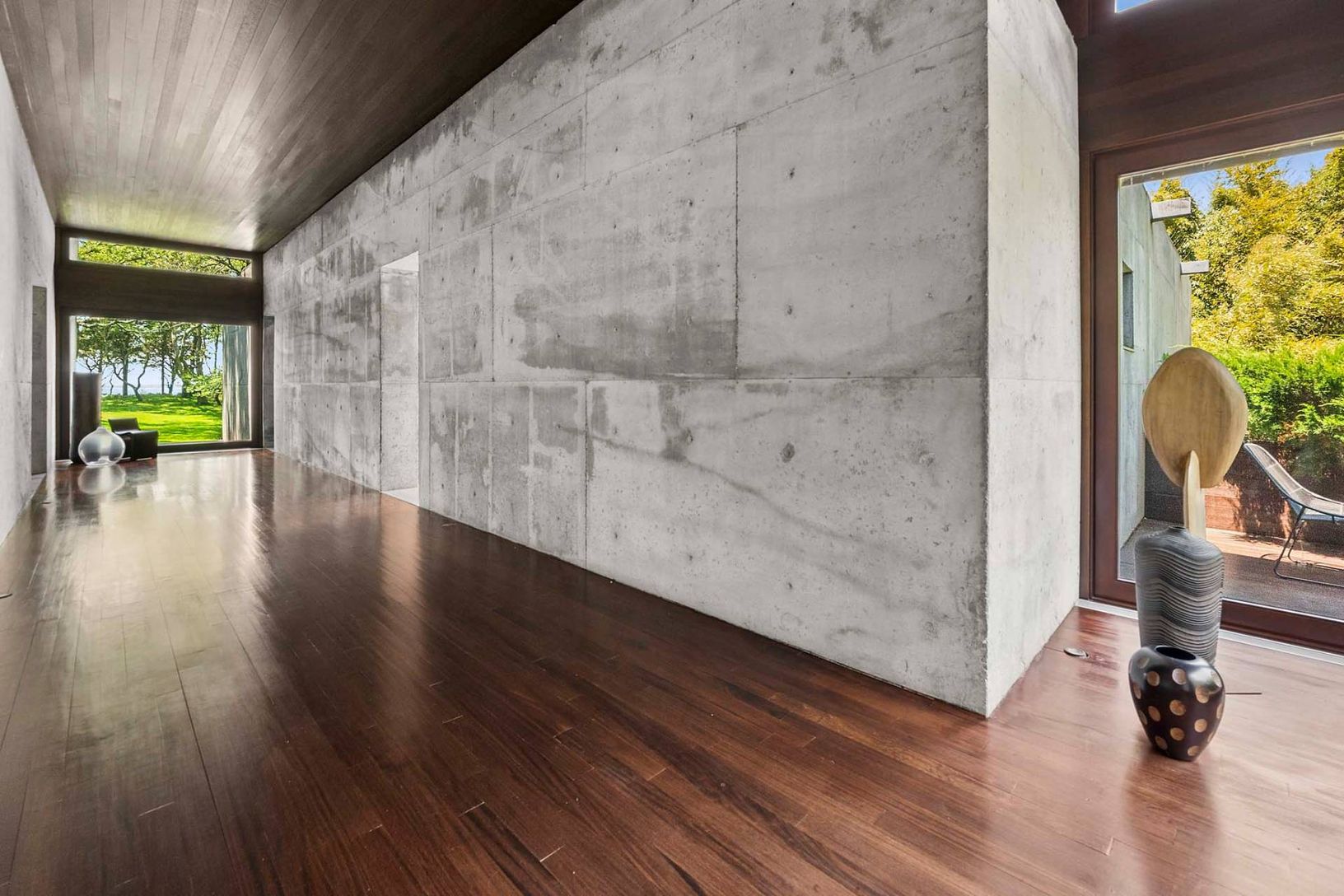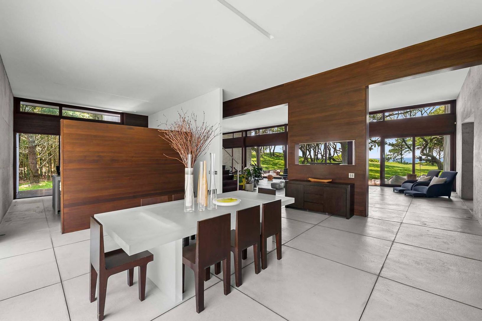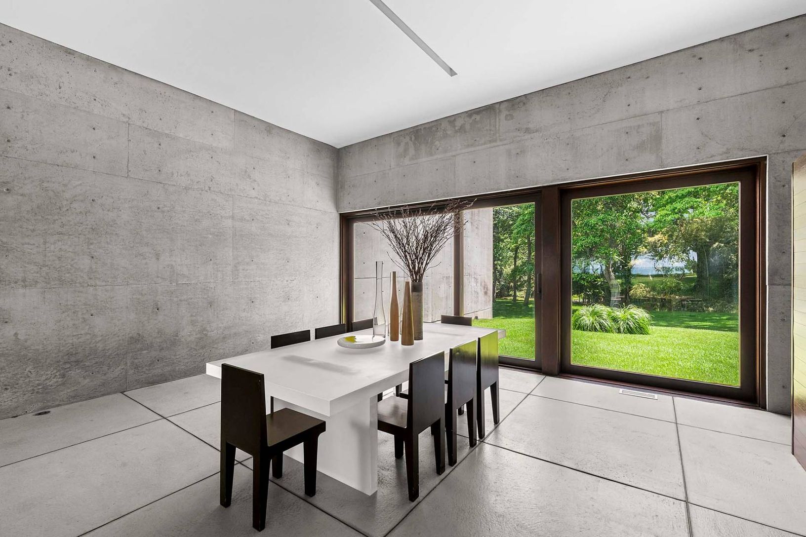 In a secluded setting in North Haven, this unique home offers sweeping views across pristine Noyac Bay to Shelter Island, as well as privacy among the trees on the two-acre property. The epitome of simple modern elegance, the home designed by architect William Reese in close cooperation with the homeowners is inspired by modernist design masters such as Tadao Ando and Rudolf Schindler. It employs simple lines and geometric shapes, executed in