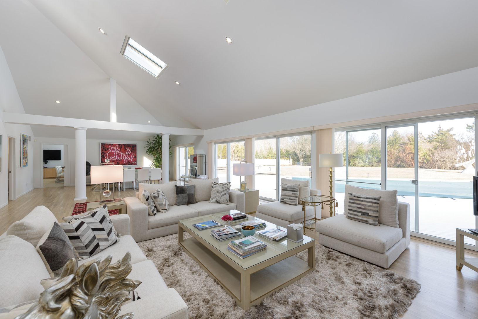 This beautifully renovated contemporary home is located 2 miles from Flying Point Beach and 2.5 miles from Southampton Village on 2.2+/- acres on a cul-de-sac in the quiet Water Mill. Featuring six en-suite bedrooms, an eat-in gourmet kitchen, a formal dining room, and a sun-filled great room. The finished lower level offers another ensuite bedroom, gym and wine cellar. Outdoors, enjoy the beautifully landscaped yard, heated gunite pool and ha