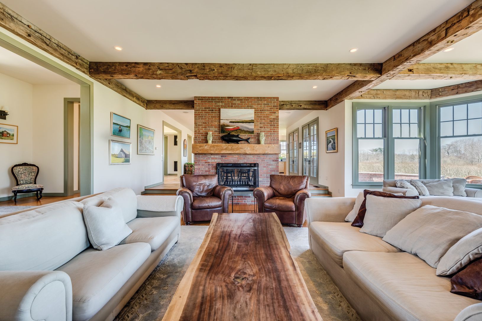 Enjoy this light filled home nestled in the heart of the stunning Sagaponack wine country. This beautiful six bedroom, four full and three and one-half bath custom home is just over 5,000+/- sq. ft. The open plan living spaces are great for gathering and entertaining while enjoying some of the most spectacular sunset views on the East End. The sunken living room with beamed ceilings shares a double-sided fireplace with the dining area and high
