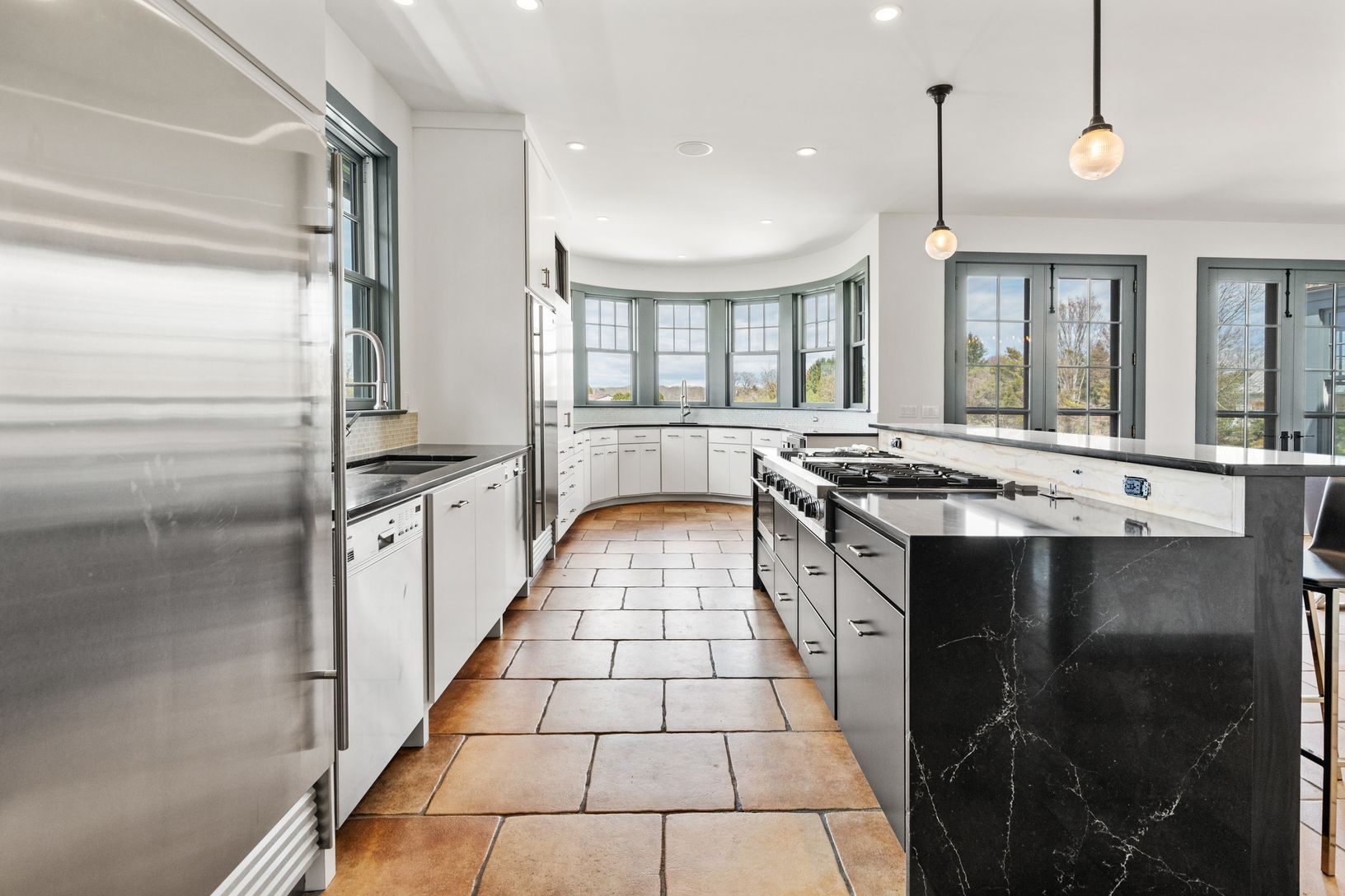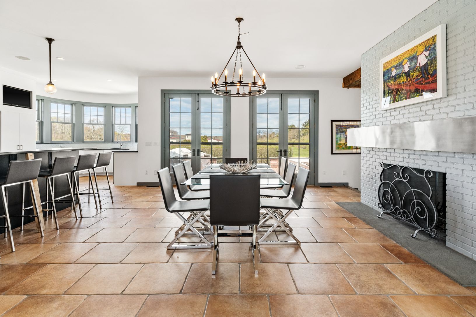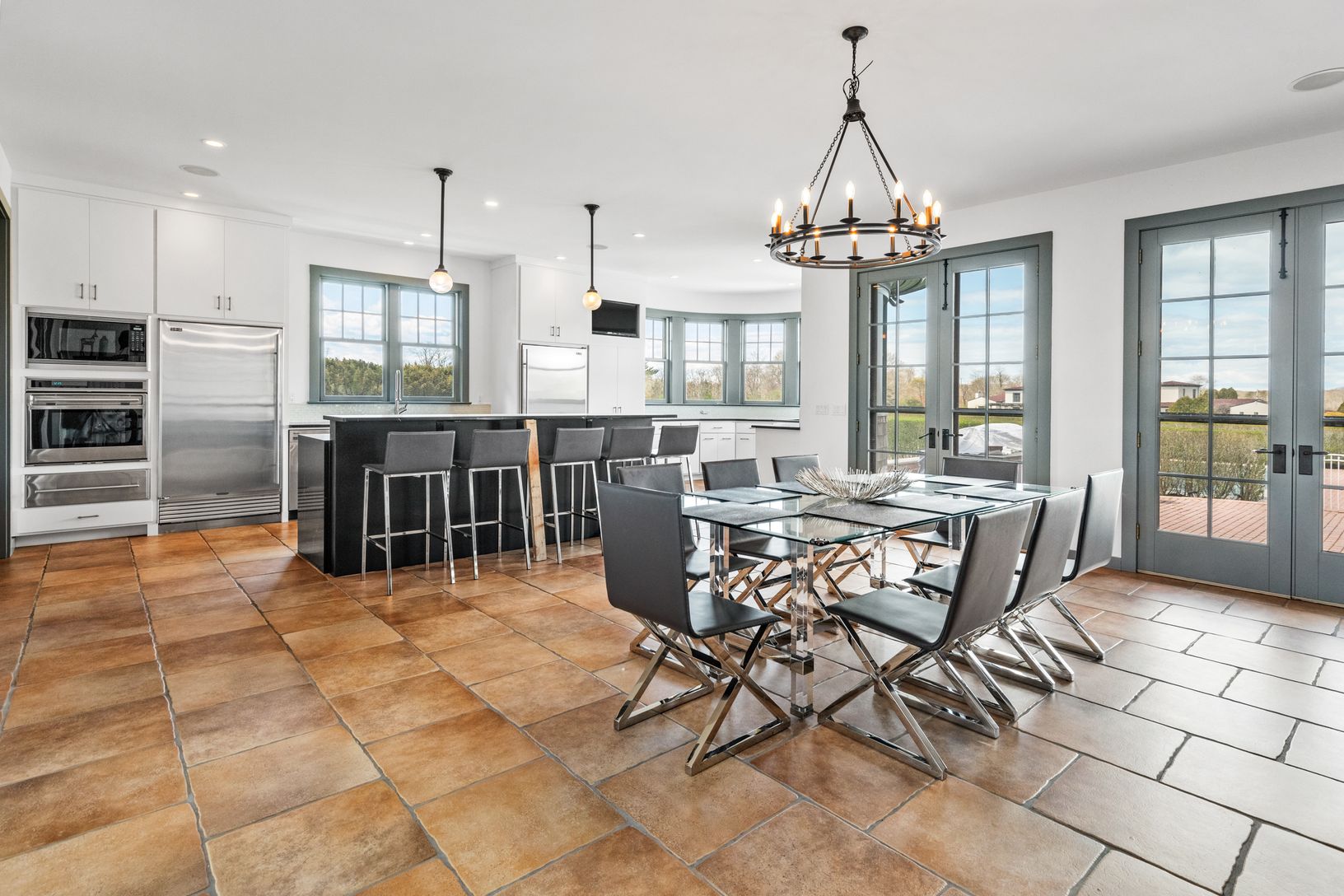 Classic 6 bedroom traditional with its oversized Gunite pool and pickleball/tennis court on almost 5 acres of open land, offering magnificent sunset and water views. French doors lead out to a walled patio, with a huge outdoor kitchen. Entertaining is a breeze with the multiple indoor and outdoor gathering areas. There is also a 3-car garage. The professional kitchen and dining room is open to a double-sided fireplace that is shared with a sun