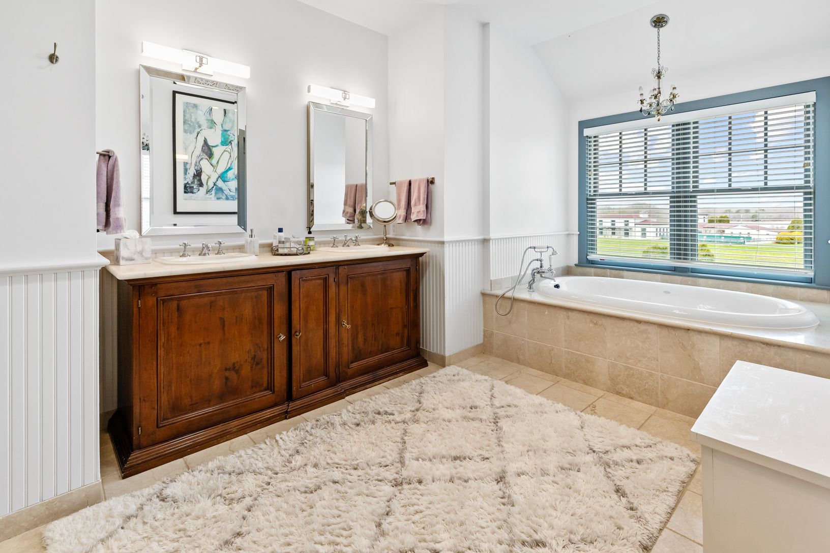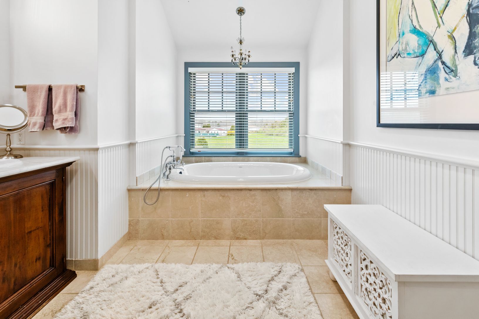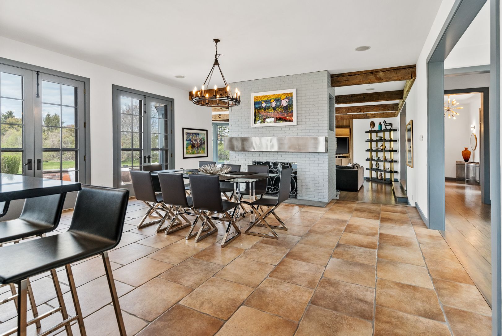 Classic 6 bedroom traditional with its oversized Gunite pool and pickleball/tennis court on almost 5 acres of open land, offering magnificent sunset and water views. French doors lead out to a walled patio, with a huge outdoor kitchen. Entertaining is a breeze with the multiple indoor and outdoor gathering areas. There is also a 3-car garage. The professional kitchen and dining room is open to a double-sided fireplace that is shared with a sun