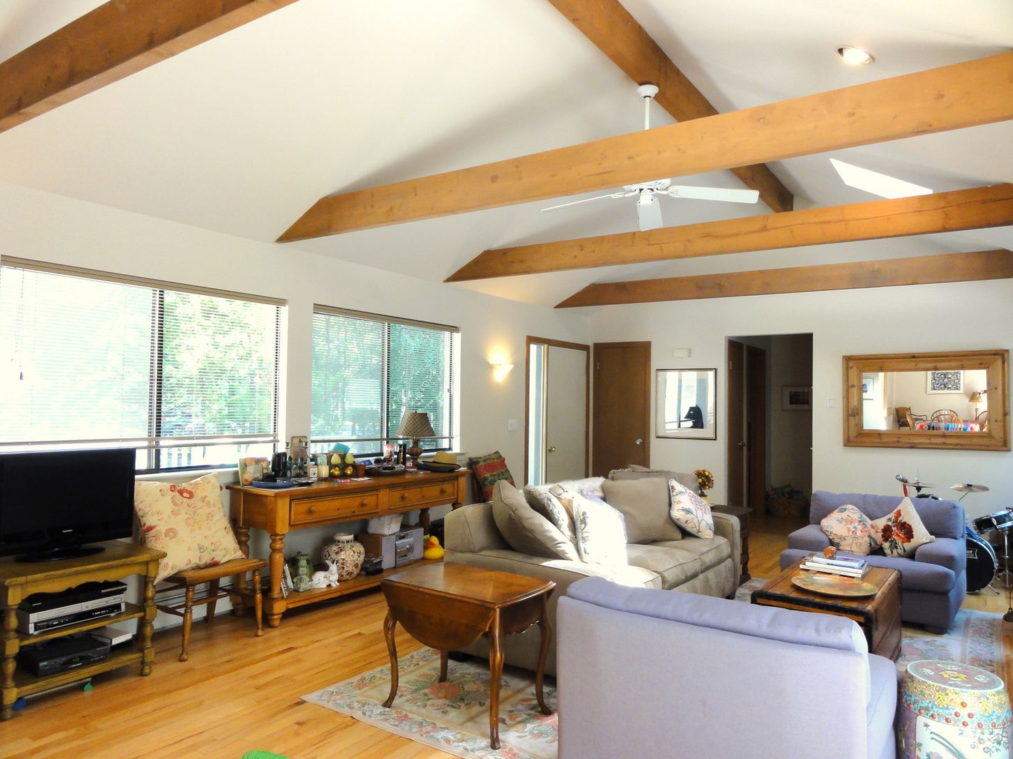 Brand new to the market, this bright, single-level 3 bedroom/ 2 bath contemporary is just minutes from the Village of East Hampton in the very near Northwest Woods. Extraordinarily large wooded property of over .75 of an acre holds terrific potential for expansion for house, pool, poolhouse and more! There's a woodburning fireplace,vaulted, beamed ceiling in living room with skylights, airy eat-in kitchen and a generous deck across the entire
