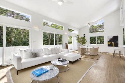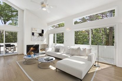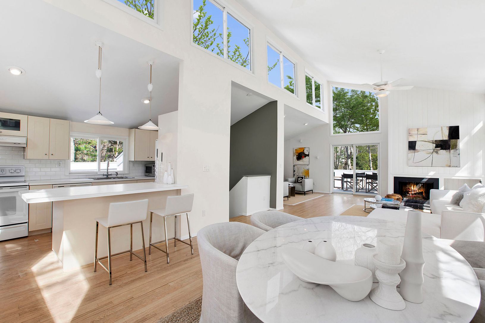 Nestled in East Hampton's sought after Settlers Landing area, this stunning updated modern contemporary is located just around the corner from Sammy's Beach. Bright and sunny open living spaces accentuate 4 bedrooms and 2 and a half baths with a sleek, open eat-in kitchen flowing into the spacious dining area. With cathedral ceilings and walls of windows, the living room seamlessly connects with the natural environment to create a feeling of l