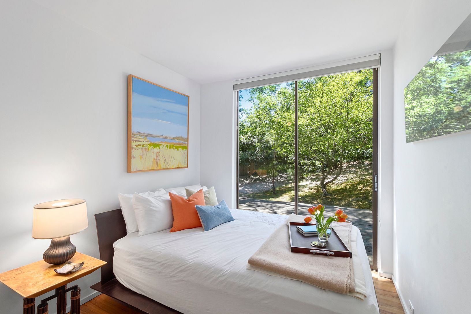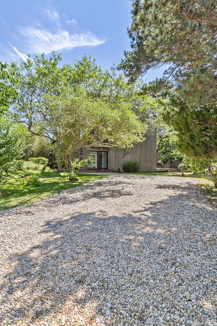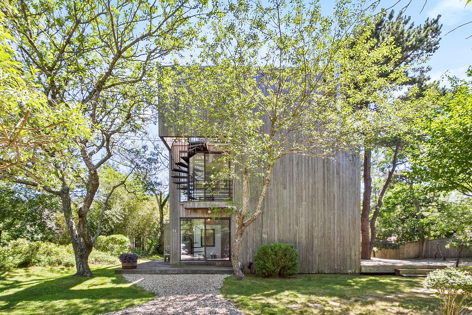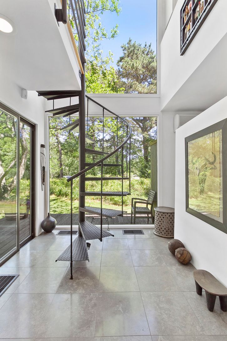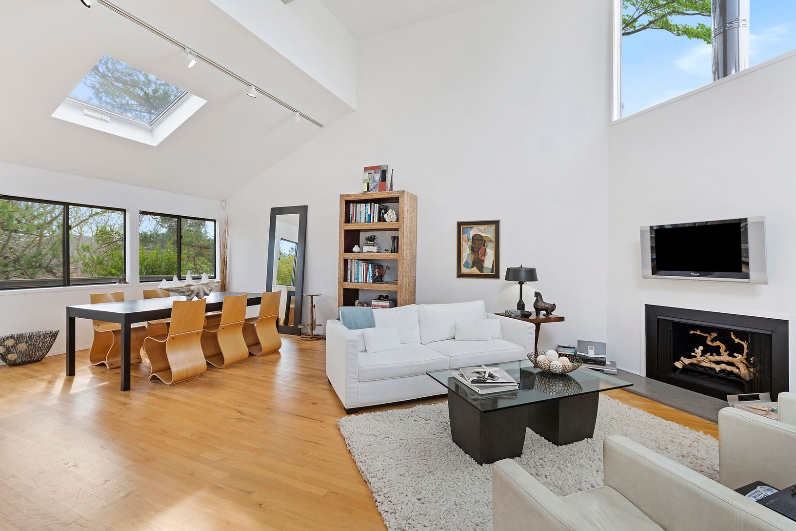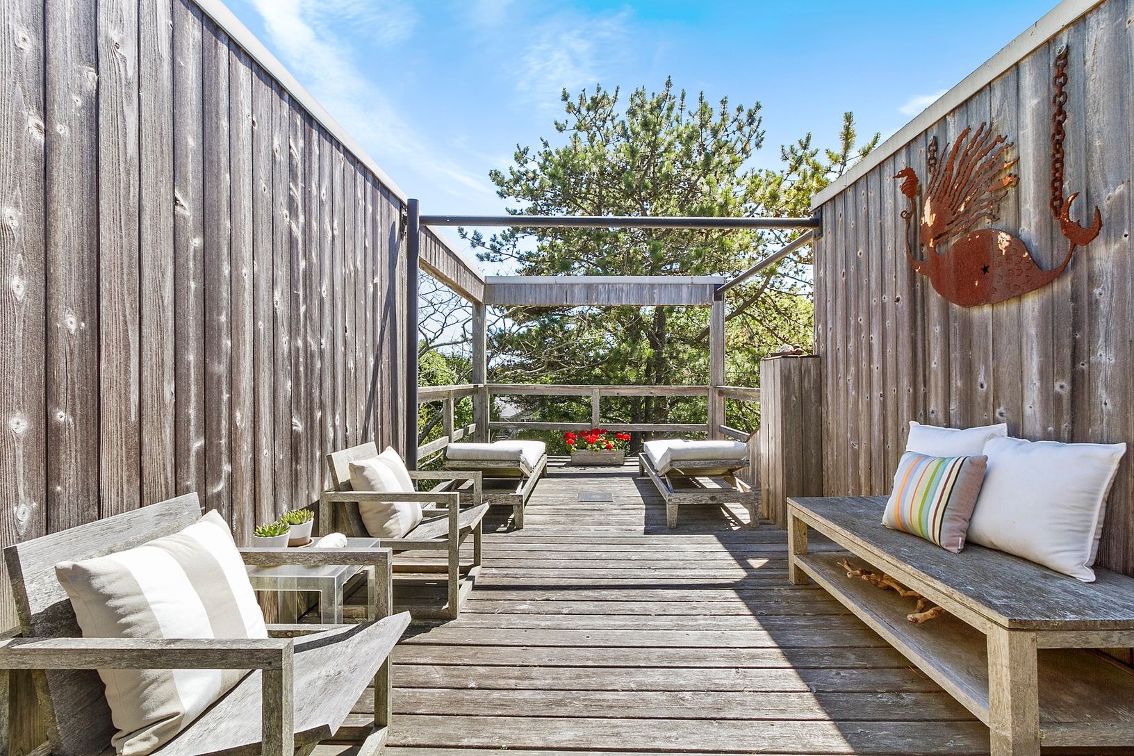 Easy living at this designer renovated modern beach house in the Amagansett Dunes. Light and bright with panes of glass and multi-level decks that bring outside indoors. The main living area has double height ceilings, sleek lines and an open floor plan. The living room has a fireplace with limestone hearth and opens to dining area and kitchen. The chef's kitchen has stone countertops and top of the line stainless steel appliances, Sub Zero r