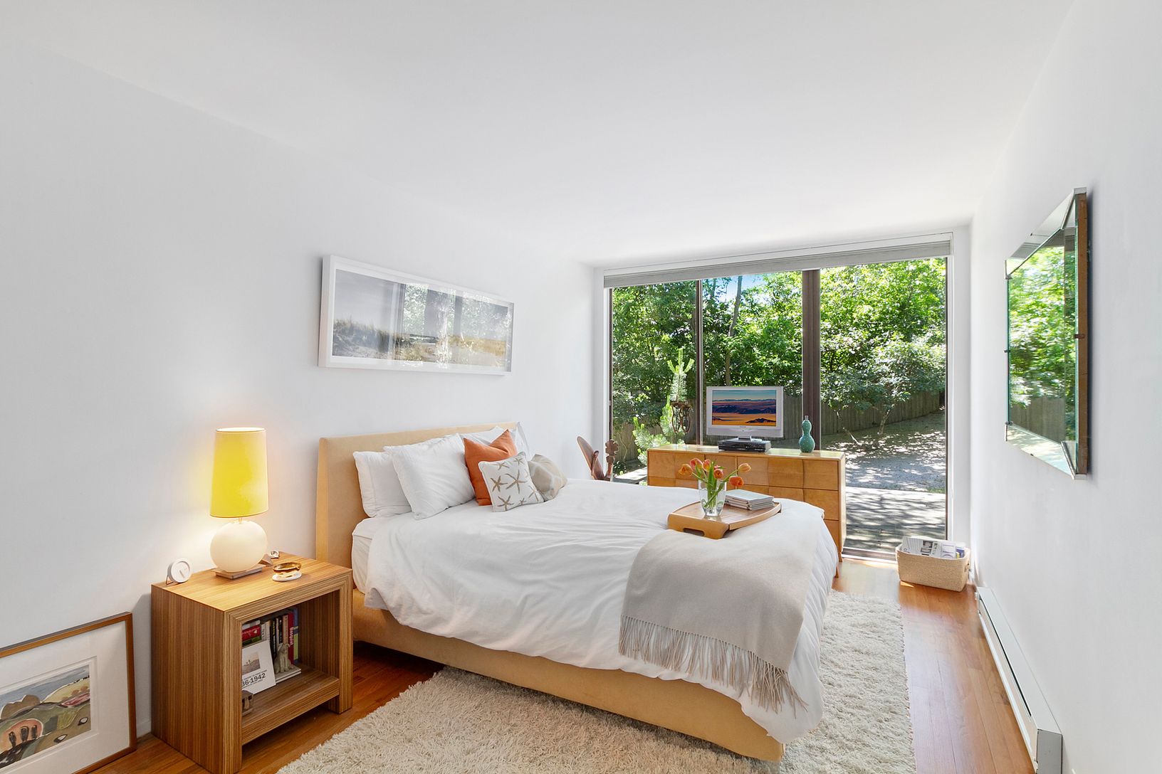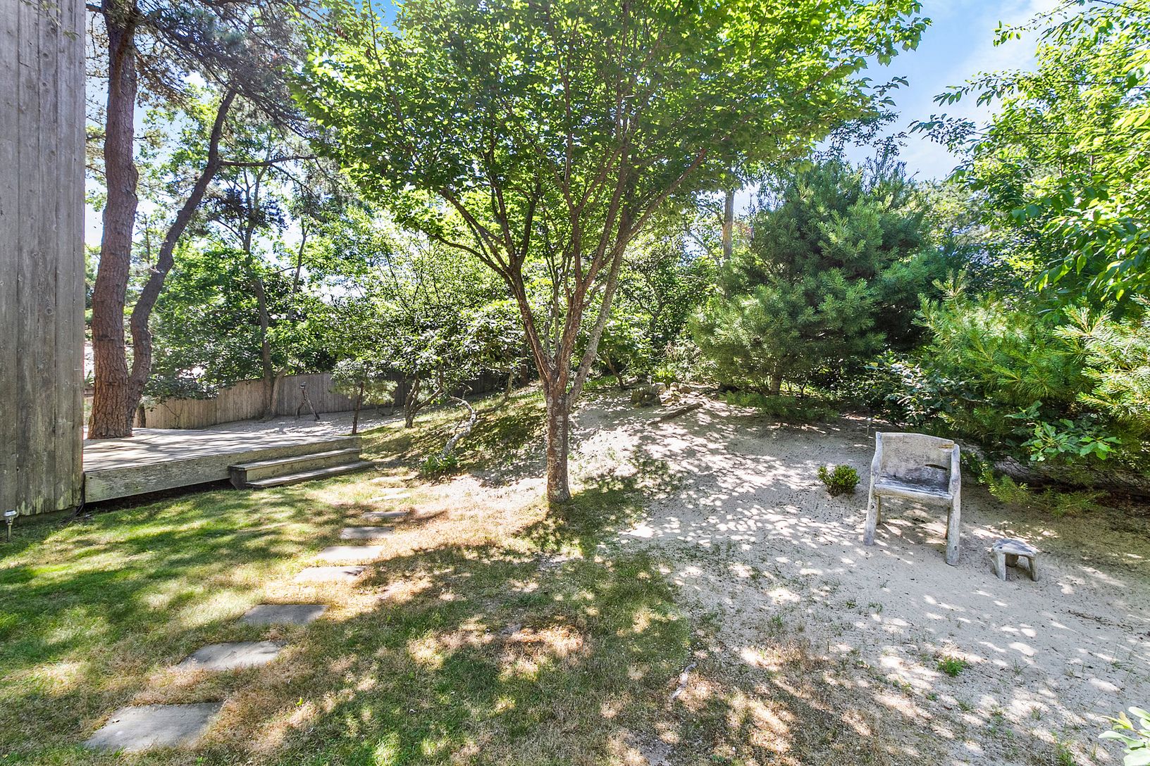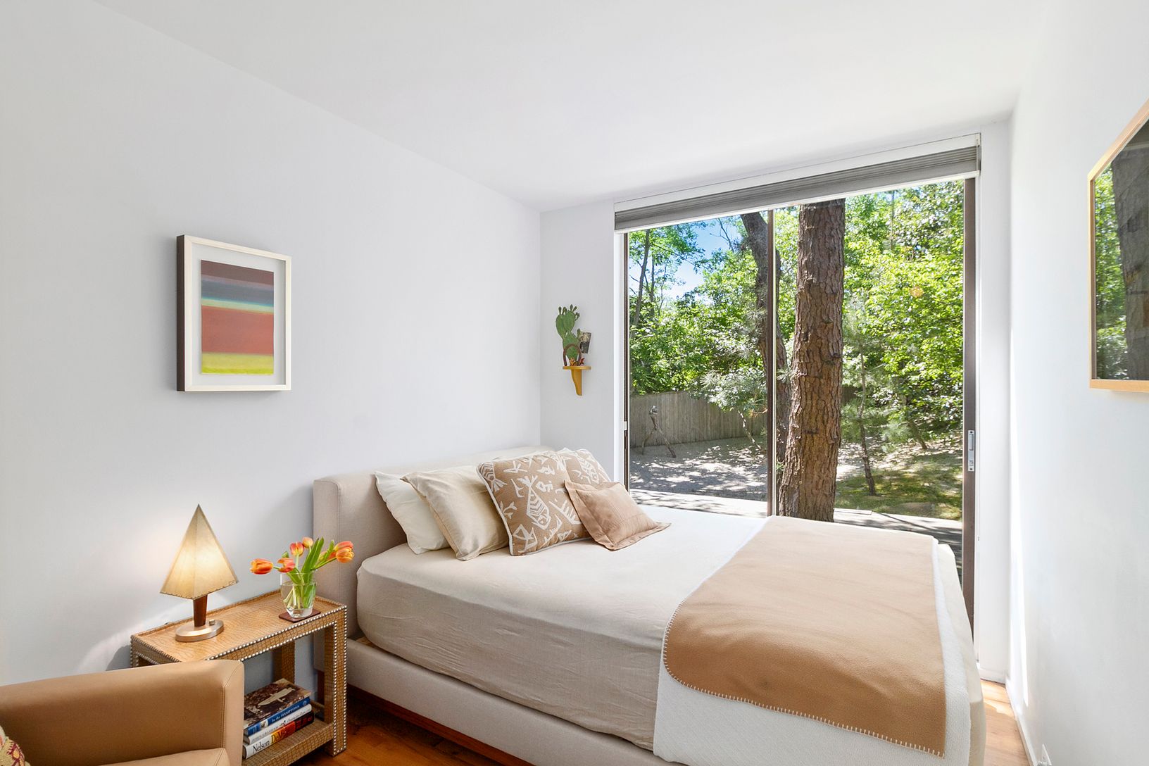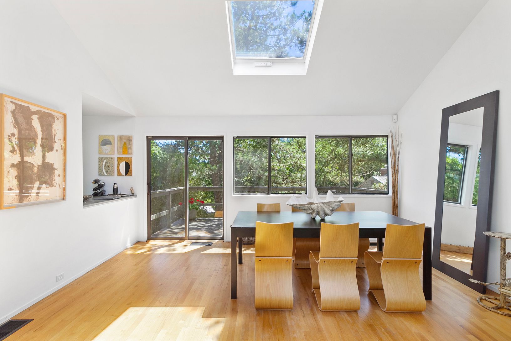Easy living at this designer renovated modern beach house in the Amagansett Dunes. Light and bright with panes of glass and multi-level decks that bring outside indoors. The main living area has double height ceilings, sleek lines and an open floor plan. The living room has a fireplace with limestone hearth and opens to dining area and kitchen. The chef's kitchen has stone countertops and top of the line stainless steel appliances, Sub Zero r