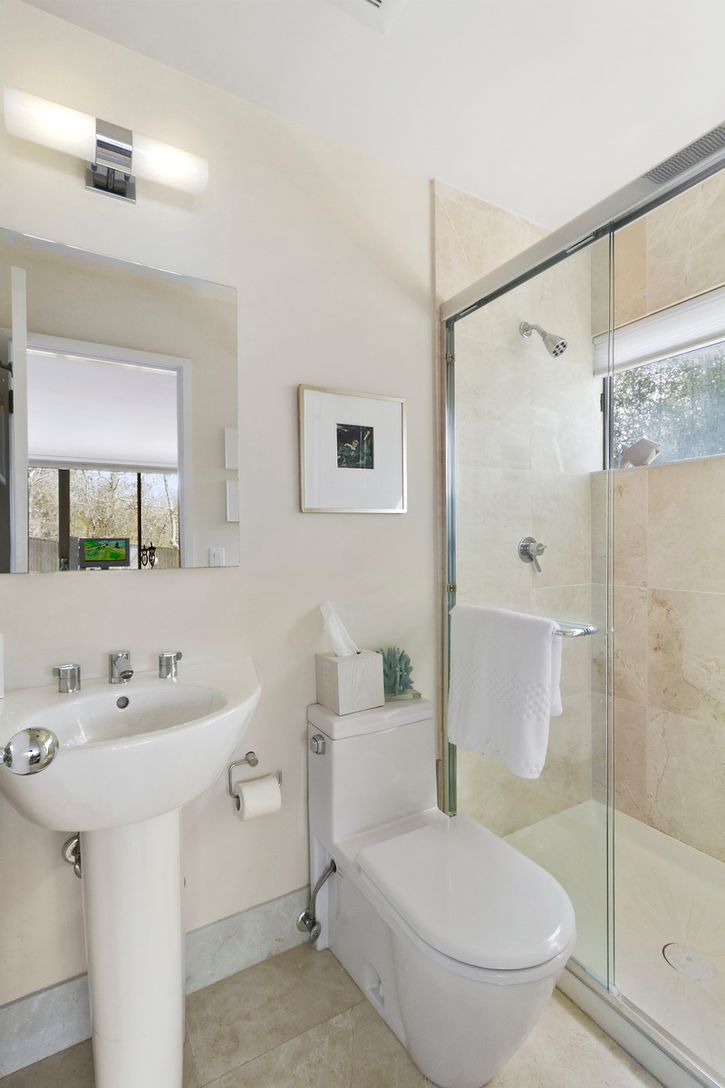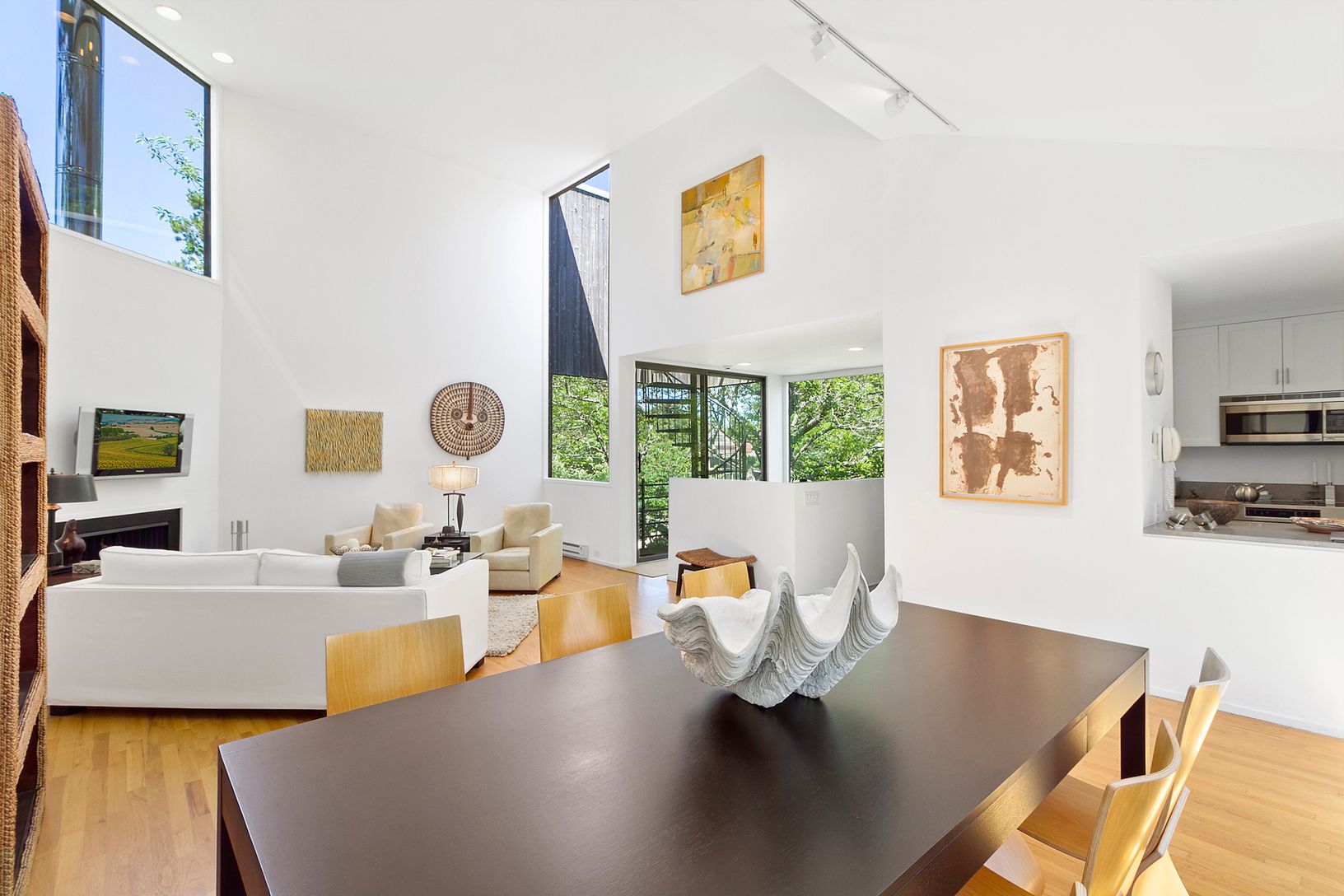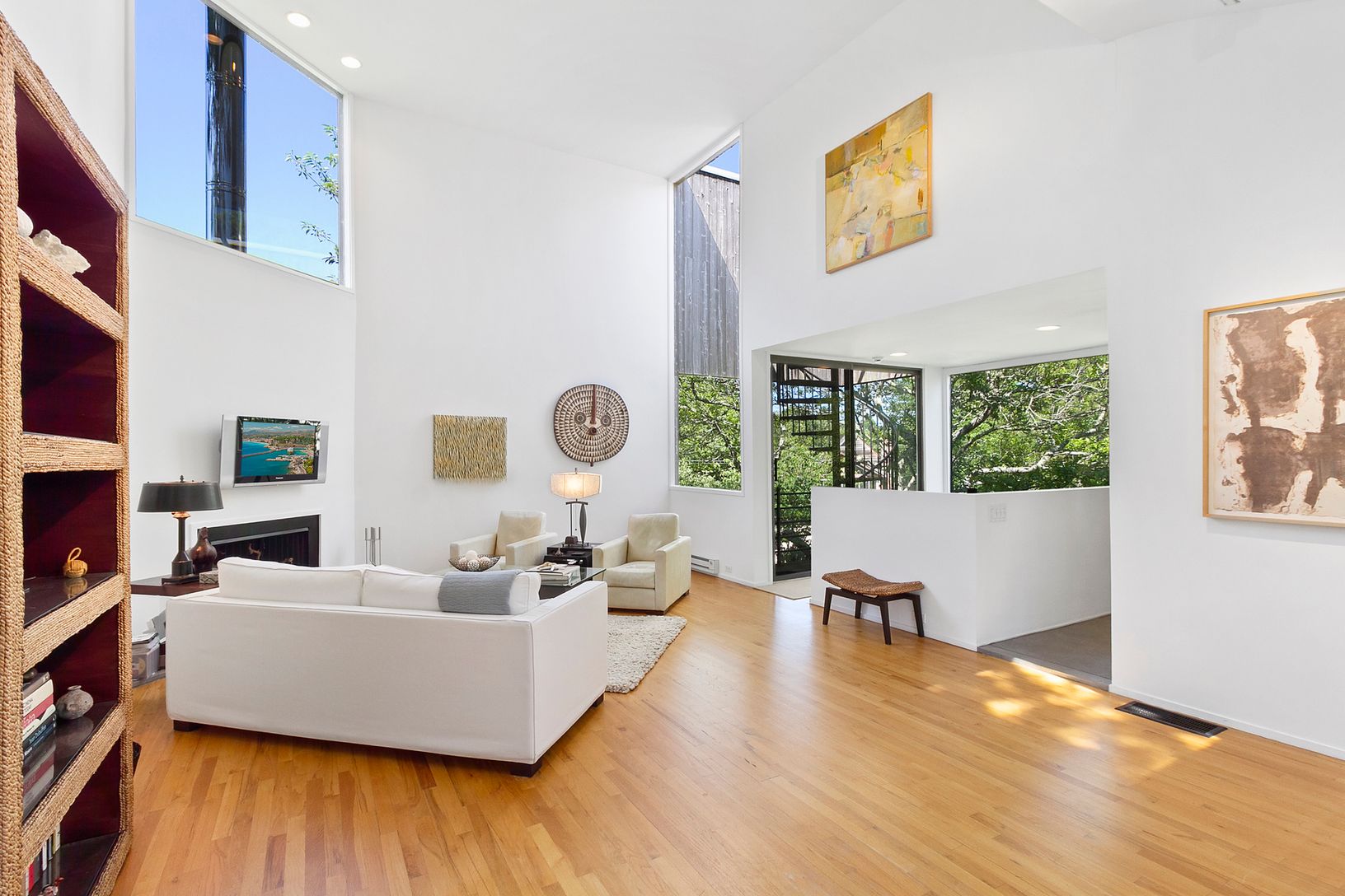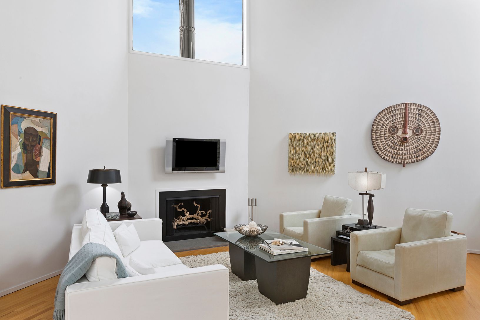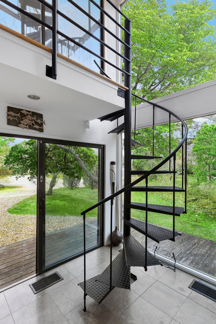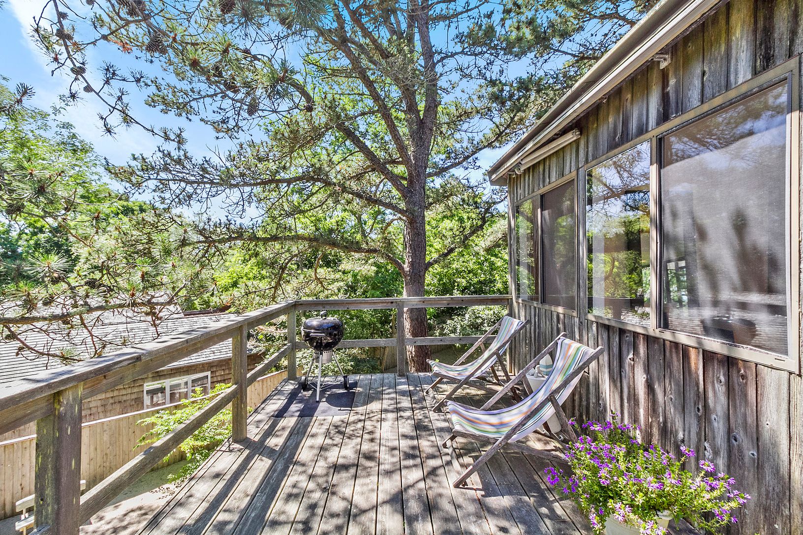 Easy living at this designer renovated modern beach house in the Amagansett Dunes. Light and bright with panes of glass and multi-level decks that bring outside indoors. The main living area has double height ceilings, sleek lines and an open floor plan. The living room has a fireplace with limestone hearth and opens to dining area and kitchen. The chef's kitchen has stone countertops and top of the line stainless steel appliances, Sub Zero r