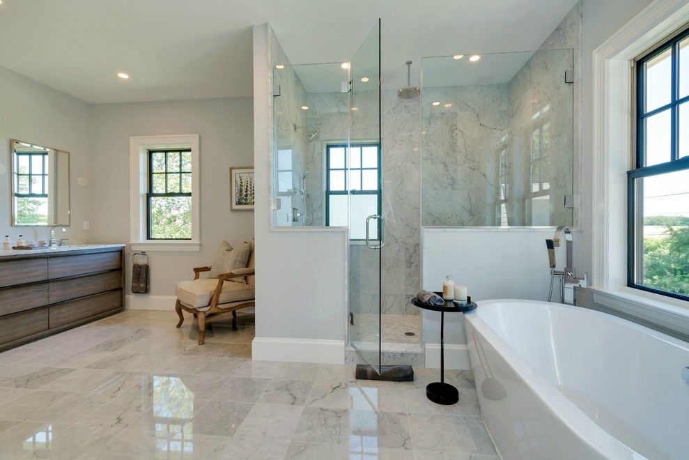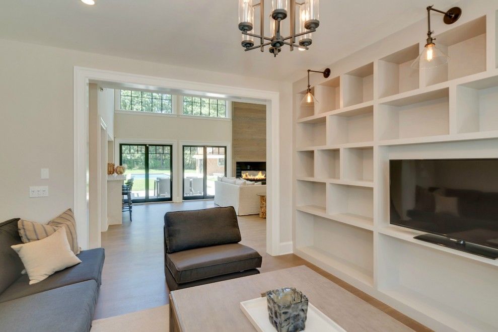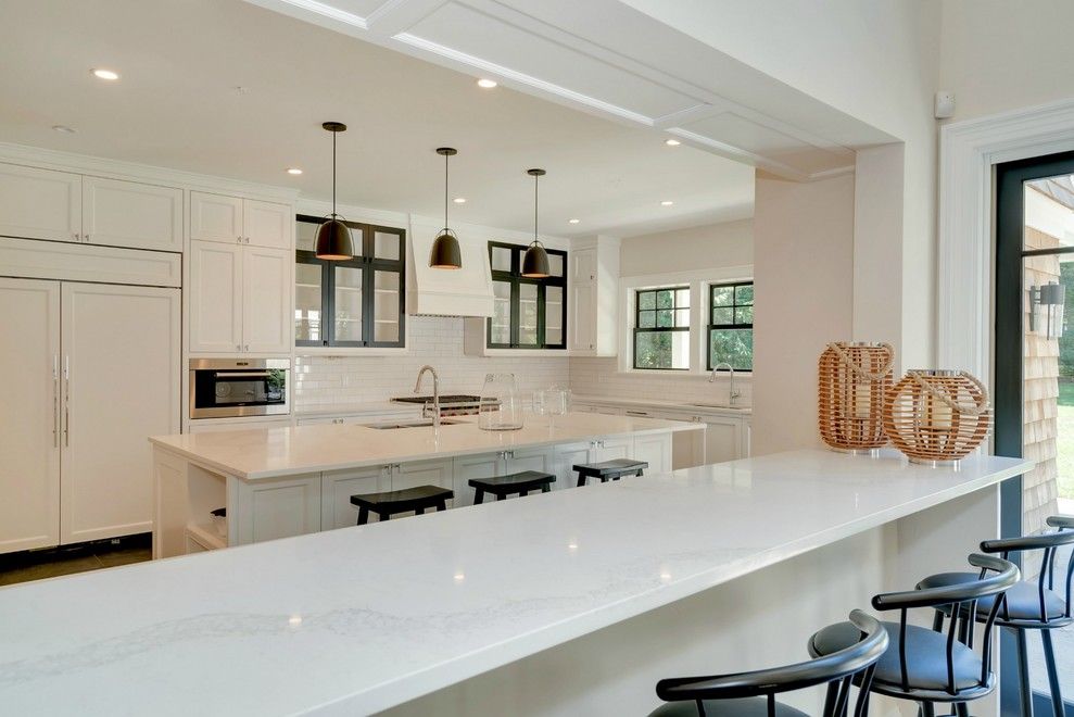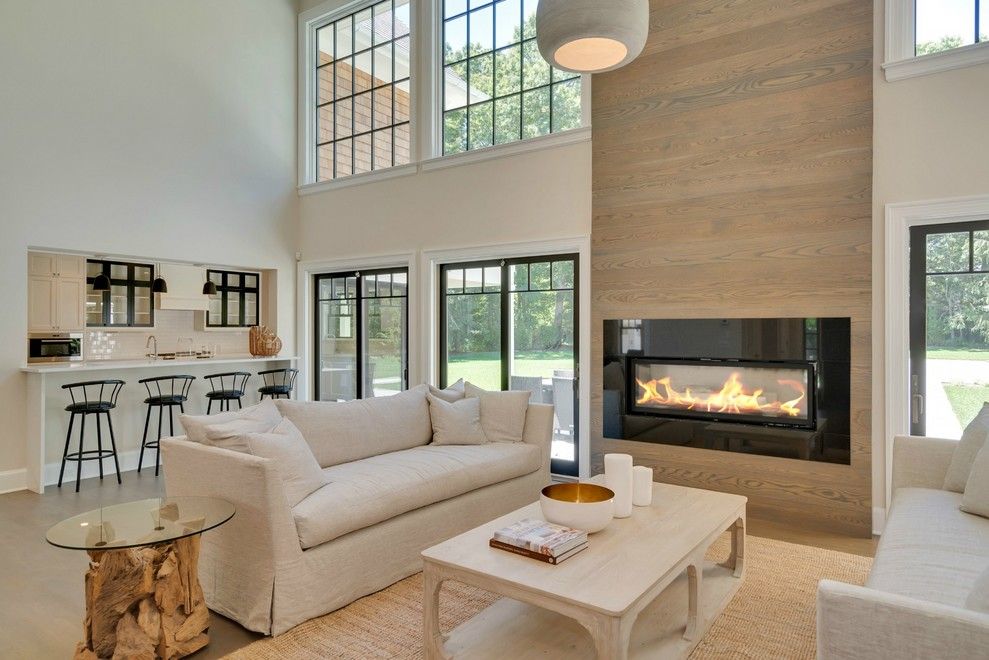 This regal new home checks all of the boxes. Located on 240 Blank Lane in Water Mill adjacent to open fields, the peaceful and quiet location affords easy access into both Bridgehampton and Water Mill. Recently completed, this 9,000+ square foot home is graced with a multitude of notable design elements by Brigit Klein Interiors. The focal point of the soaring, 2-story Great Room is a massive floor to ceiling fireplace treatment flanked by equ