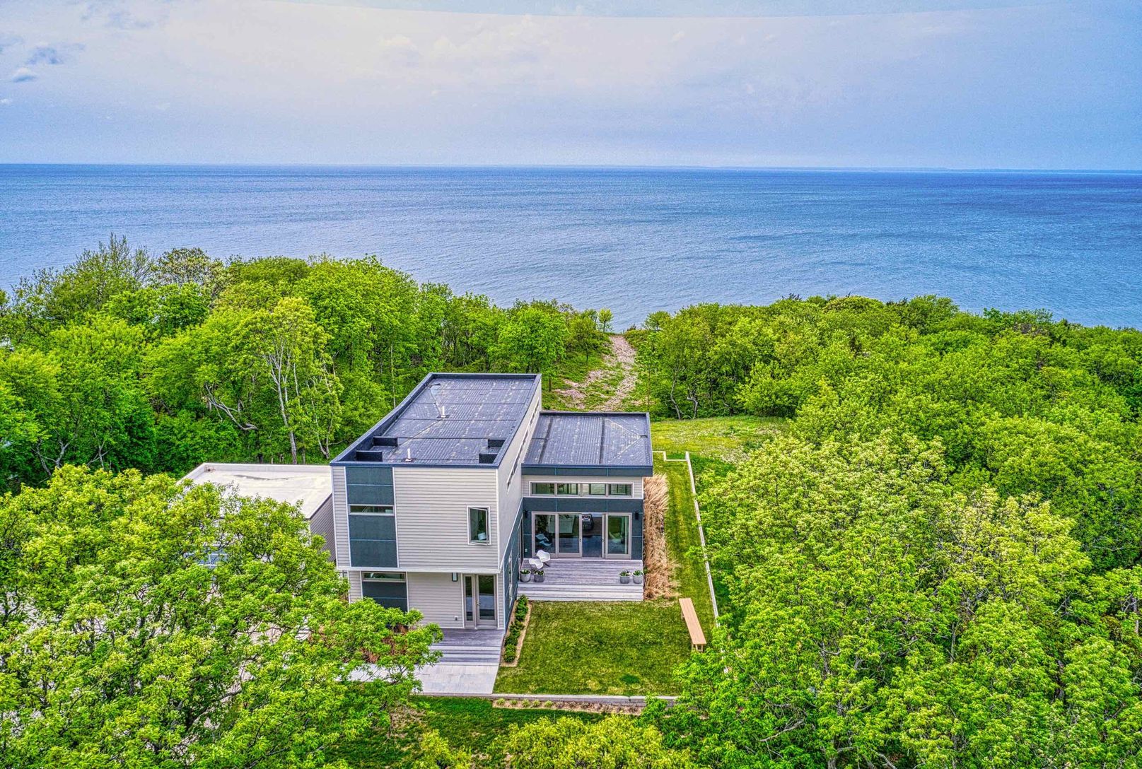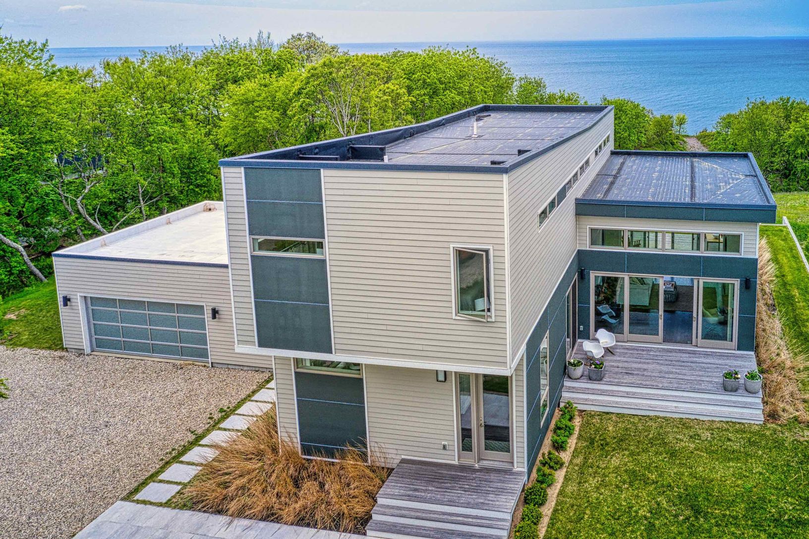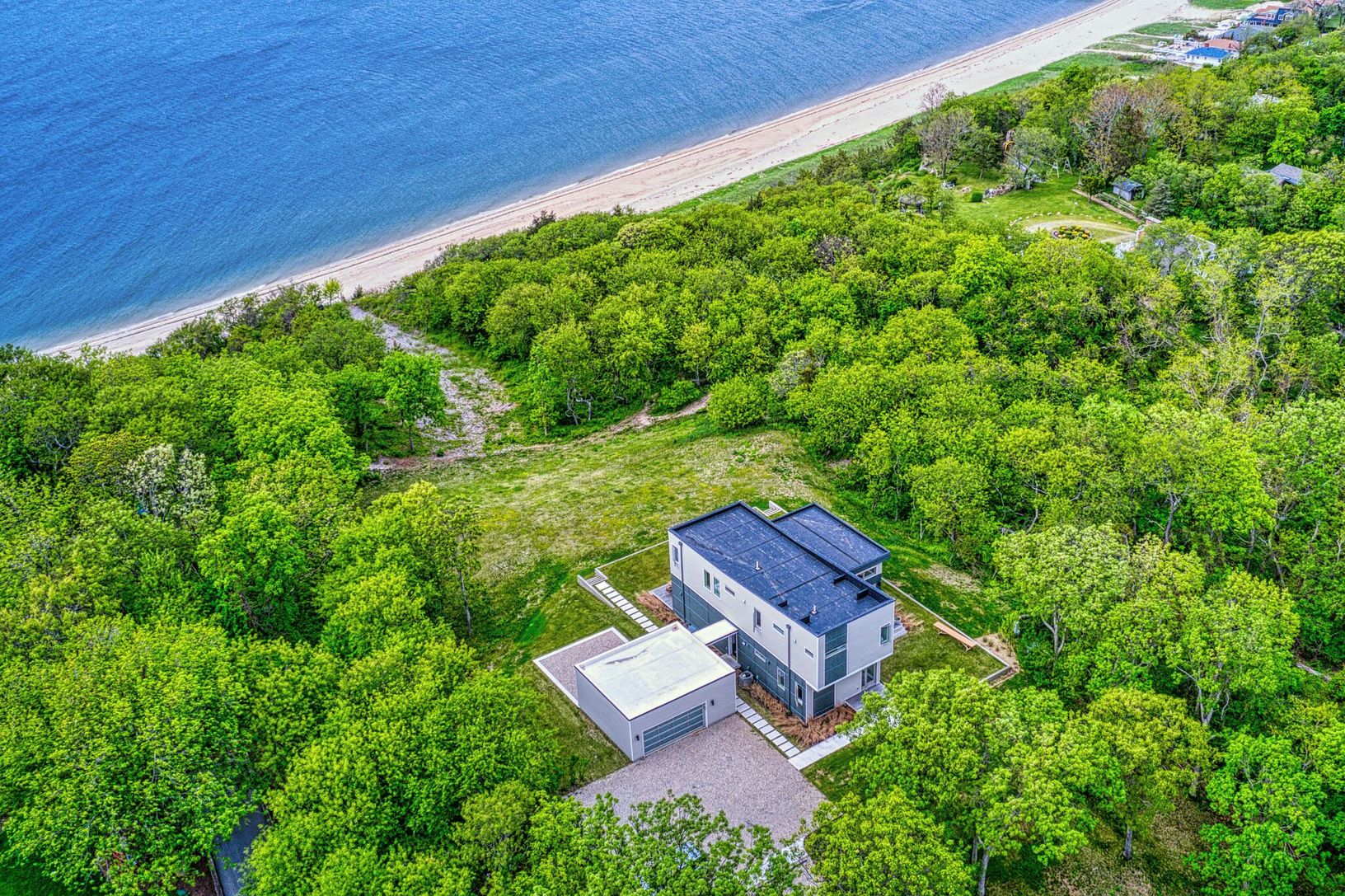 Enjoy beautiful North Fork sunsets from this, exquisitely built modern, light-filled waterfront home in Mattituck with 200 feet of sandy beach frontage. This Rarely found 5.3 acre waterfront estate is truly stunning. The home is beautifully positioned providing spectacular water views and surrounded by gardens, mature specimen trees and lots of room left for a tennis court, pool house, studio and many other possibilities including subdividing