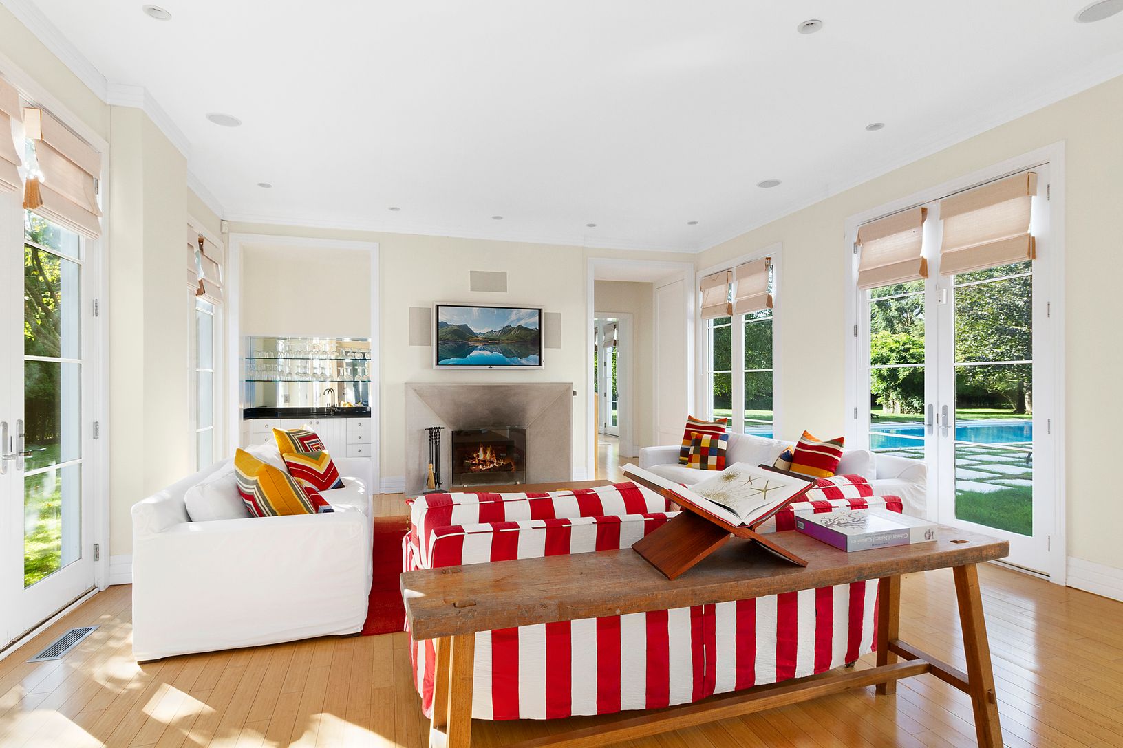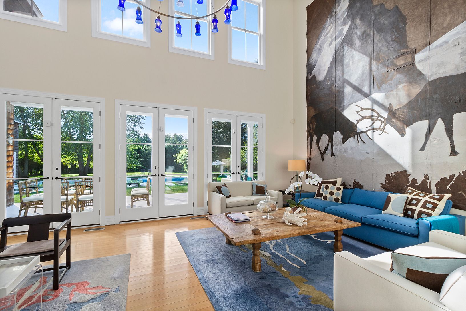 This modern residence, characterized by south-facing glass walls and soaring cathedral ceilings, exudes a relaxed ambiance. Classic design elements, complemented by rich stone accents and light wood finishes, span across 8,000 square feet of interior space, perfectly embodying the quintessential Hamptons lifestyle. An entry foyer welcomes you through a secluded, wisteria-covered entrance, accessed via a reclaimed barn door. Inside, a spacious