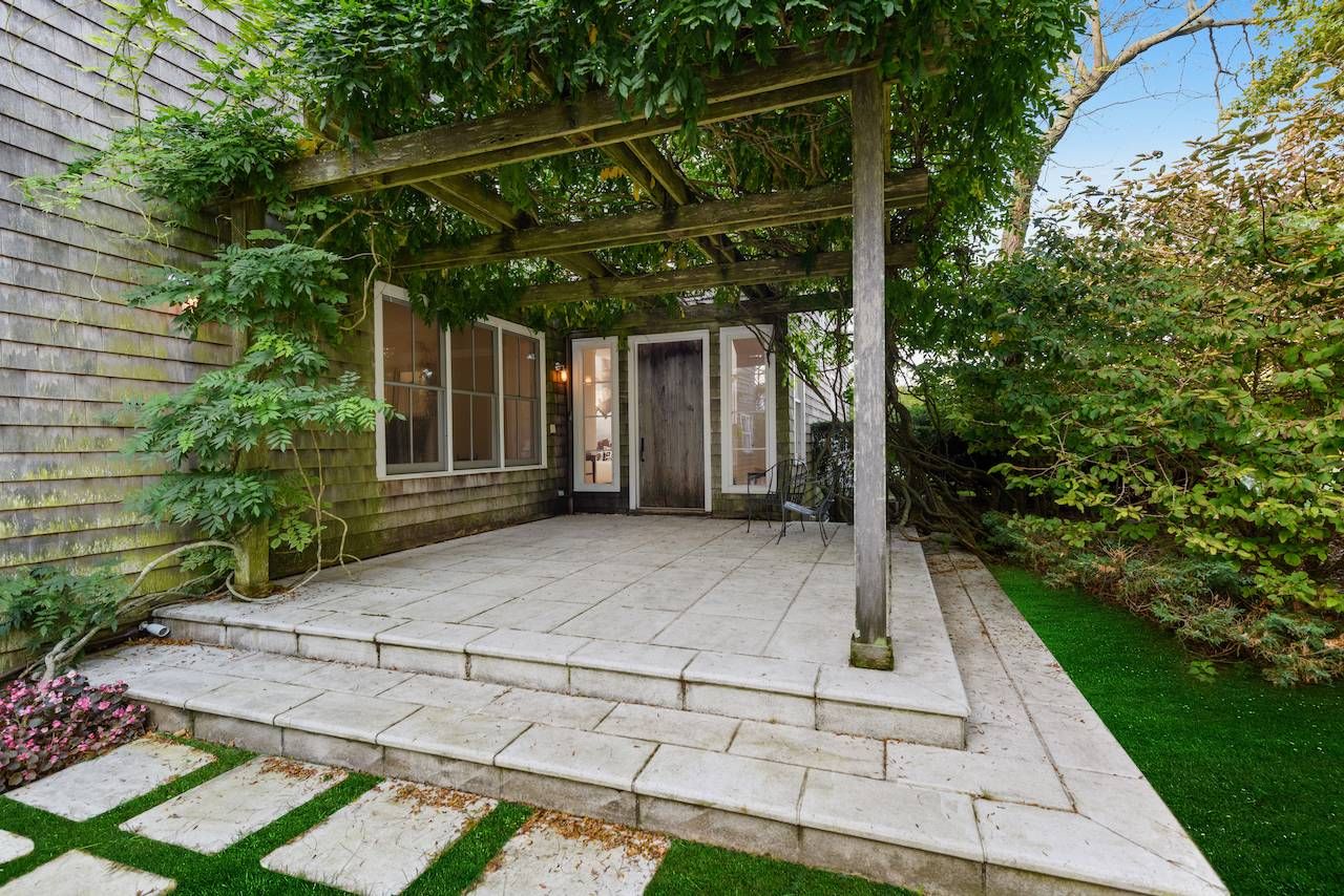 This modern residence, characterized by south-facing glass walls and soaring cathedral ceilings, exudes a relaxed ambiance. Classic design elements, complemented by rich stone accents and light wood finishes, span across 8,000 square feet of interior space, perfectly embodying the quintessential Hamptons lifestyle. An entry foyer welcomes you through a secluded, wisteria-covered entrance, accessed via a reclaimed barn door. Inside, a spacious