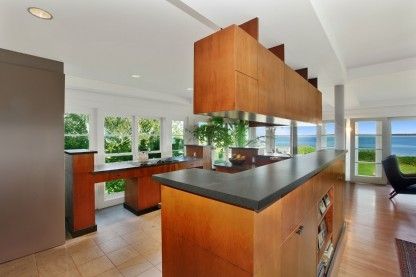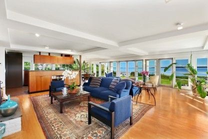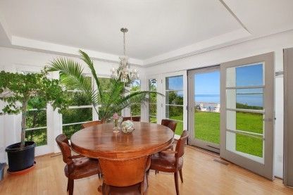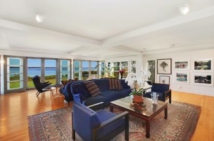 Outstanding panoramic water views across the open Bay are held from this Bauhaus style Contemporary with multi-level waterside decking and private stairs to the water and beach. The open interior offers continuous stunning water views throughout from the many glass French doors and windows. There are 4 bedrooms, office, 3 baths and 2 fireplaces. The expansive second floor balcony provides additional stunning water views and spectacular colors