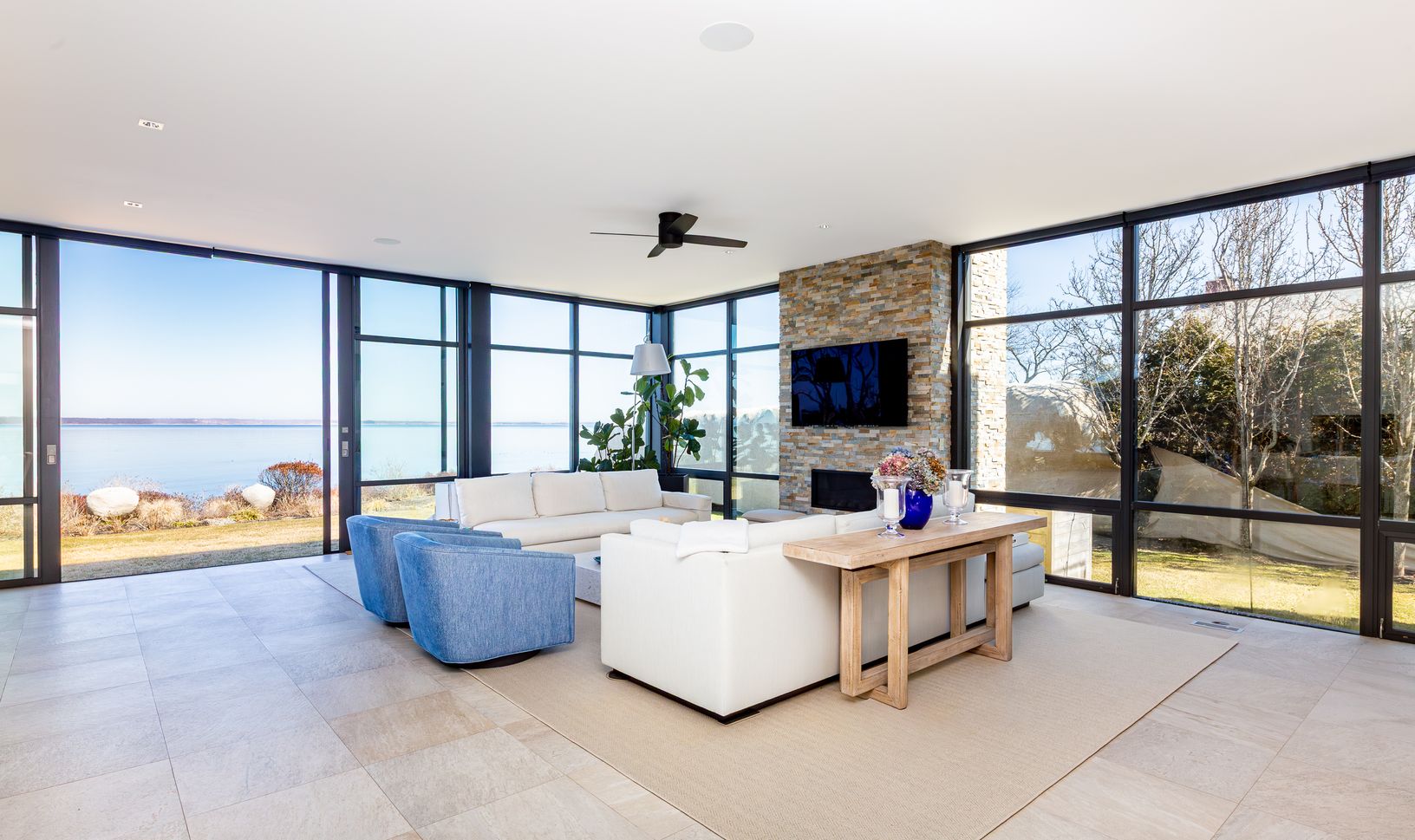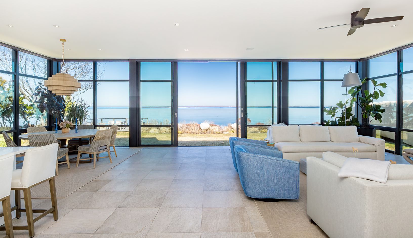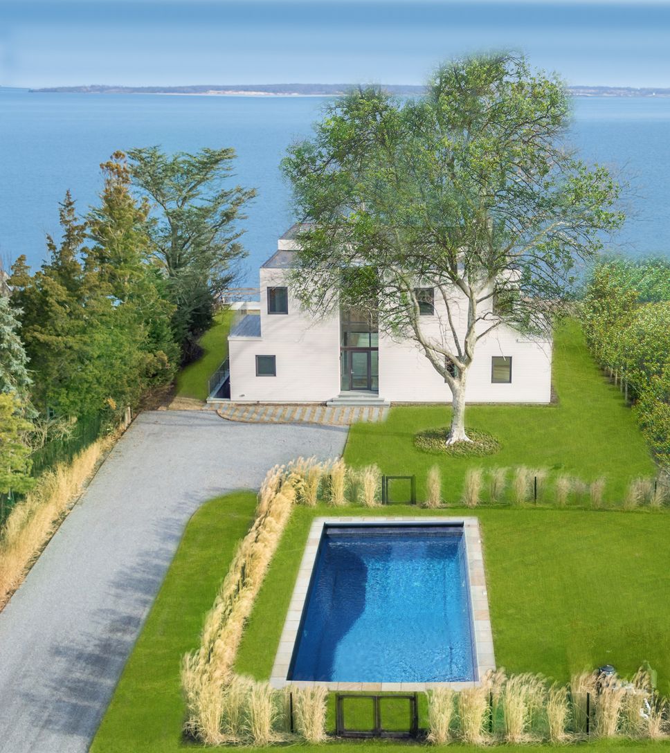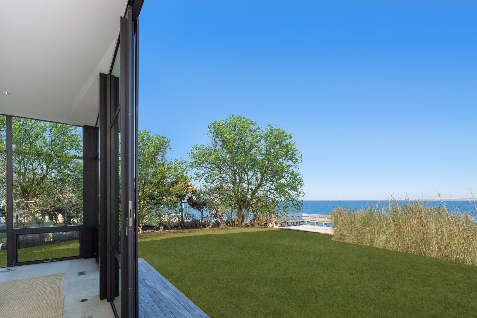 Escape to an ultra-private, newly and beautifully furnished beachfront retreat. This modern residence showcases sweeping open-bay vistas, walls of glass, and soaring double‑height ceilings that create a stunning sense of light and space. Outside, a secluded 20' x 40' heated gunite pool invites relaxed summer living, while a private staircase leads directly to the sandy beach below. The home offers four bright, spacious bedrooms-each with an en
