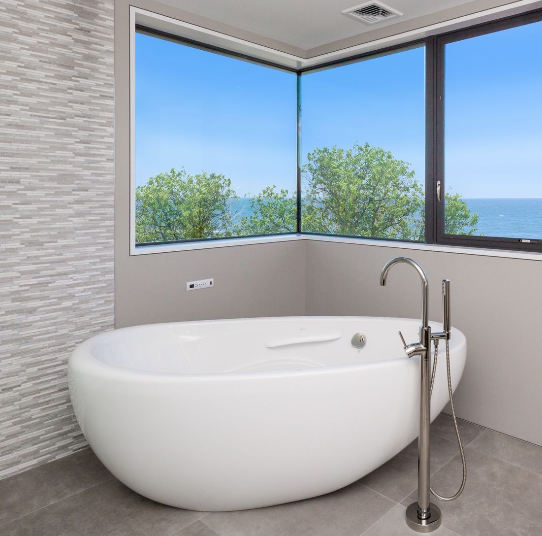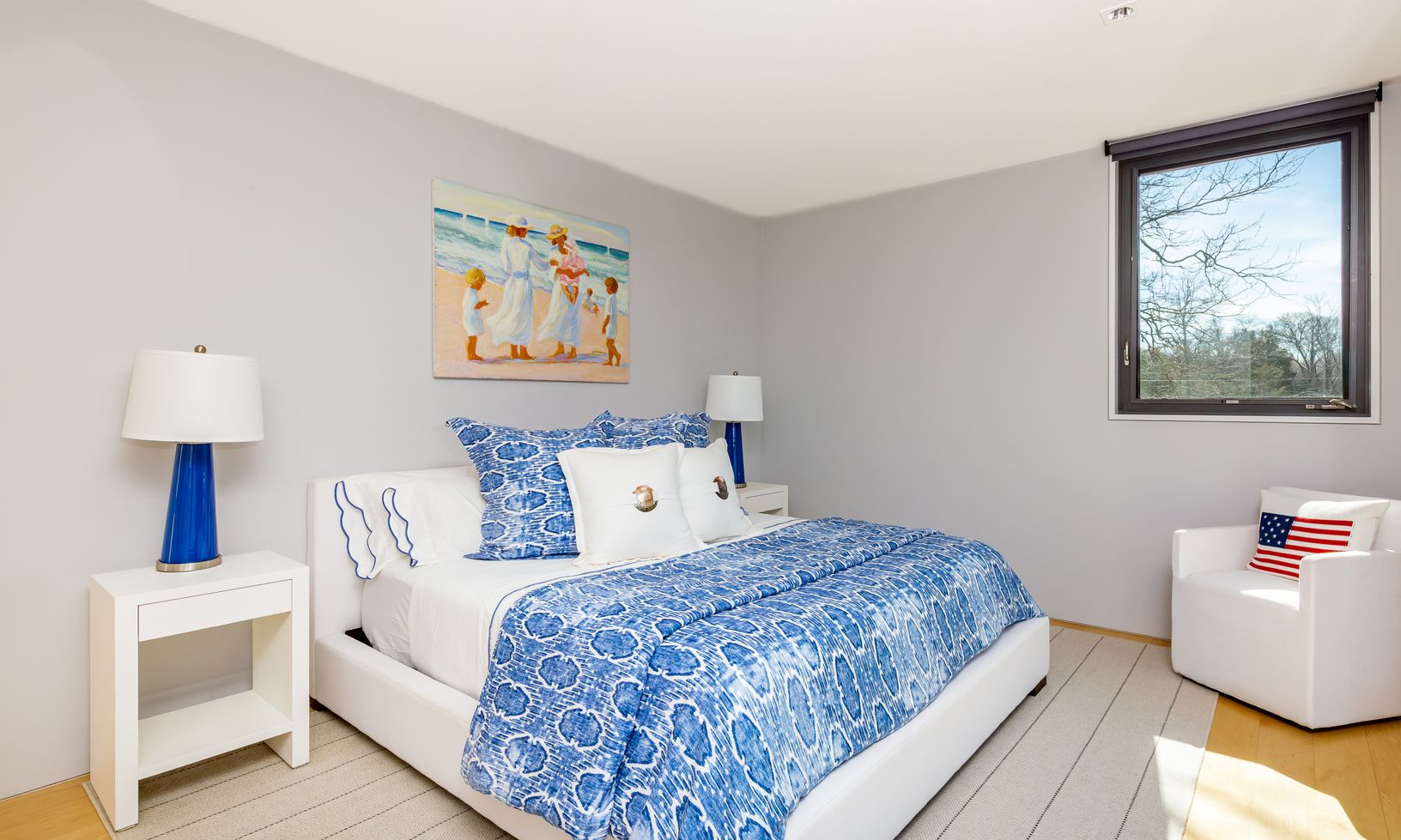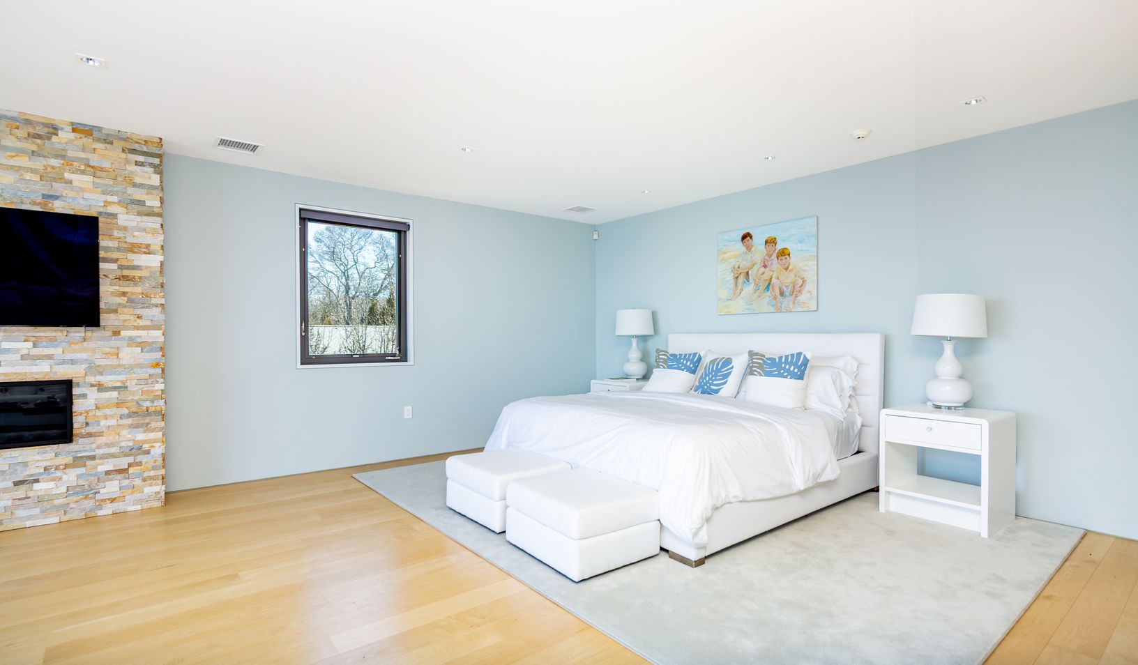 Escape to an ultra-private, newly and beautifully furnished beachfront retreat. This modern residence showcases sweeping open-bay vistas, walls of glass, and soaring double‑height ceilings that create a stunning sense of light and space. Outside, a secluded 20' x 40' heated gunite pool invites relaxed summer living, while a private staircase leads directly to the sandy beach below. The home offers four bright, spacious bedrooms-each with an en
